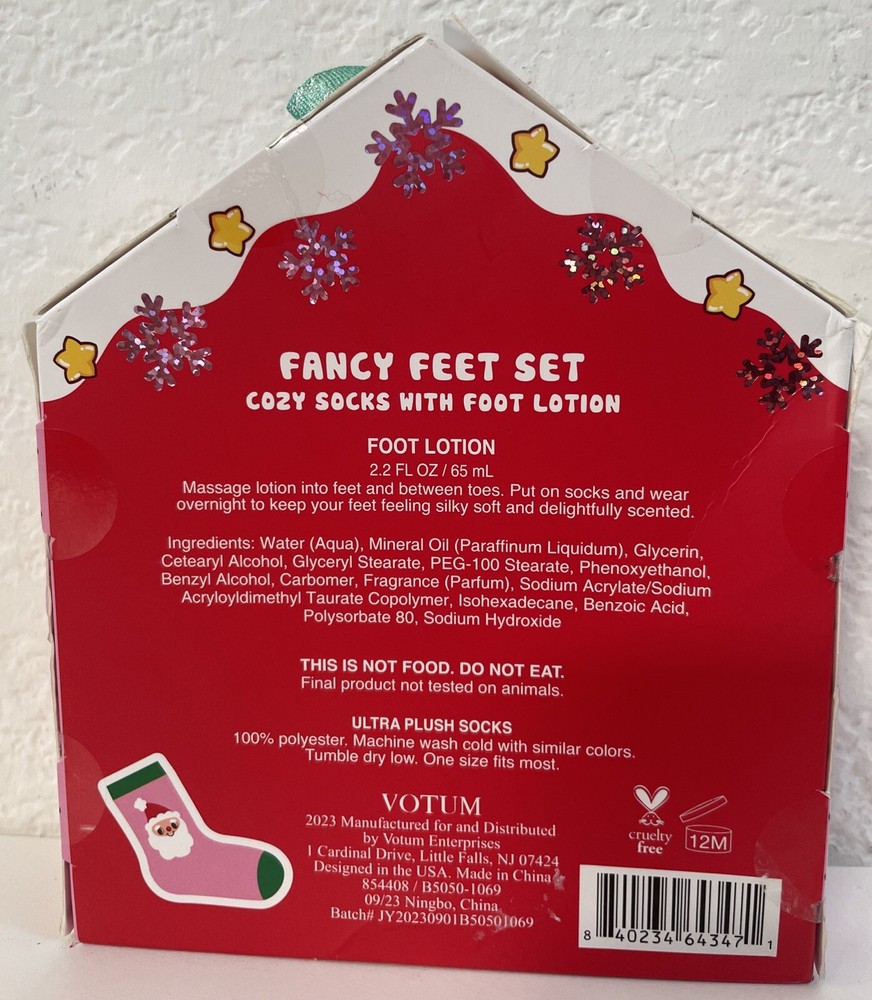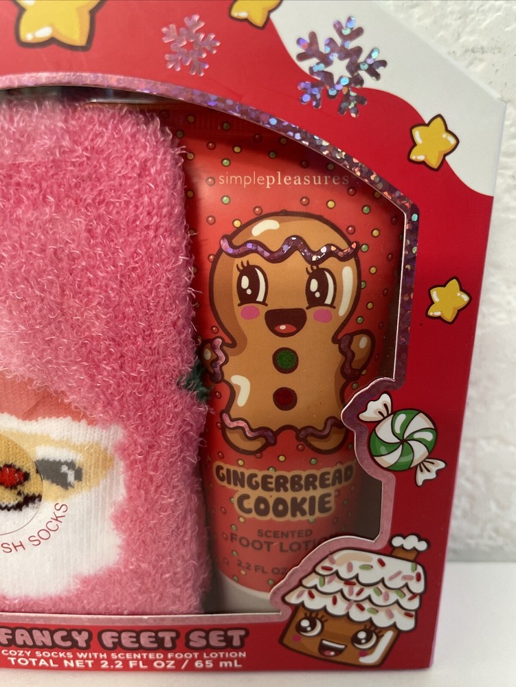 Simple Pleasures Gingerbread Cookie Fancy Feet Foot Lotion & Cozy Socks Set. Brand New and Sealed Fancy Feet Set with 2.2 oz Foot Lotion & a Pair of Cozy Socks w/Santa on them.