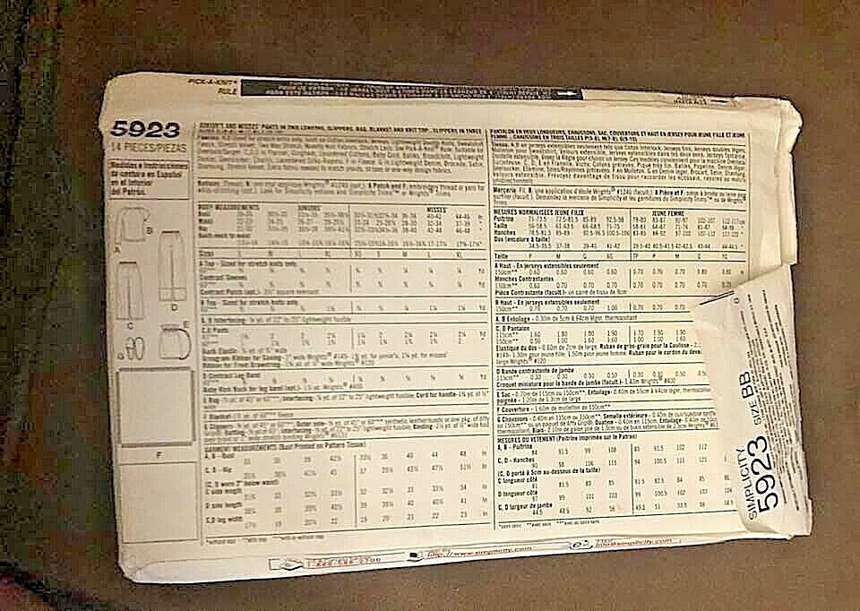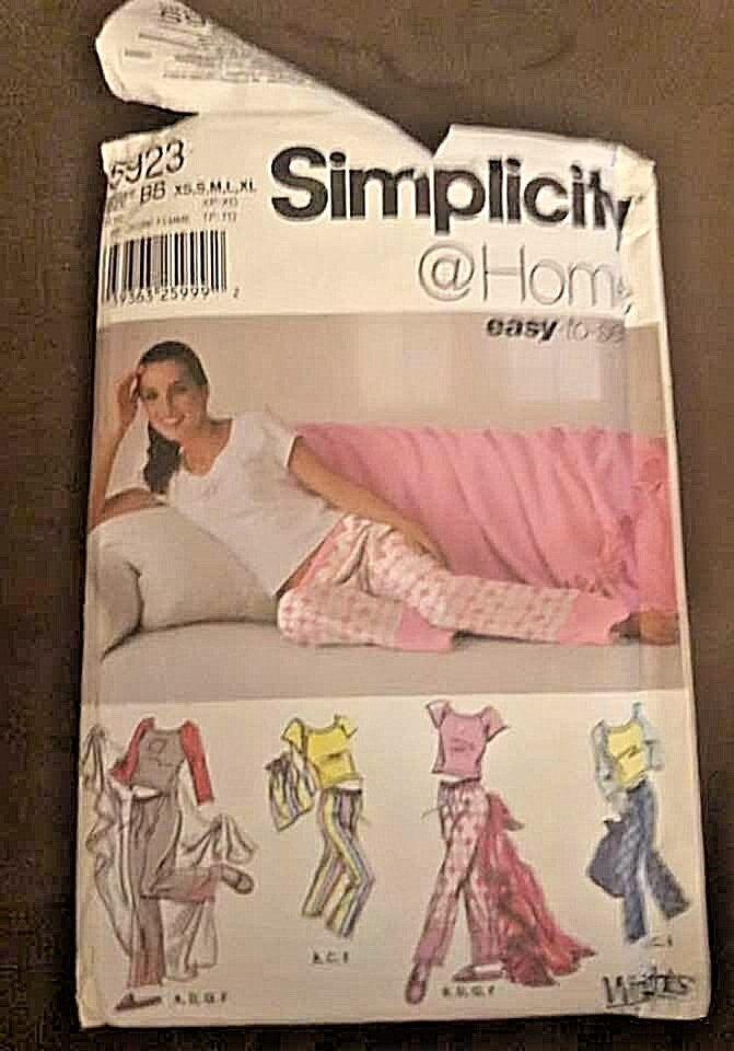 Simplicity 5923 Misses Pajamas Slippers Sewing Pattern Uncut Size XS-XL This is an original printed sewing pattern. It remains unused. Pants, Top, Slippers, Bag, & Blanket: Top has long or short sleeves, round neckline. Pants have elastic waist & hem variations. Slippers come in three sizes. Cozy comfortable lounge wear Size XS S M L XL Bust 30-46 Waist 23-39 Hips 32-48 Complete with all pieces and instructions. envelope has shelf wear flap is torn see photos SMOKE FREE HOME Check out my store for other treasures I combine shipping on all my listings when possible ,please ask for an invoice and shipping can be easily combined In my small efforts for a greener world I reuse shipping supplies, and recycle cardboard cereal boxes etc. Thanks so much for your and helping my small business PLEASE READ; Free returns are offered to you should I ship the wrong item, if the item was received by you damaged or if the description of such item is in gross error. Returning an item for any other reason will involve the buyer paying return shipping & Insurance if required, original postage is not refundable, and a 25% restocking fee of the actual cost of the item which the buyer paid. NO EXCEPTIONS!! Buyer's remorse is not a reason for a return!!!