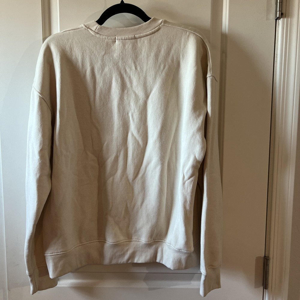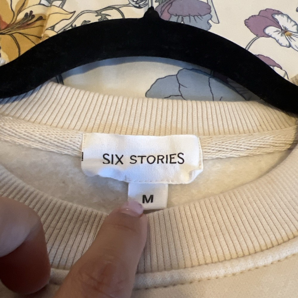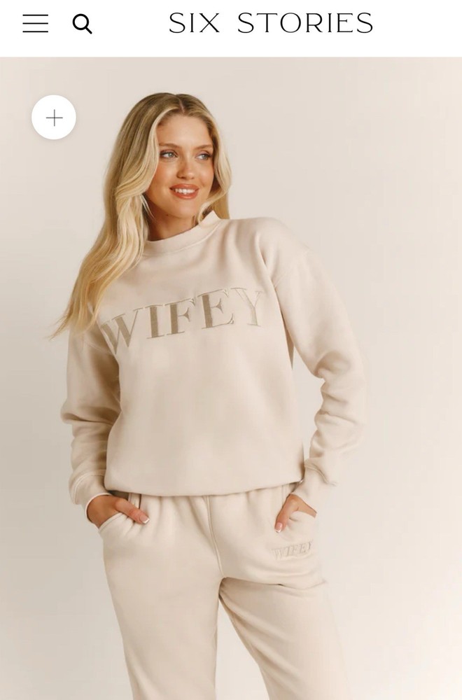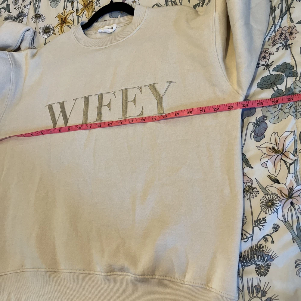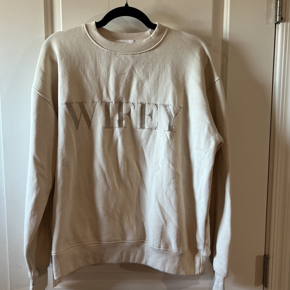 The Six Stories "Wifey" Sweatshirt in size M is a stylish and versatile addition to any woman's wardrobe. Made from a comfortable blend of polyester and cotton, this solid beige sweatshirt features long sleeves, a pullover closure, and an embroidered detail. Perfect for casual occasions or traveling, this sweatshirt is designed for regular fit with a crew neck neckline, making it suitable for all seasons including winter, fall, and spring. With its comfortable and cozy features, this sweatshirt from Six Stories is a must-have for any fashion-forward woman.