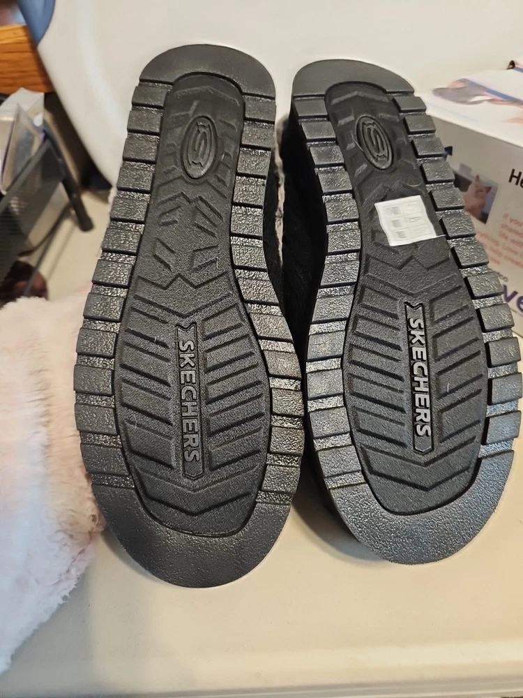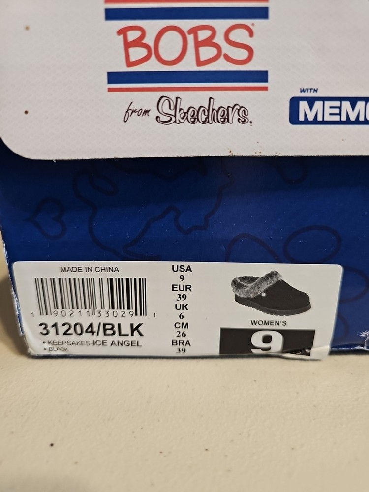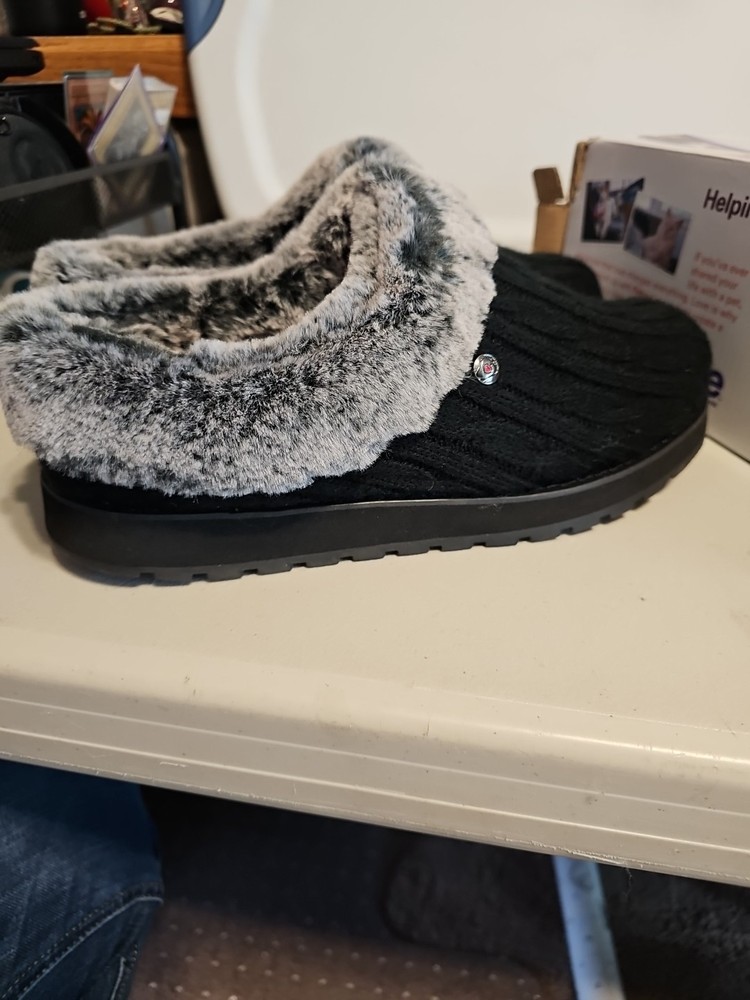 These Skechers Bobs Keepsakes Ice Angel slippers in size 9 feature a closed toe design with cozy faux-fur trim and lining. The black clog-style slippers have a soft sweater knit fabric upper, a 3/4 inch heel, and a flexible rubber indoor/outdoor traction outsole. They offer comfort with memory foam insoles and are suitable for winter, summer, and spring seasons.