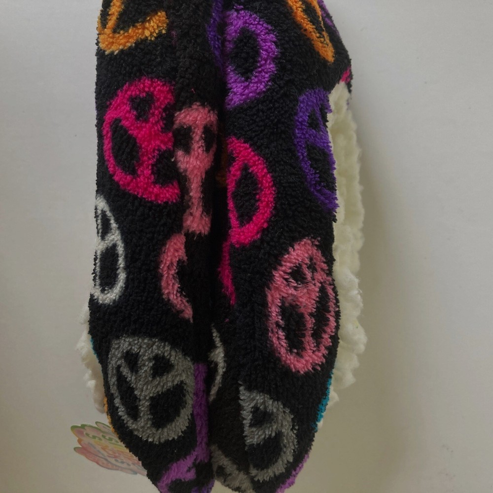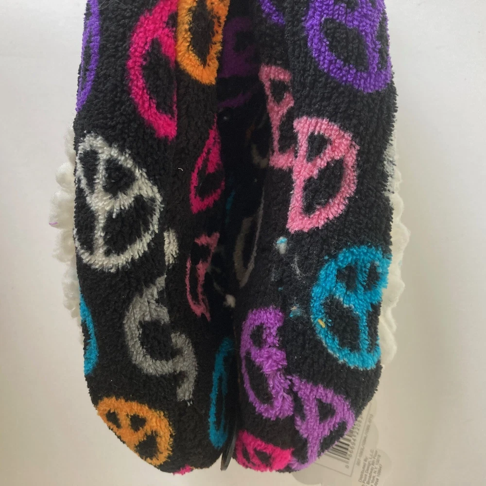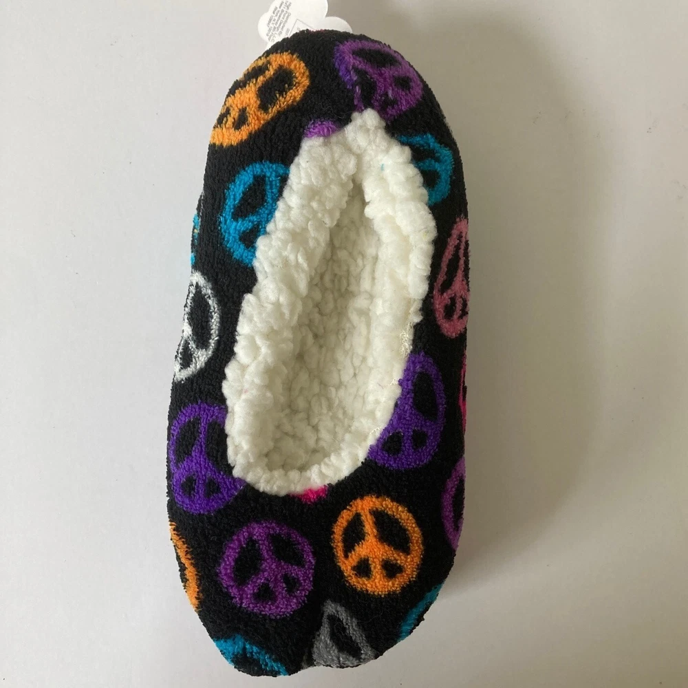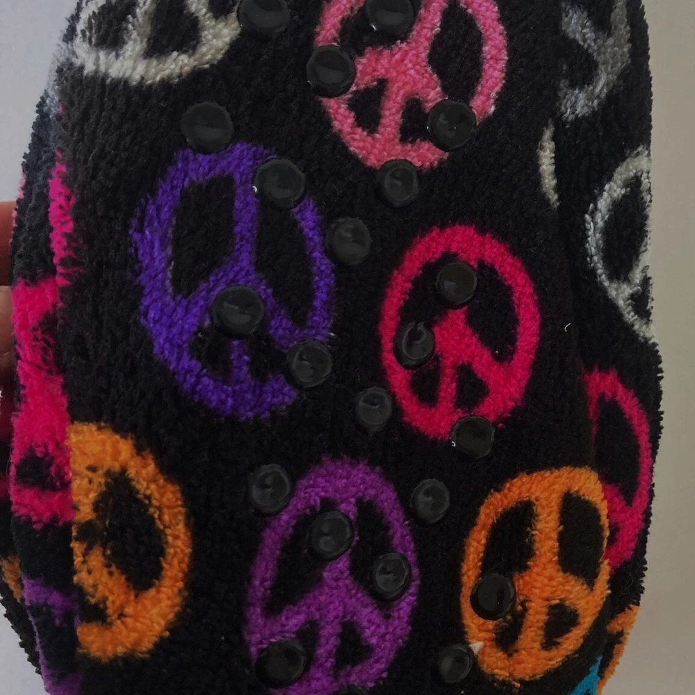 Peace Symbol Slipper Socks Size S/M All Over Print Grippers Cozy Comfort Warmth Size: S/M Ages: 8-13 Condition: Slippers are new with retail tag, no box. - Grippers on soles Thank you for your interest. T15, 189 CLOTHING AND FABRIC ITEMS: All clothing and fabric items have been steam cleaned and/or washed per eBay standards.