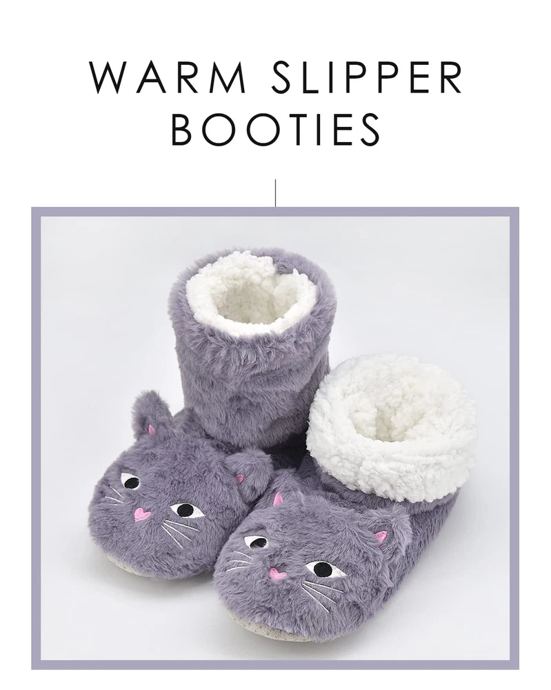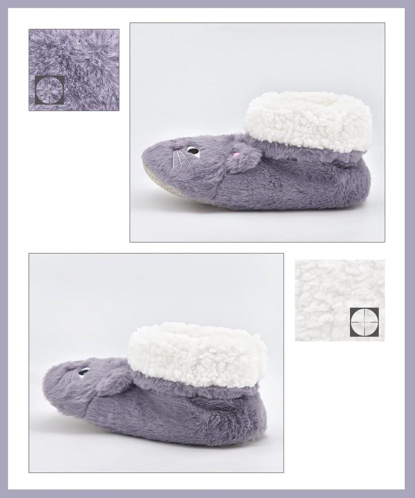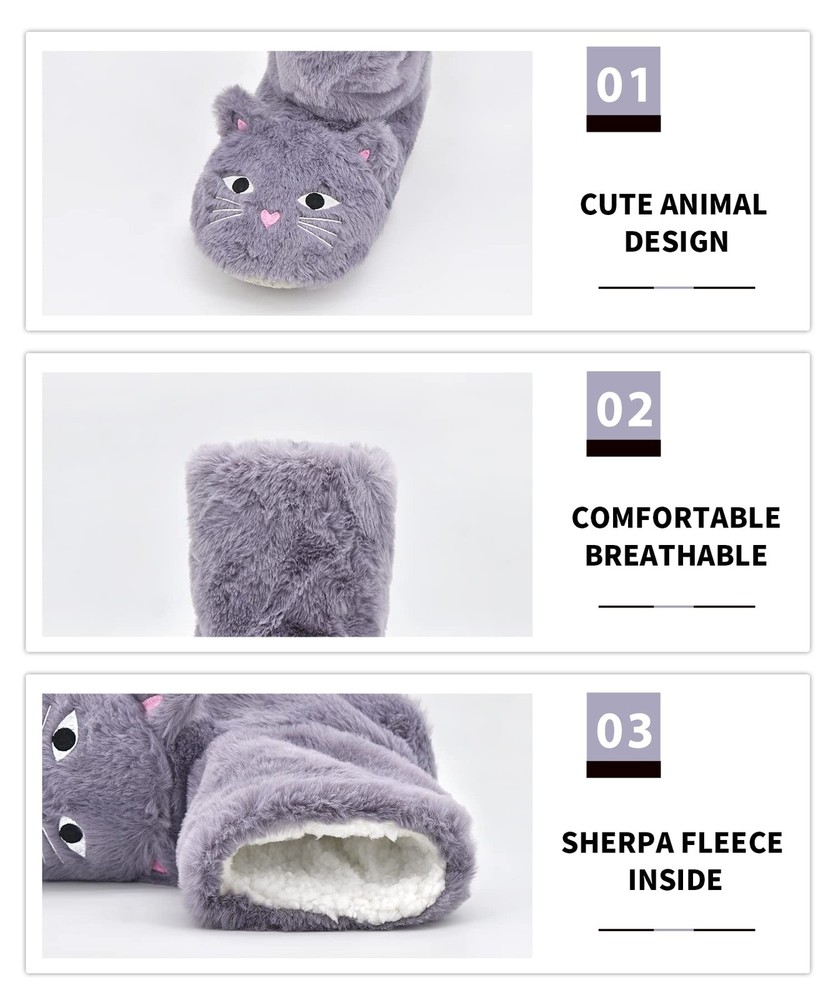Grippers SLIPPER SOCKS CONSTRUCTION 1.Designed to be a cross between a sock and a slipper for added warmth and comfort. 2.Fashionable and cute animal design. 3.Breathable polyester fabric and fuzzy lining keep your feet warm and comfortable on the floor in cold weather. 4.Thick and anti-skid bottom keep you safe by reducing the risk of falls. MULTI-USE 1.Slippers socks is a good travel companion. 2.After a long day of work,you can enjoy amazing comfort of these house slippers 3.The best choice if one's feet are swollen or painful. 4.Reduce the noise when you walk on the floor and no harm to the floor. 5.Suitable for cooler weather or perpetually cold toes. Perfect to be a gift giving to colleagues, friends and loved ones. ADDED DETAIL 1.Machine washable on cold or hand wash 2.Our size is True to US size. 1.【Cute Animal Design】Super cute animal design makes slippers look fashionable and lovely. We offer many styles, the unique style and cute pattern can be matched with any clothes you choose to wear everyday. These cozy bootie style slippers are great choice for winter slipper socks. 2.【Super Soft and Warm】The fluffy women slipper socks are very soft, warm, durable and cute. Thick and soft plush lining with cozy cushioned insole makes these fuzzy boots comfortable to wear, which will bring you extra comfort and warm in cold days. Extremely comfortable to wear all day! 3.【 Non-slip Boots Slippers】House slippers feature a durable, non-slip sole which helps keep your safe. Lightweight and anti-slip sole ensures that we can walk on the smooth floor without slipping, and will not damage your floor or make big noises,perfect for wearing around the house. 4.【 Fun and Comfy Indoor Slippers Boots】This thick lined slipper sock for women are cute and warm. These will be a good gift for friend and family on Birthday, Valentine's Day and Mother's Day. It is also nice dorm slippers, ideal for your children to take back to school. 5. 【Size & Care】We provide 2 sizes (sole length is important) for you to choose. However, when you select the size, please don’t forget thinking about the thick lining. Please do not iron them and suggesting wash them in cold water. Great quality socks require the proper care!