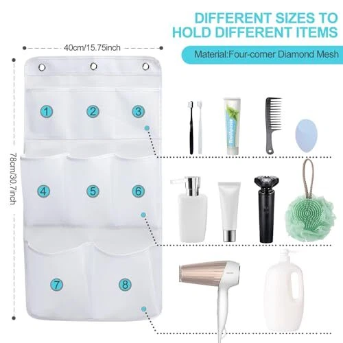 Return Policy Fast Delivery Trusted seller 1 Pack Small Travel Shower Caddy Organizer Hanging Over Door,Portable Quick Drying Mesh Shower Storage Bag for College Dorm,Gym,RV Camper Bathroom,Cruise Ship,8 Pockets to Hold Shampoo,Soap(White) Product Description 【Portable and Foldable】Mesh Shower Organizer made of premium four-corner diamond mesh,which is soft and foldable.You can put into your backpack and does not take up space. 8 pockets can keep your travel supplies.such as comb,toothbrush,toothpaste, razor,body wash, shampoo, conditioner, and other personal care products. 【Easy to Use】Hanging shower organizer have three rust proof metal hooks,so you can easily hang it on a bathroom rod. 【Compact Travel Essentials】Light weight and compact size makes the portable hanging shower caddy can be packing in your luggage and do not make up the space.Ideal for traveling, cruise Ship and hotel. 【Two kinds Sizes】 Bathroom shower organizer have two kinds of pockets, little pockets can place comb,toothbrush,toothpaste, razor.Large pockets can place body wash, conditioner, shampoo. 【Fast Drying Mesh】 Foldable Shower Organizer made of premium four-corner diamond mesh,which can be quickly dry after using it. Shipping Returns Payment Shipping Shipping is FREE to all addresses other than APO/PO boxes in the lower 48 states. All our stock ships from US-based warehouses. Shipped via USPS or UPS (depending on location and package weight) Unless stated otherwise, all orders will ship within 24-72 hours of your payment being processed. Check our feedback to see the great reviews of FAST shipping we offer. Returns Seller does not accept returns Payment We currently accept payment via eBay managed payments only. Once payment is cleared, we will dispatch your shipment within 1-3 business days. Please refer to the "Shipping" tab for more information regarding shipping speed to your destination.