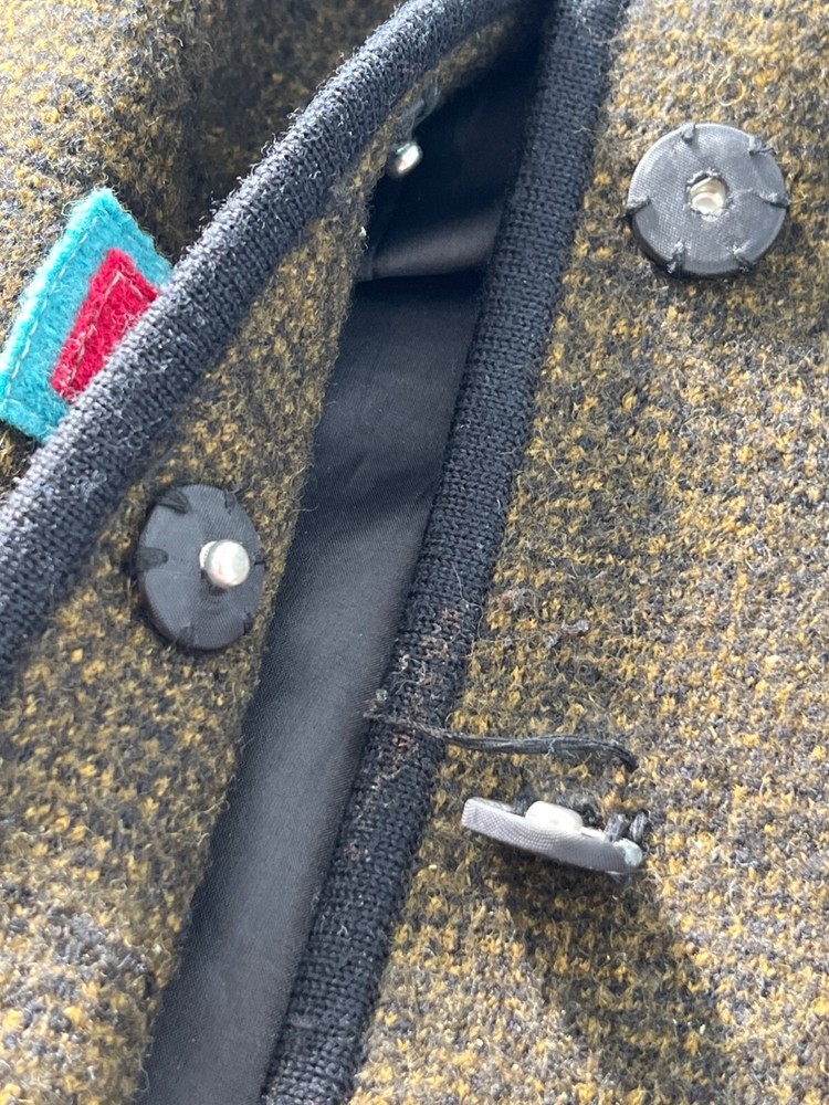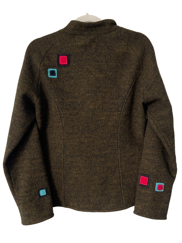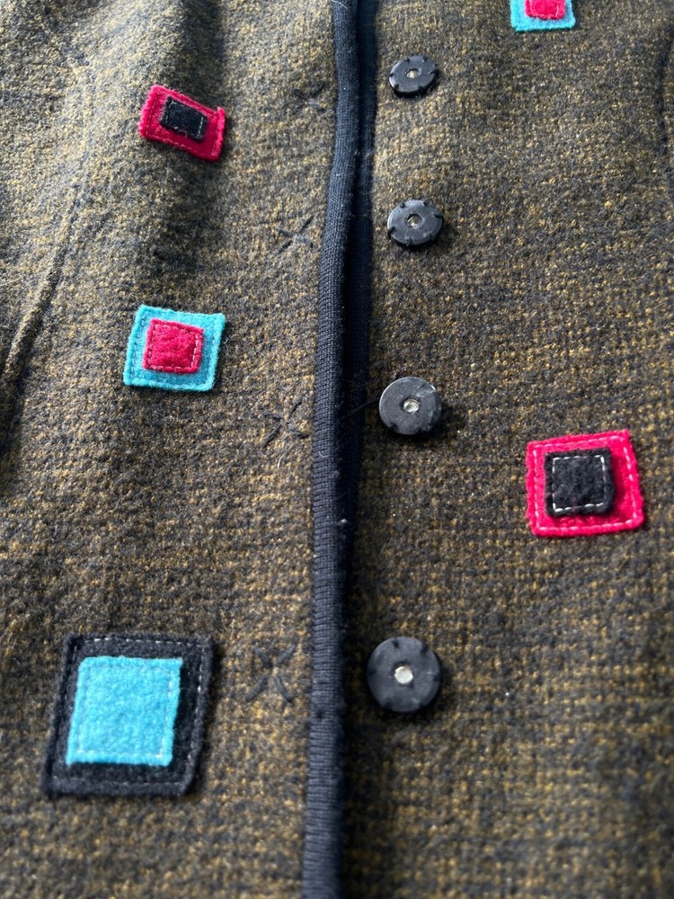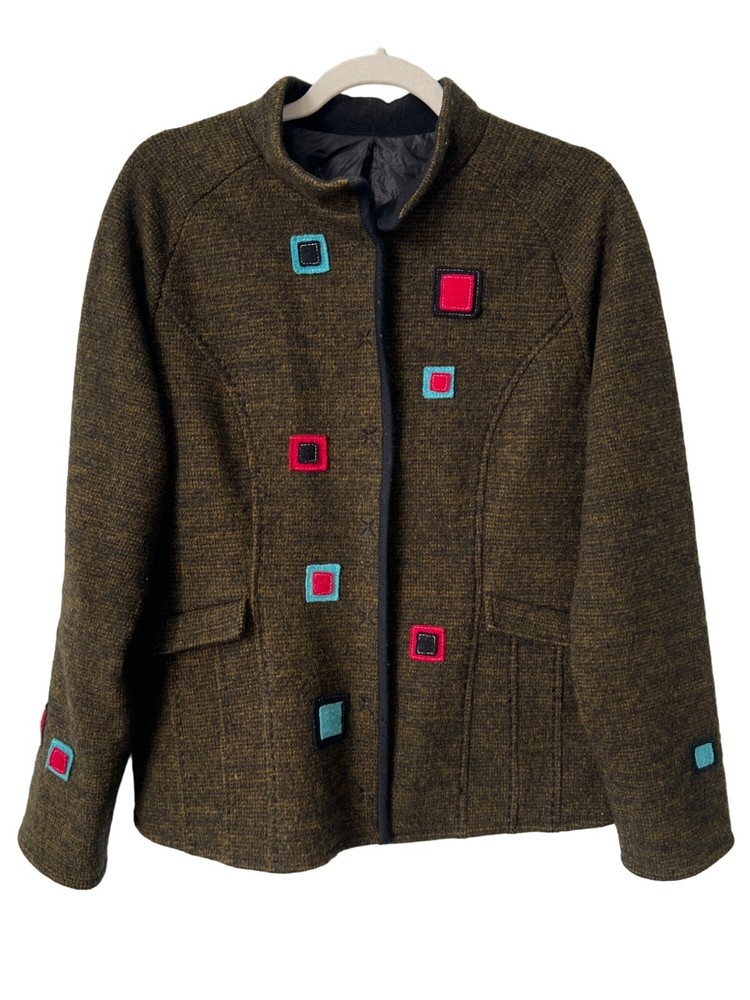 Snap Front Jacket Womens Long Sleeve Colorful Square Cozy Retro Downtown This wool blend jacket exudes a touch of artsy fun with its colorful square accents. The button closure and tailored fit offer warmth and style, suitable for cooler seasons. • Wool blend material • Colorful square accents • Snap button front closure • Long sleeves • Mock neck Loose threads around button, but fully functional. Chest = 20.5 in Length = 25 in vintage jacket casual classic comfortable relaxed fall winter warm knit cozy comfy loungewear everyday closet staple mod downtown old money essentials daily