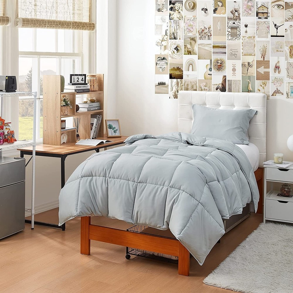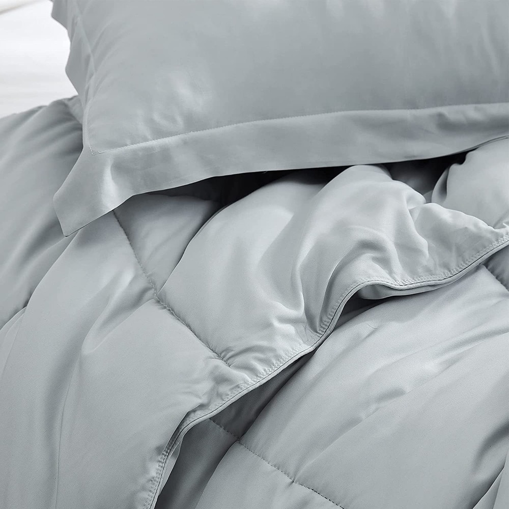 Inspired by snoring at a level that gets you kicked, punched, and pushed off of the bed by your partner. Snorze® represents the act of snoring at levels that begs the question "Are you okay?" or "You sound like you can't breathe". Now, the only way to achieve sleep that feels so good that you forget to breathe is by sleeping with a comforter that's on a different level. Enter, Snorze® Cloud Comforters, a Coma Inducer® line made of intensely soft, puffy, and fluffy cloud-like filling that transforms your bed into a dreamlike place full of snores. With a soothing 230 TC Rayon made from Bamboo Fabric exterior and a best-in-class down alternative 420 GSM filling, you have a comforter that somehow combines a lightweight feeling with cozy comfort. Usable all year round, but ideal for summer and Free Shipping Over $49.99* Details Snorze® Cloud Comforter Set - Coma Inducer® Ultra Cozy - Glacier Gray Product Description: Inspired by snoring at a level that gets you kicked, punched, and pushed off of the bed by your partner. Snorze® represents the act of snoring at levels that begs the question "Are you okay?" or "You sound like you can't breathe". Now, the only way to achieve sleep that feels so good that you forget to breathe is by sleeping with a comforter that's on a different level. Enter, Snorze® Cloud Comforters, a Coma Inducer® line made of intensely soft, puffy, and fluffy cloud-like filling that transforms your bed into a dreamlike place full of snores. With a soothing 230 TC Rayon made from Bamboo Fabric exterior and a best-in-class down alternative 420 GSM filling, you have a comforter that somehow combines a lightweight feeling with cozy comfort. Usable all year round, but ideal for summer and warm sleepers. Warning May cause deep sleep and intensely loud snores. To avoid pillow suffocation by your partner, kindly provide them with the included ear plugs. Good sleep was never so dangerous! Features: MaterialSmooth, Lightweight 230TC Rayon made from Bamboo Fabric in Glacier Gray for a cooling feel ConstructionUltra Fluffy - Cloudlike 420GSM Down Alternative Fill - Overly thick yet airy for Seasonal / Summer use Important InformationCreated for warm sleepers or warmer climates - designed for those who want the Coma Inducer® plushness without the heat Care InstructionsMachine Washable - Gentle Cycle / Cold Wash Elevate your bedroom decor with our Glacier Gray Snorze® Cloud Comforter - Coma Inducer® Ultra Cozy Bamboo - Oversized Bedding. This beautiful Twin XL, Queen, or King bedding set isn't just your average comforter; with luxurious oversized bedding dimensions and premium bedding materials, this designer Twin XL, Queen, or King oversized bedding set will give your mattress the royal treatment it deserves. And with a sleek light gray color, this comforter embodies elegance and sophistication, making it a standout addition to any bedroom decor! But this extra large Twin XL, Queen, or King bamboo comforter set does not only look fabulous in your bedroom interior design, but it's also crafted from breathable bamboo fabric for a cloud-like touch that is perfect for those warm nights or hot sleepers. And with a fluffy 420 GSM down alternative inner filling, it will feel like youre being hugged by a marshmallow when youre snuggled up under this bamboo comforter set. Once you experience the heavenly softness and plushness of this extra large Twin XL, Queen, or King breathable comforter set, you'll wonder how you ever slept without it! Dimensions: Twin XLComforter - 68"W x 90"L, (1) Standard Sham20"W x 26"L x 2" Flange QueenComforter - 94"W x 98"L, (2) Standard Shams20"W x 26"L x 2" Flange KingComforter - 112"W x 98"L, (2) King Shams20"W x 36"L x 2" Flange