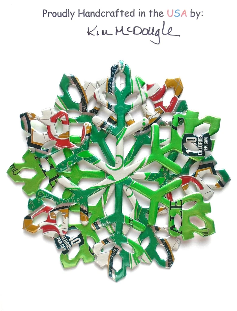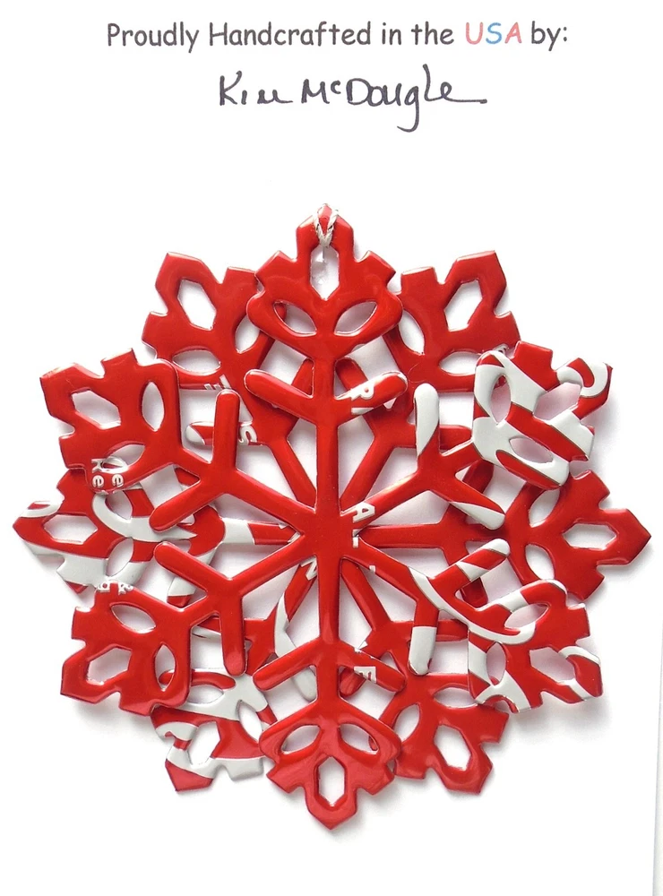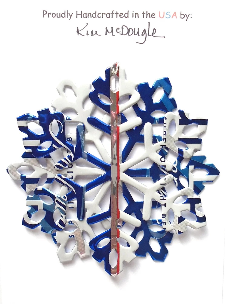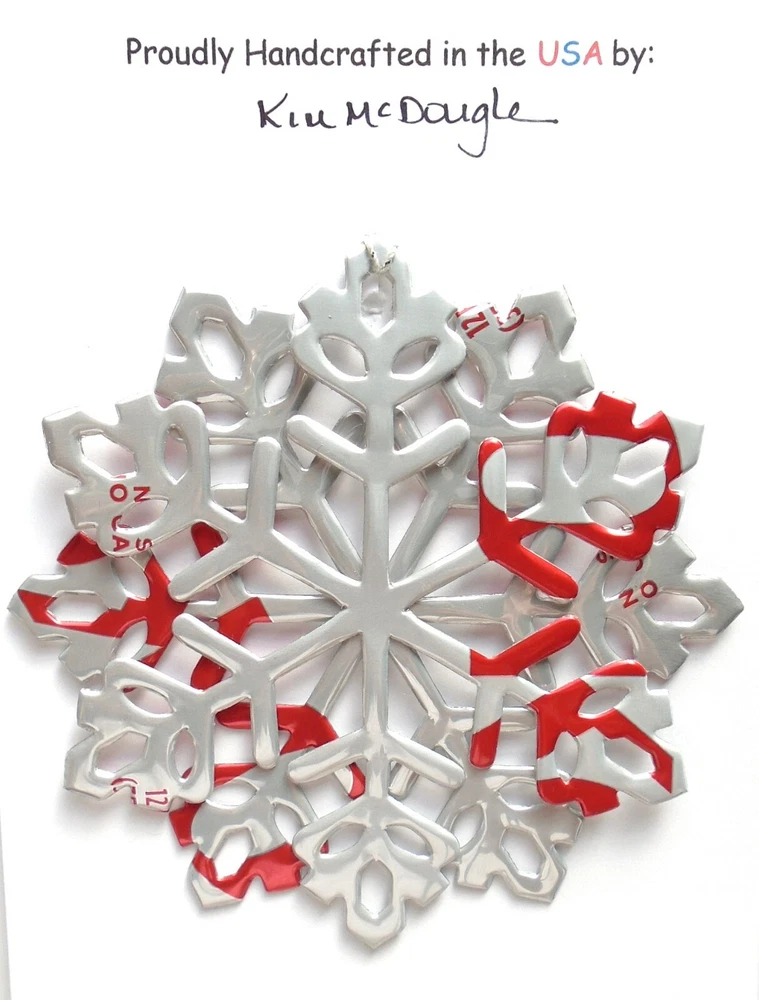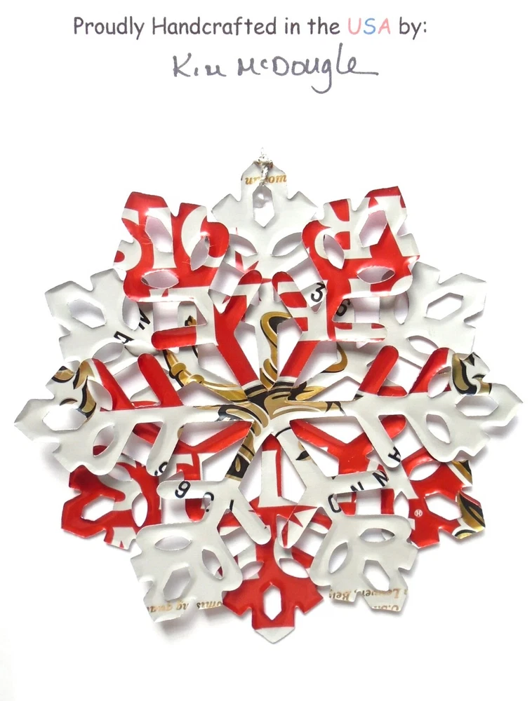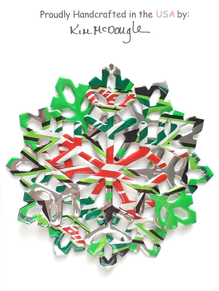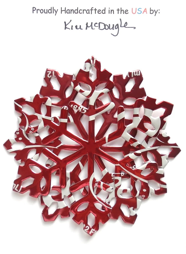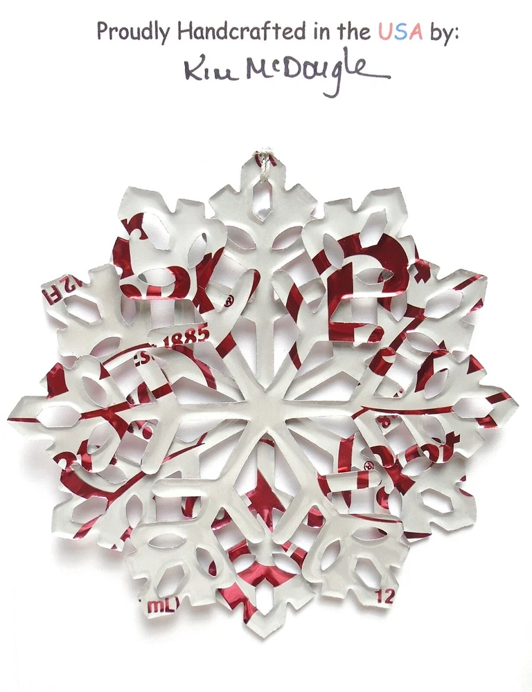 One handmade, die-cut, layered snowflake Christmas ornament made with four recycled aluminum beverage cans. Please make your can type selection(s) from the drop-down menu above. This ornament has been crafted by adhering two recycled aluminum cans together before the snowflake ornament is cut. This process is then repeated to make another snowflake ornament. The two single snowflake ornaments are then glued together at the center to create a layered snowflake ornament. The finished result is the double-sided ornament showing the colored branded side of the can on both the front and back of the ornament. This ornament is approximately 4 inches in diameter and has an attached string for hanging. The ornament is nicely mounted on a 4 1/2 " X 6 1/2" card signed by the artisan crafter. The ornament pictured in the drop-down menu selection is the ornament that you will be buying. · The ornament is made with a recycled/upcycled can and has small scratches and/or dents that are visible. · The ornament is thin, lightweight, delicate, and bendable. It does not have any backing added. · The ornament is intended for decorative and adult use only. Handle ornament with the attached string, edges may be sharp. Please visit my eBay Store to view all my current recycled can ornament listings. Shipping through the USPS with tracking will cost $4.35 for the first ornament or set and FREE for each additional ornament or set for orders of one to five ornaments or sets. Shipping through the USPS with tracking is FREE for orders of six or more ornaments or sets. Please add ornaments to the shopping cart for the shipping discounts to be applied to your order. My business and the ornaments that I make are not affiliated with or endorsed by the trademarked company.