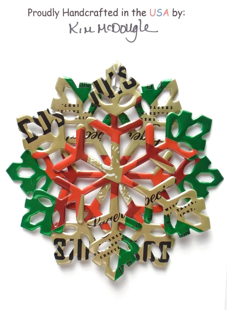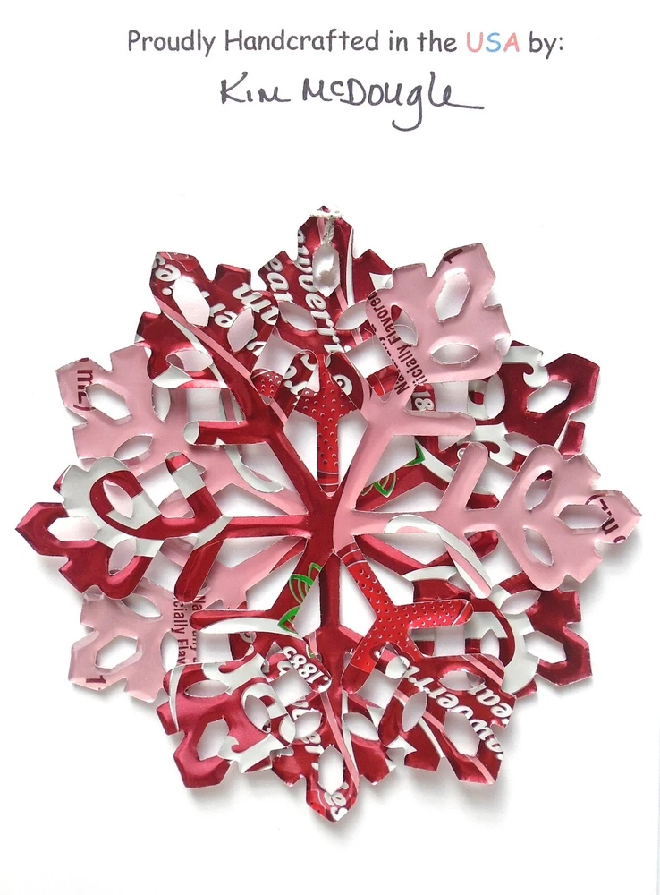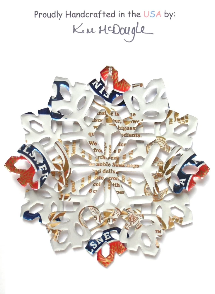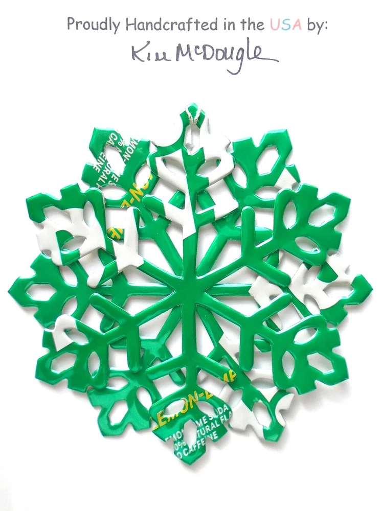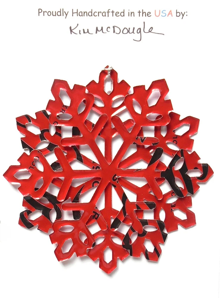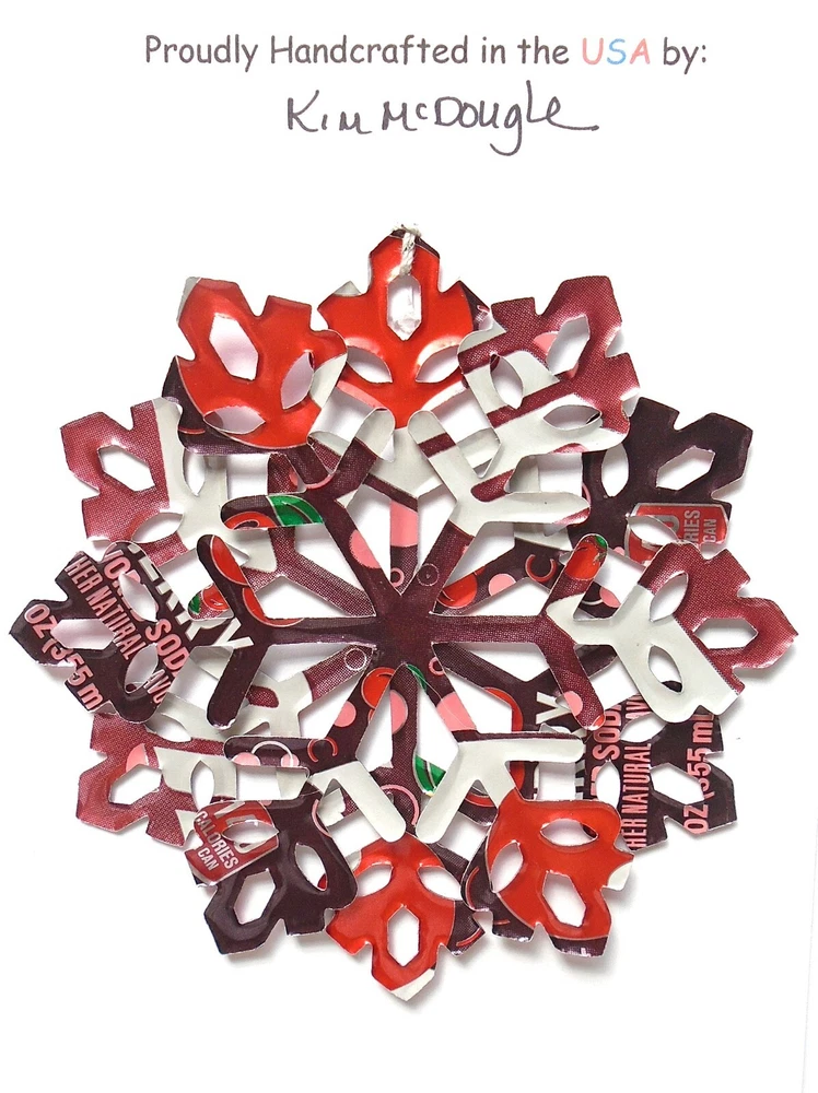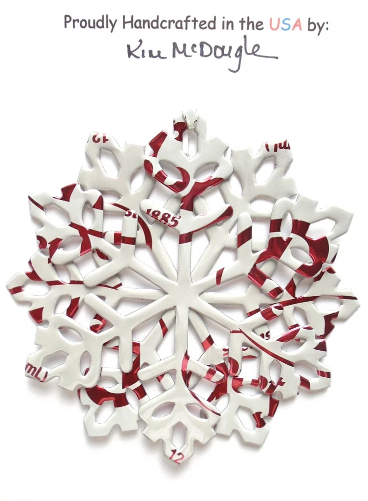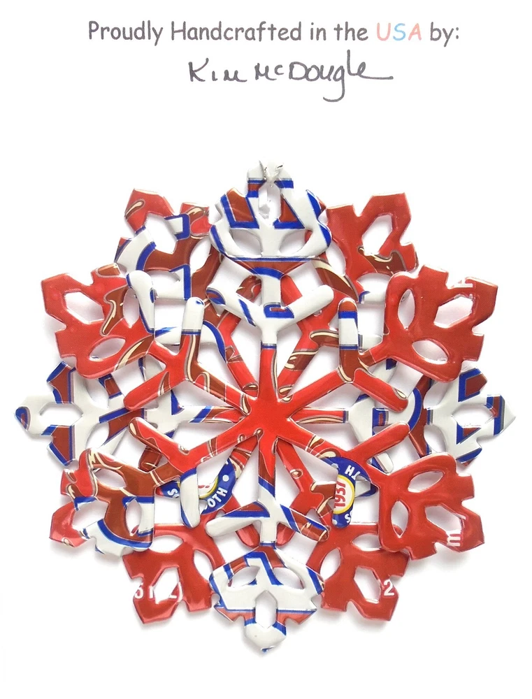 One handmade, die-cut, layered snowflake Christmas ornament made with four recycled aluminum beverage cans. Please make your can type selection(s) from the drop-down menu above. This ornament has been crafted by adhering two recycled aluminum cans together before the snowflake ornament is cut. This process is then repeated to make another snowflake ornament. The two single snowflake ornaments are then glued together at the center to create a layered snowflake ornament. The finished result is the double-sided ornament showing the colored branded side of the can on both the front and back of the ornament. This ornament is approximately 4 inches in diameter and has an attached string for hanging. The ornament is nicely mounted on a 4 1/2 " X 6 1/2" card signed by the artisan crafter. The ornament pictured in the drop-down menu selection is the ornament that you will be buying. · The ornament is made with a recycled/upcycled can and has small scratches and/or dents that are visible. · The ornament is thin, lightweight, delicate, and bendable. It does not have any backing added. · The ornament is intended for decorative and adult use only. Handle ornament with the attached string, edges may be sharp. Please visit my eBay Store to view all my current recycled can ornament listings. Shipping through the USPS with tracking will cost $4.35 for the first ornament or set and FREE for each additional ornament or set for orders of one to five ornaments or sets. Shipping through the USPS with tracking is FREE for orders of six or more ornaments or sets. Please add ornaments to the shopping cart for the shipping discounts to be applied to your order. My business and the ornaments that I make are not affiliated with or endorsed by the trademarked company.