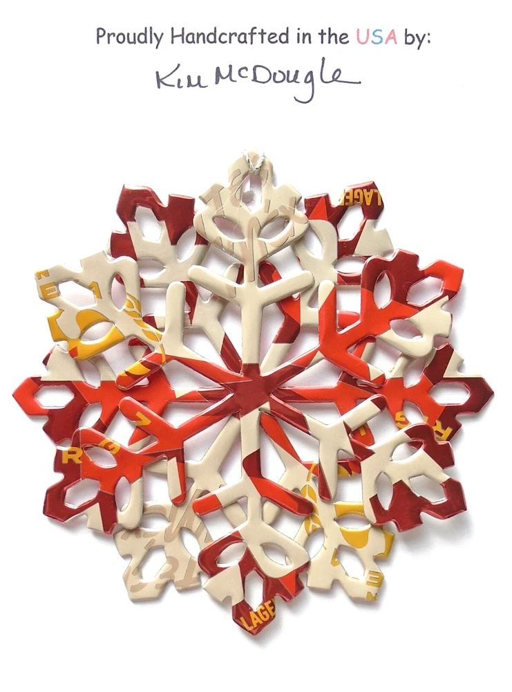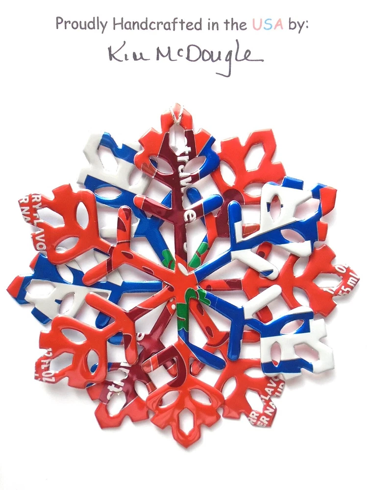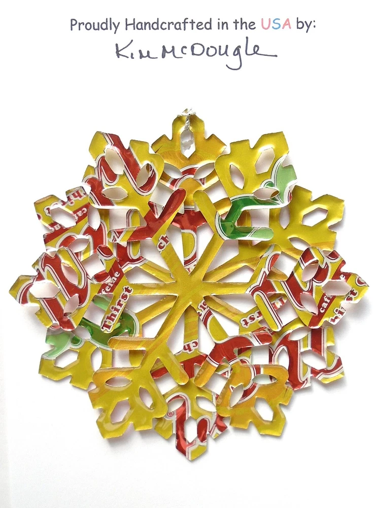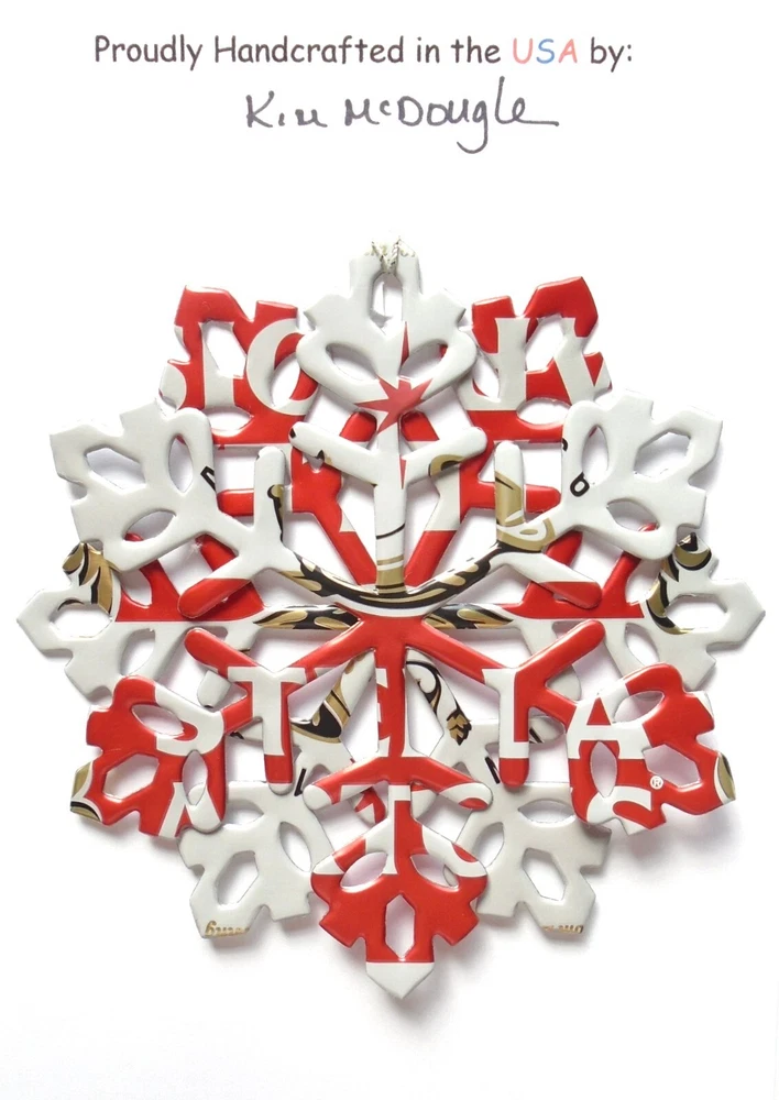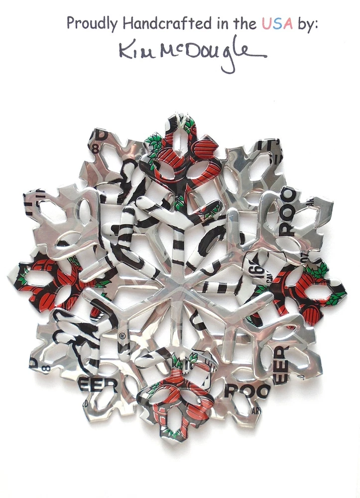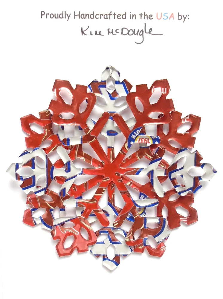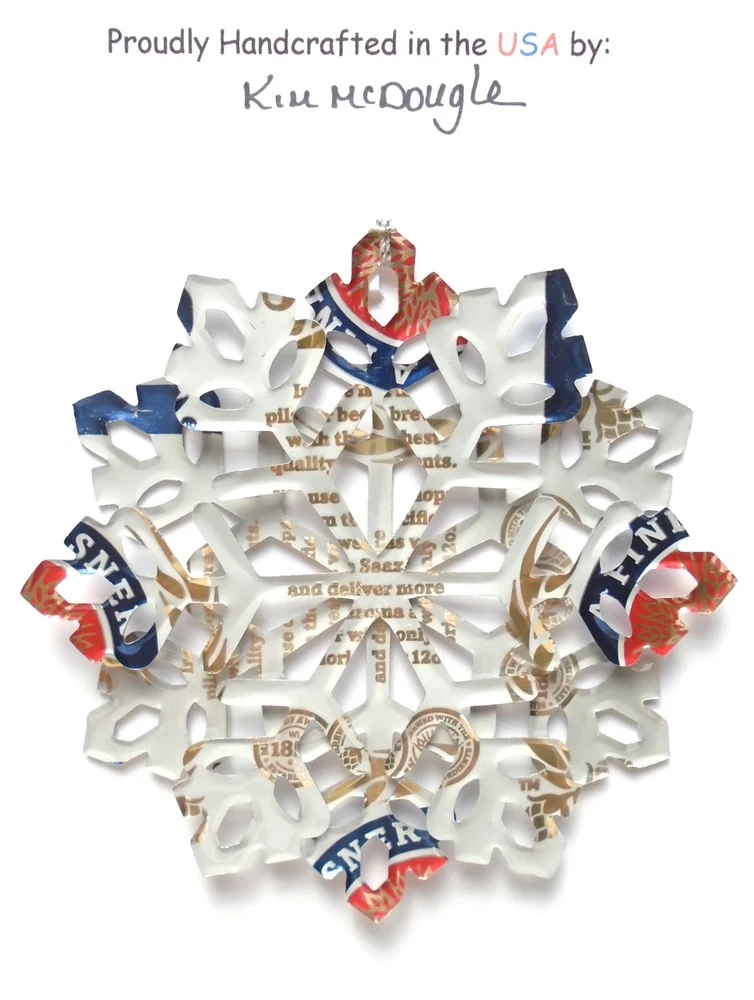 One handmade, die-cut, layered snowflake Christmas ornament made with four recycled aluminum beverage cans. Please make your can type selection(s) from the drop-down menu above. This ornament has been crafted by adhering two recycled aluminum cans together before the snowflake ornament is cut. This process is then repeated to make another snowflake ornament. The two single snowflake ornaments are then glued together at the center to create a layered snowflake ornament. The finished result is the double-sided ornament showing the colored branded side of the can on both the front and back of the ornament. This ornament is approximately 4 inches in diameter and has an attached string for hanging. The ornament is nicely mounted on a 4 1/2 " X 6 1/2" card signed by the artisan crafter. The ornament pictured in the drop-down menu selection is the ornament that you will be buying. · The ornament is made with a recycled/upcycled can and has small scratches and/or dents that are visible. · The ornament is thin, lightweight, delicate, and bendable. It does not have any backing added. · The ornament is intended for decorative and adult use only. Handle ornament with the attached string, edges may be sharp. Please visit my eBay Store to view all my current recycled can ornament listings. Shipping through the USPS with tracking will cost $4.35 for the first ornament or set and FREE for each additional ornament or set for orders of one to five ornaments or sets. Shipping through the USPS with tracking is FREE for orders of six or more ornaments or sets. Please add ornaments to the shopping cart for the shipping discounts to be applied to your order. My business and the ornaments that I make are not affiliated with or endorsed by the trademarked company.