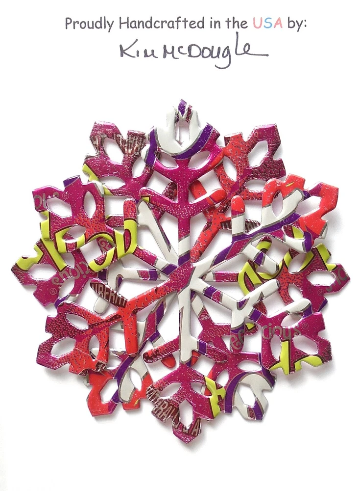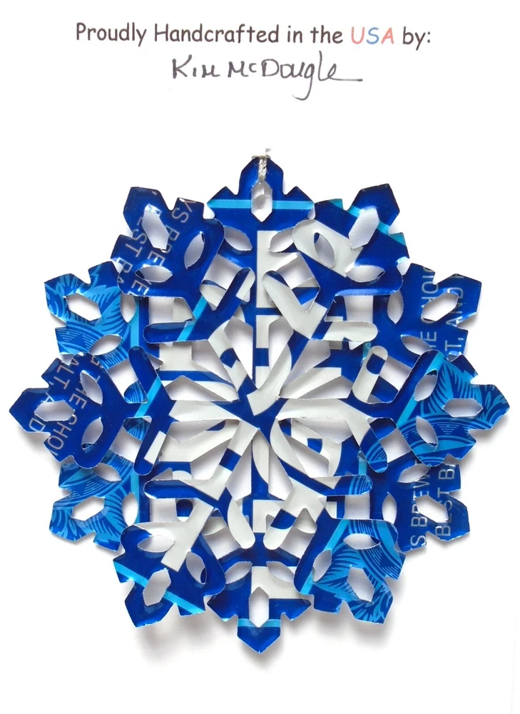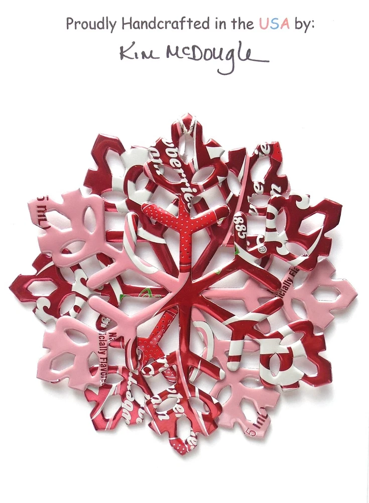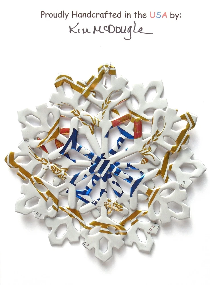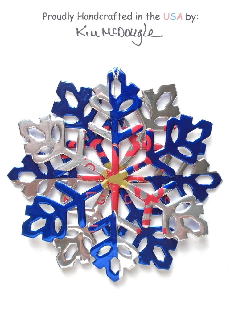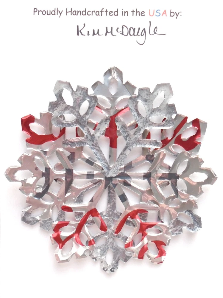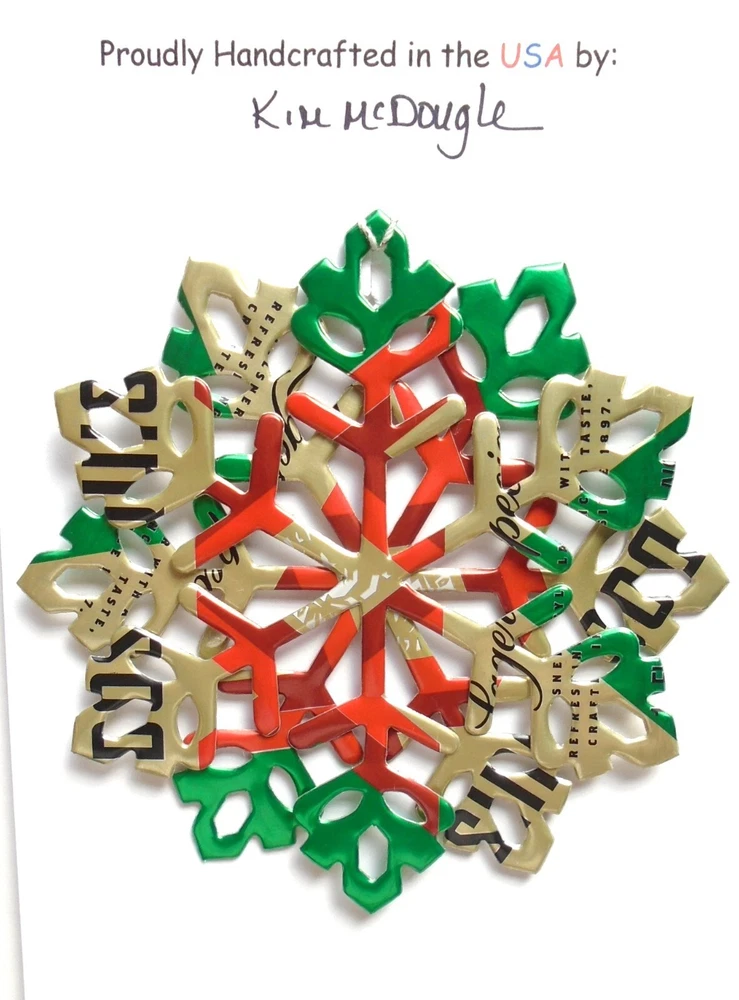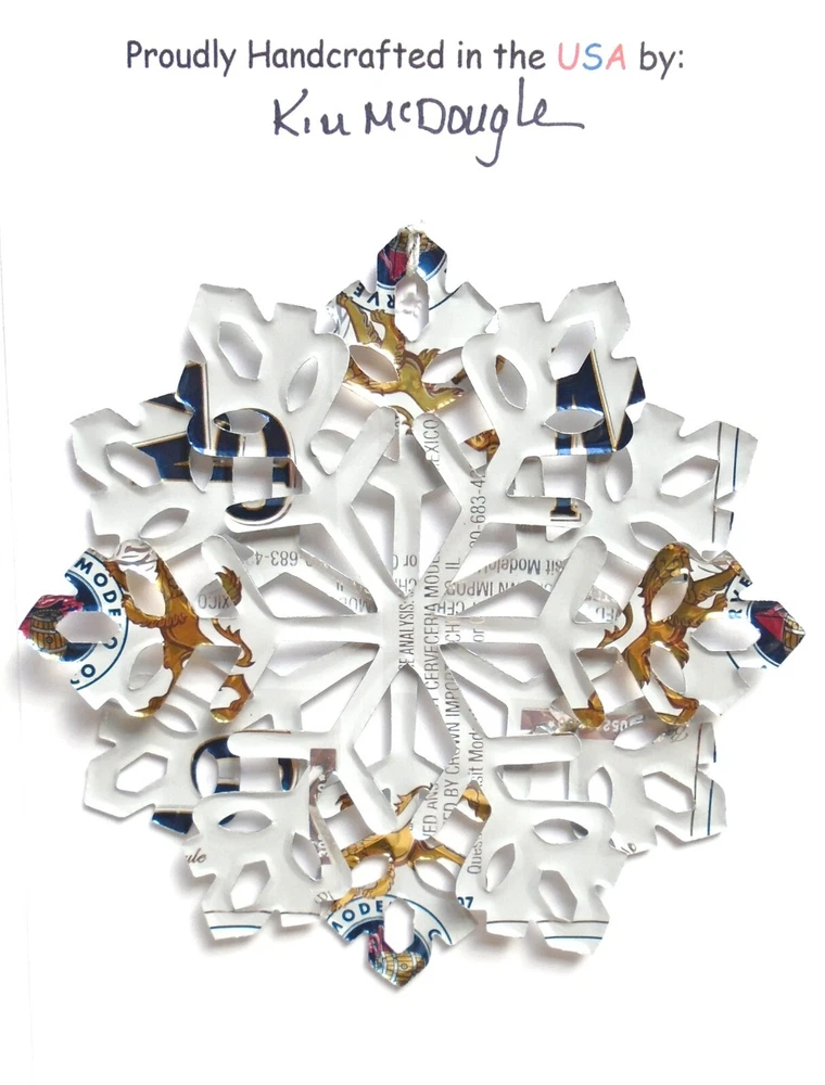 One handmade, die-cut, layered snowflake Christmas ornament made with four recycled aluminum beverage cans. Please make your can type selection(s) from the drop-down menu above. This ornament has been crafted by adhering two recycled aluminum cans together before the snowflake ornament is cut. This process is then repeated to make another snowflake ornament. The two single snowflake ornaments are then glued together at the center to create a layered snowflake ornament. The finished result is the double-sided ornament showing the colored branded side of the can on both the front and back of the ornament. This ornament is approximately 4 inches in diameter and has an attached string for hanging. The ornament is nicely mounted on a 4 1/2 " X 6 1/2" card signed by the artisan crafter. The ornament pictured in the drop-down menu selection is the ornament that you will be buying. · The ornament is made with a recycled/upcycled can and has small scratches and/or dents that are visible. · The ornament is thin, lightweight, delicate, and bendable. It does not have any backing added. · The ornament is intended for decorative and adult use only. Handle ornament with the attached string, edges may be sharp. Please visit my eBay Store to view all my current recycled can ornament listings. Shipping through the USPS with tracking will cost $4.35 for the first ornament or set and FREE for each additional ornament or set for orders of one to five ornaments or sets. Shipping through the USPS with tracking is FREE for orders of six or more ornaments or sets. Please add ornaments to the shopping cart for the shipping discounts to be applied to your order. My business and the ornaments that I make are not affiliated with or endorsed by the trademarked company.