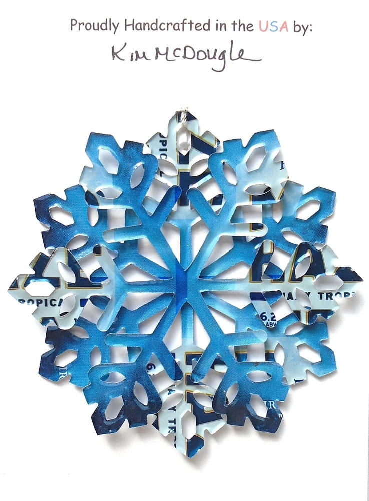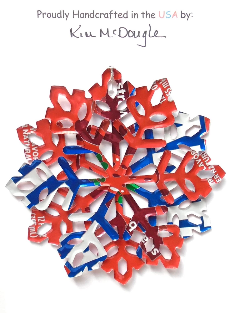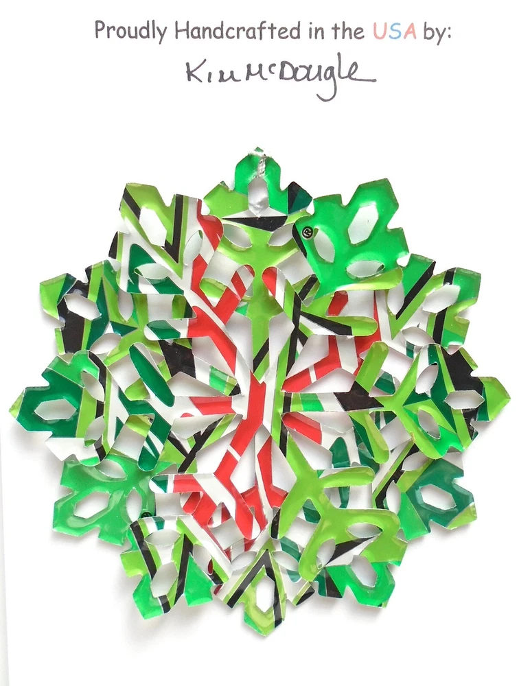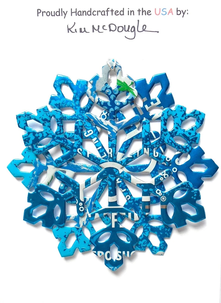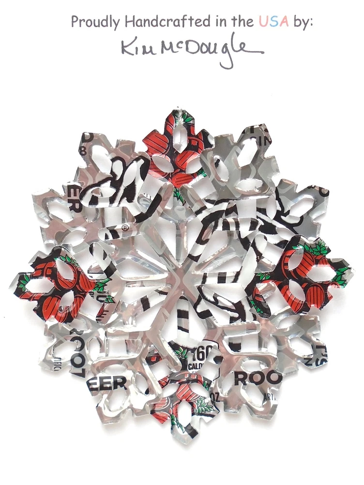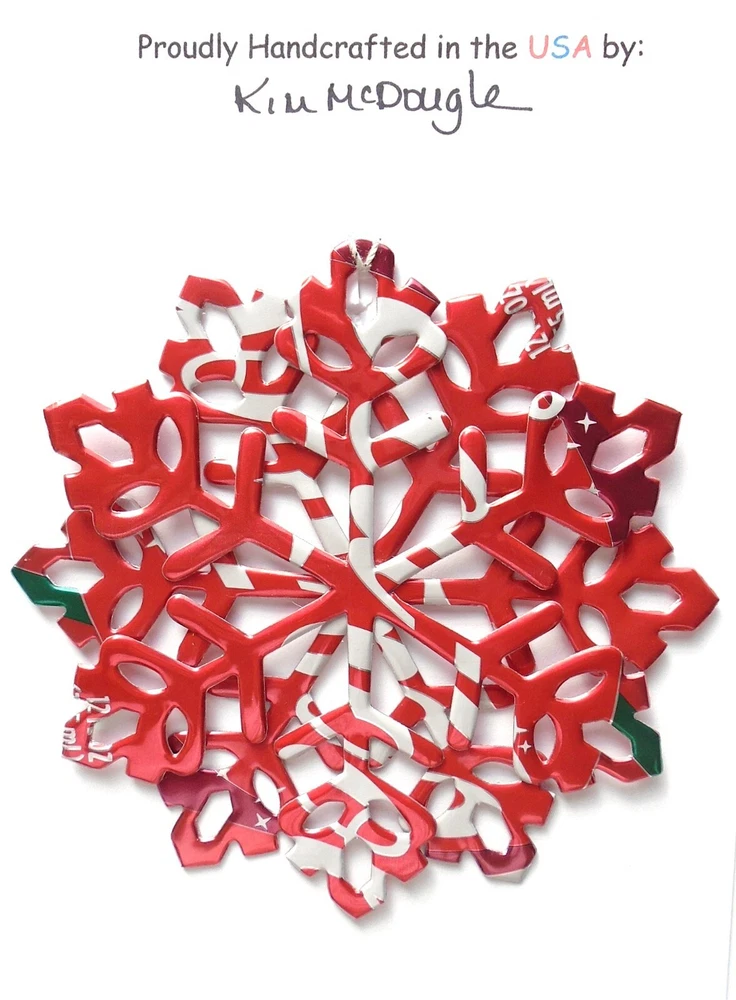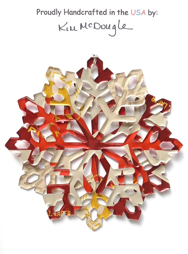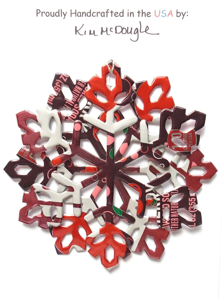 One handmade, die-cut, layered snowflake Christmas ornament made with four recycled aluminum beverage cans. Please make your can type selection(s) from the drop-down menu above. This ornament has been crafted by adhering two recycled aluminum cans together before the snowflake ornament is cut. This process is then repeated to make another snowflake ornament. The two single snowflake ornaments are then glued together at the center to create a layered snowflake ornament. The finished result is the double-sided ornament showing the colored branded side of the can on both the front and back of the ornament. This ornament is approximately 4 inches in diameter and has an attached string for hanging. The ornament is nicely mounted on a 4 1/2 " X 6 1/2" card signed by the artisan crafter. The ornament pictured in the drop-down menu selection is the ornament that you will be buying. · The ornament is made with a recycled/upcycled can and has small scratches and/or dents that are visible. · The ornament is thin, lightweight, delicate, and bendable. It does not have any backing added. · The ornament is intended for decorative and adult use only. Handle ornament with the attached string, edges may be sharp. Please visit my eBay Store to view all my current recycled can ornament listings. Shipping through the USPS with tracking will cost $4.35 for the first ornament or set and FREE for each additional ornament or set for orders of one to five ornaments or sets. Shipping through the USPS with tracking is FREE for orders of six or more ornaments or sets. Please add ornaments to the shopping cart for the shipping discounts to be applied to your order. My business and the ornaments that I make are not affiliated with or endorsed by the trademarked company.