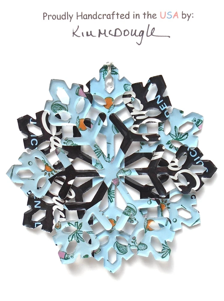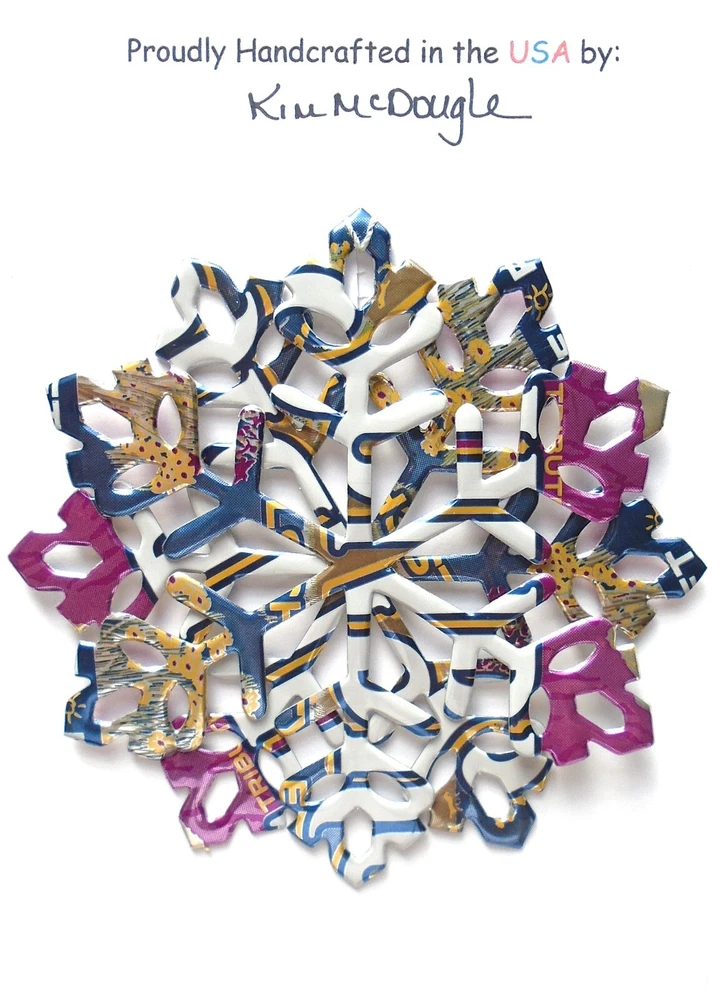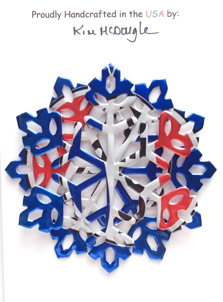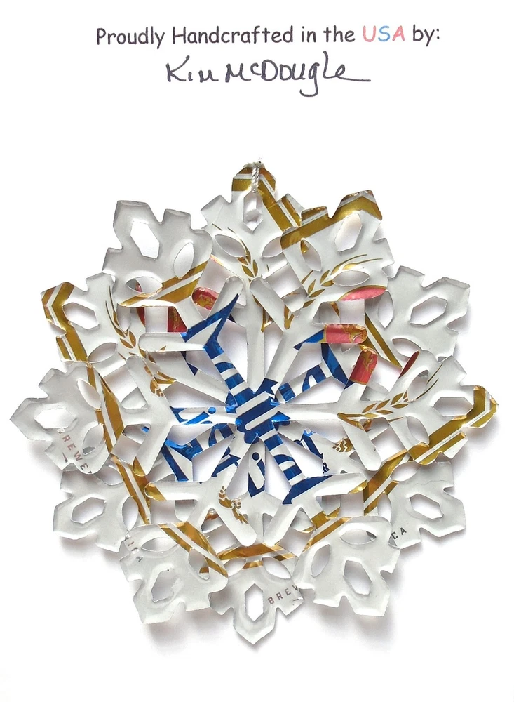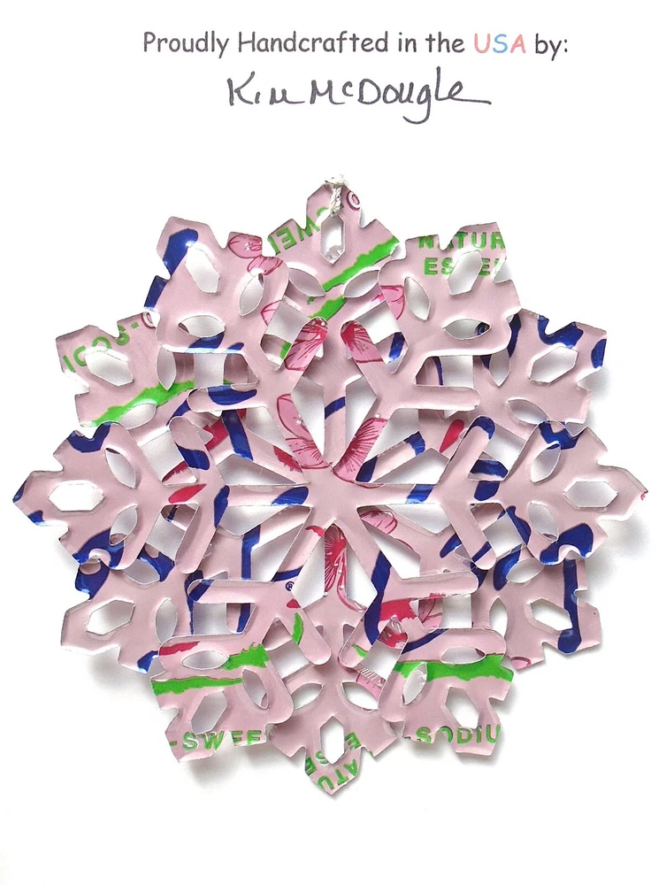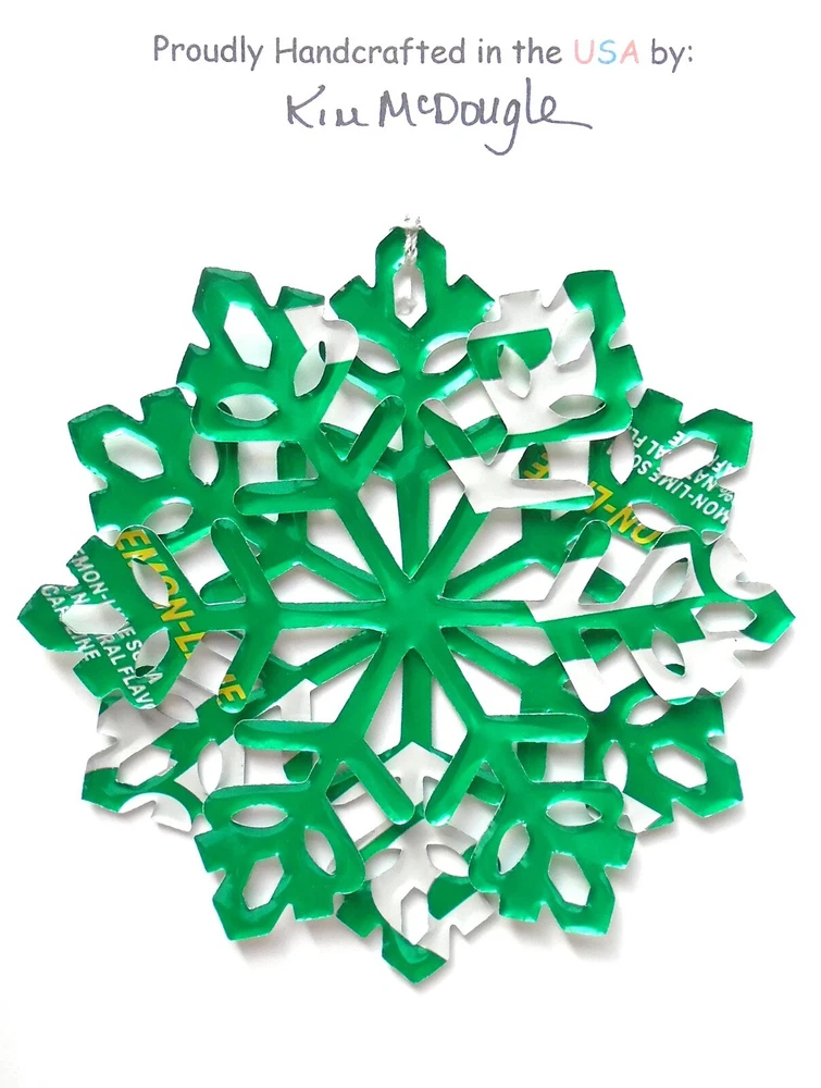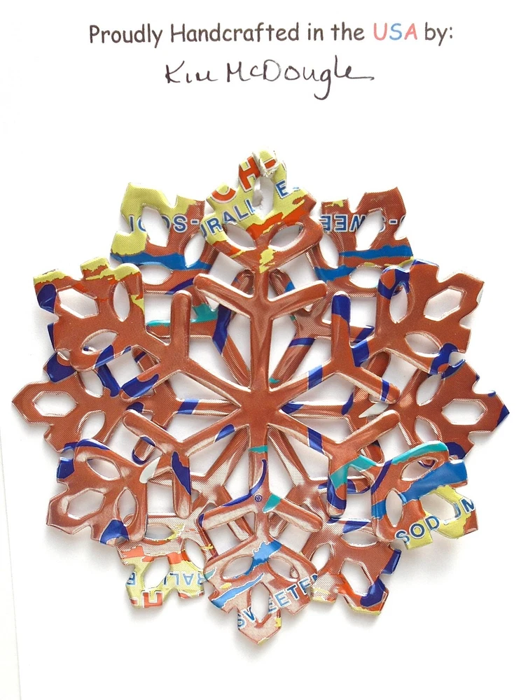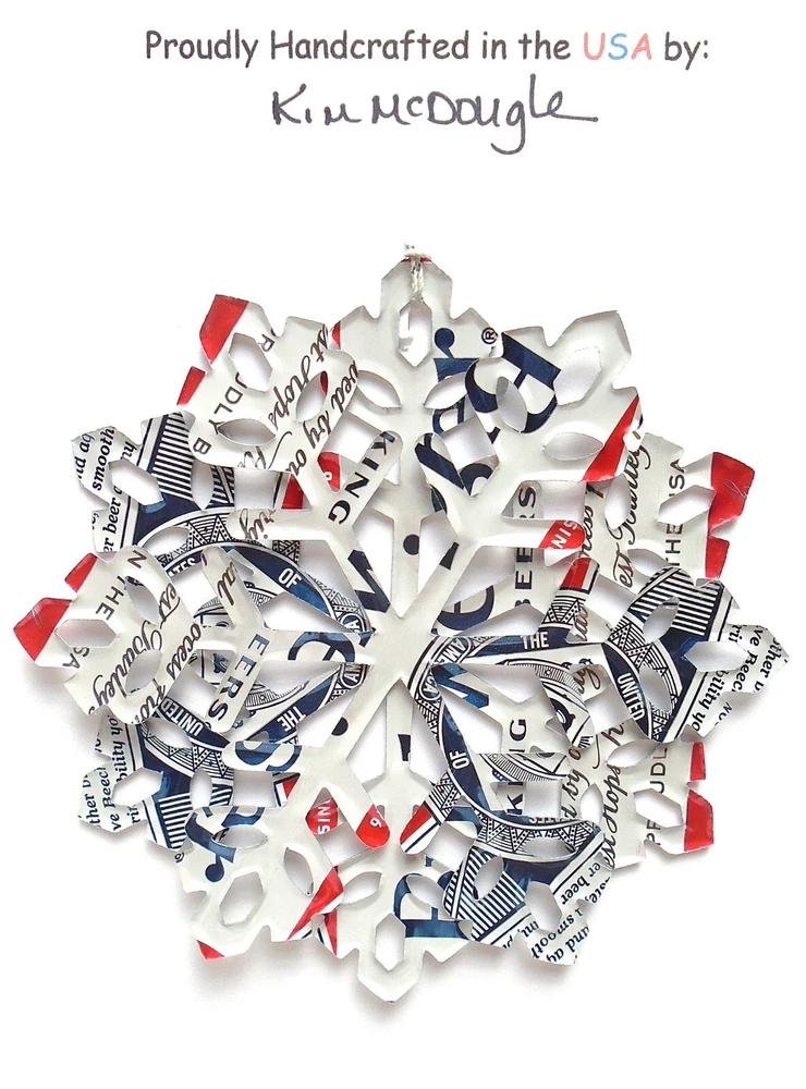One handmade, die-cut, layered snowflake Christmas ornament made with four recycled aluminum beverage cans. Please make your can type selection(s) from the drop-down menu above. This ornament has been crafted by adhering two recycled aluminum cans together before the snowflake ornament is cut. This process is then repeated to make another snowflake ornament. The two single snowflake ornaments are then glued together at the center to create a layered snowflake ornament. The finished result is the double-sided ornament showing the colored branded side of the can on both the front and back of the ornament. This ornament is approximately 4 inches in diameter and has an attached string for hanging. The ornament is nicely mounted on a 4 1/2 " X 6 1/2" card signed by the artisan crafter. The ornament pictured in the drop-down menu selection is the ornament that you will be buying. · The ornament is made with a recycled/upcycled can and has small scratches and/or dents that are visible. · The ornament is thin, lightweight, delicate, and bendable. It does not have any backing added. · The ornament is intended for decorative and adult use only. Handle ornament with the attached string, edges may be sharp. Please visit my eBay Store to view all my current recycled can ornament listings. Shipping through the USPS with tracking will cost $4.35 for the first ornament or set and FREE for each additional ornament or set for orders of one to five ornaments or sets. Shipping through the USPS with tracking is FREE for orders of six or more ornaments or sets. Please add ornaments to the shopping cart for the shipping discounts to be applied to your order. My business and the ornaments that I make are not affiliated with or endorsed by the trademarked company.