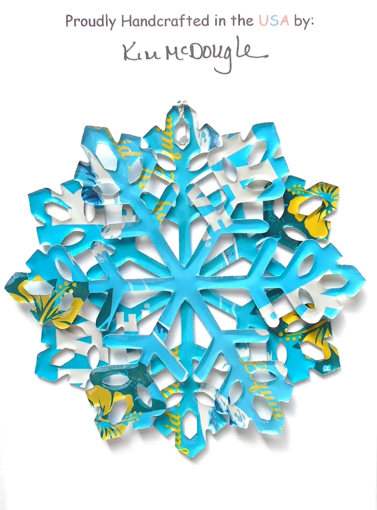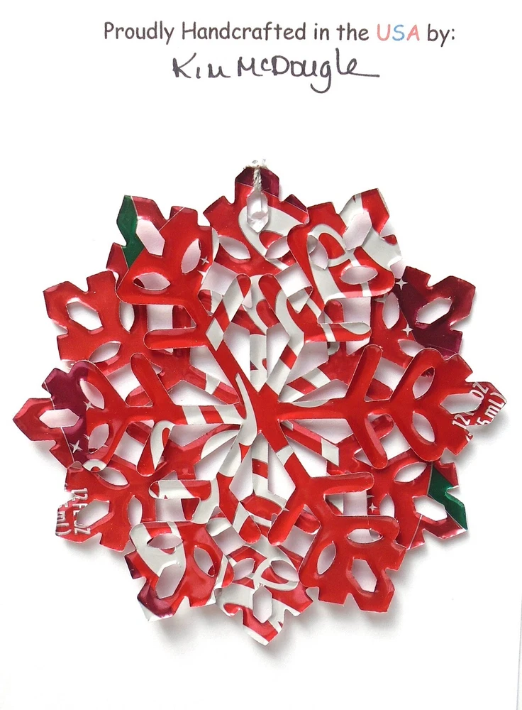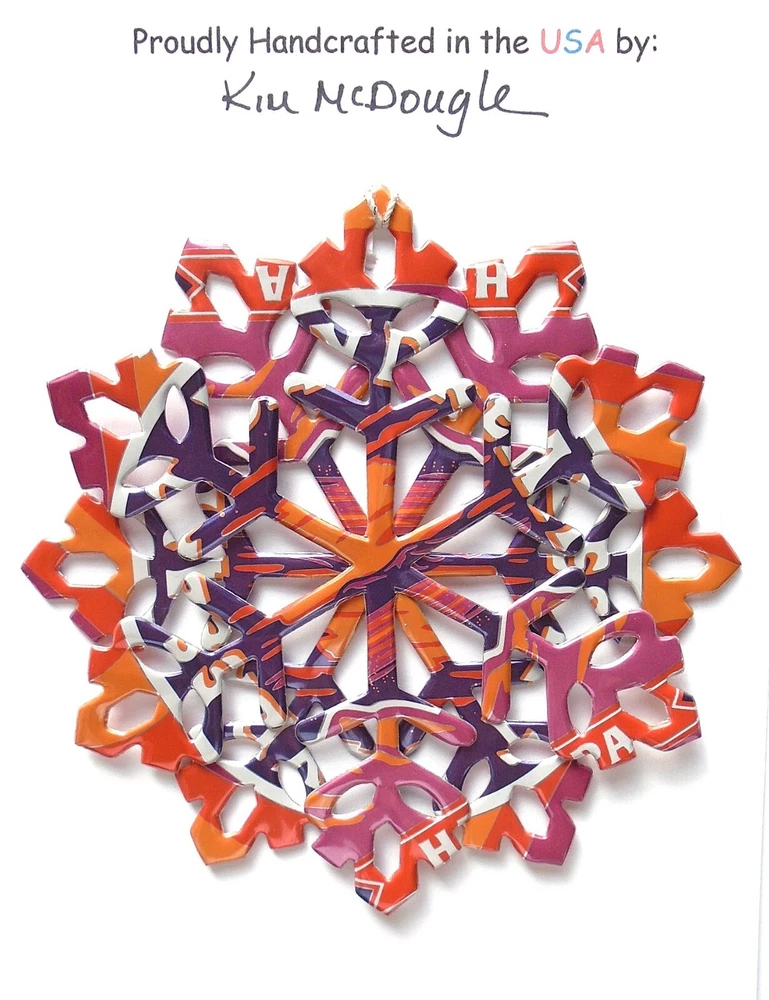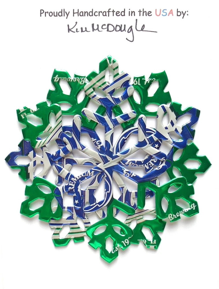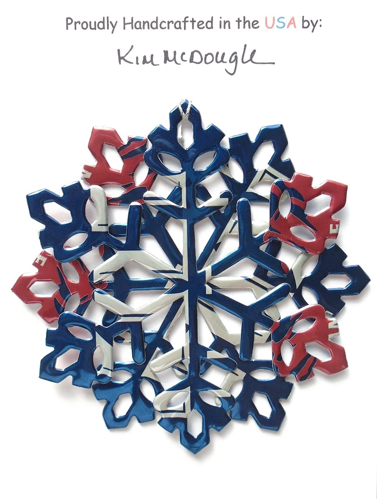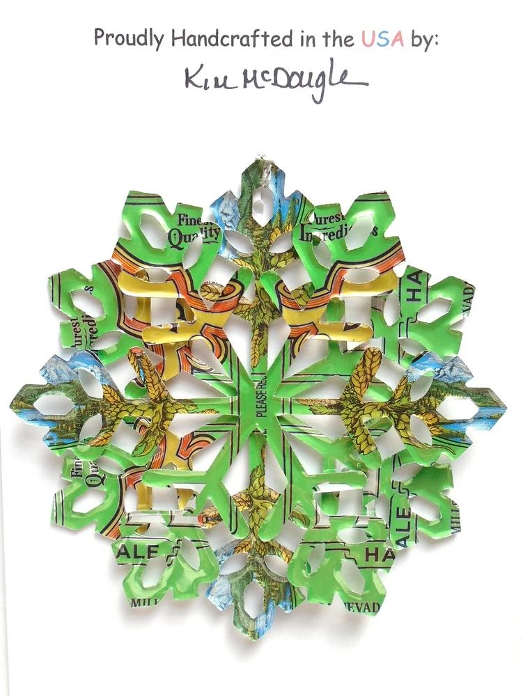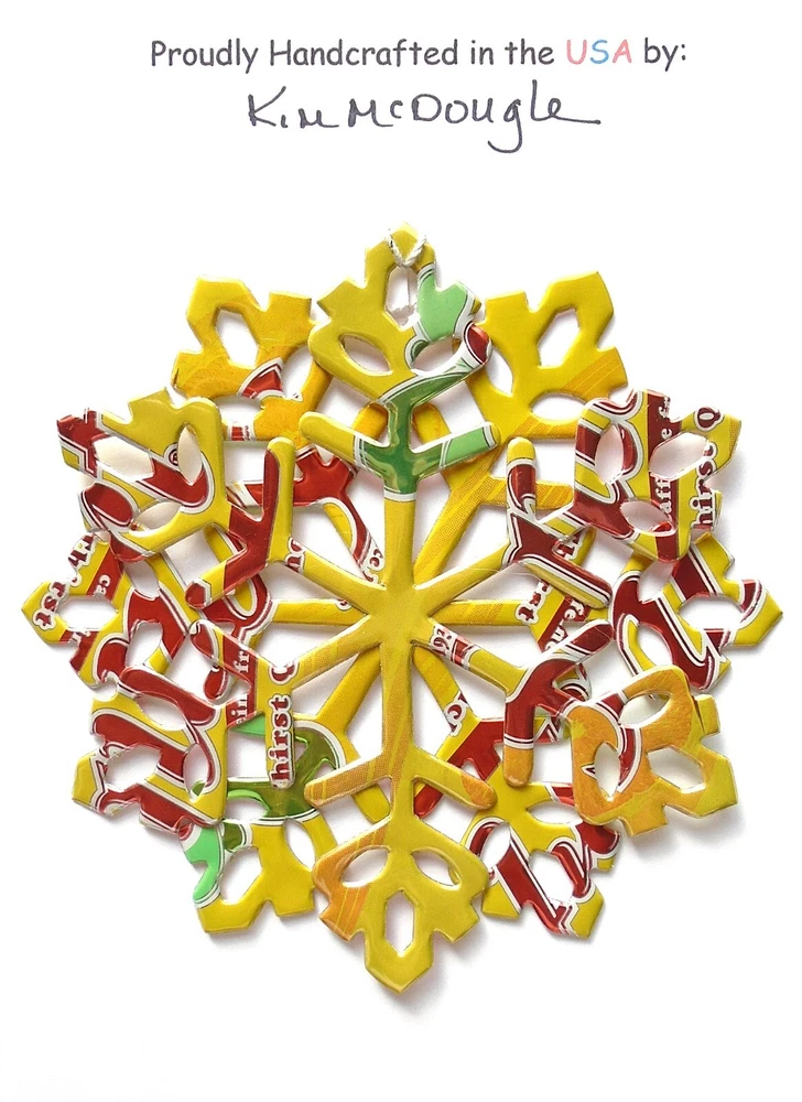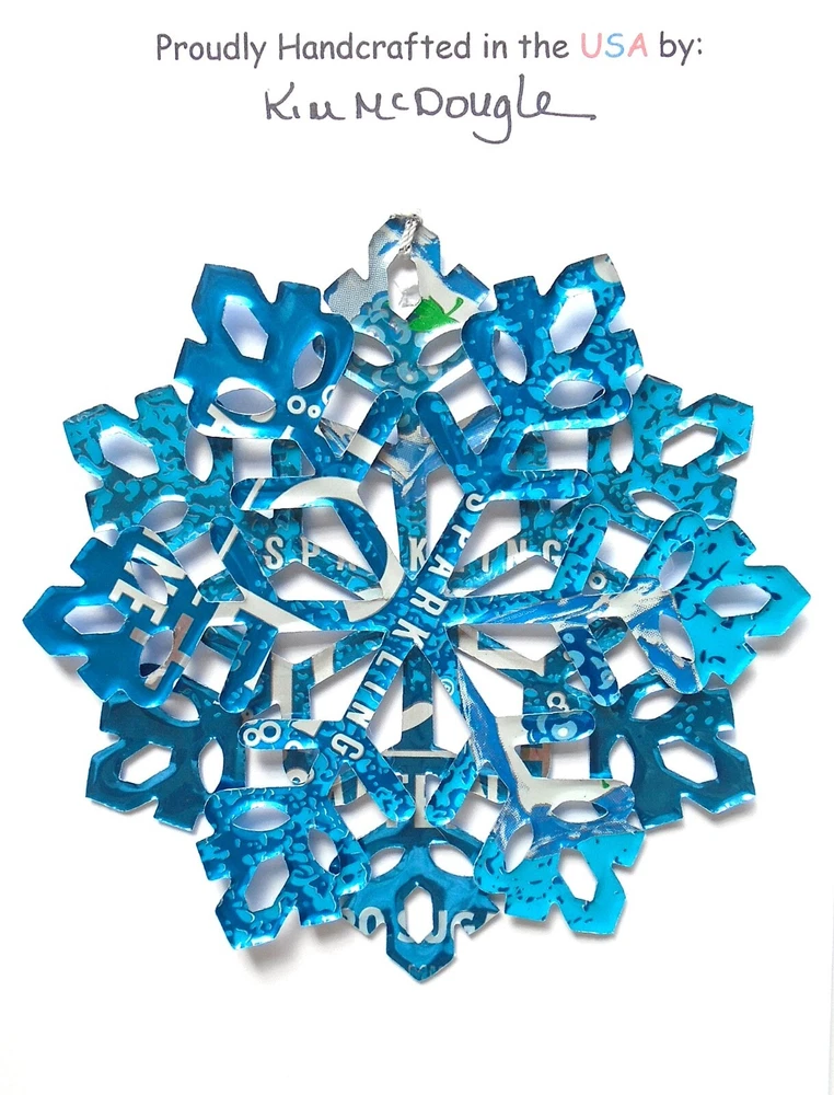 One handmade, die-cut, layered snowflake Christmas ornament made with four recycled aluminum beverage cans. Please make your can type selection(s) from the drop-down menu above. This ornament has been crafted by adhering two recycled aluminum cans together before the snowflake ornament is cut. This process is then repeated to make another snowflake ornament. The two single snowflake ornaments are then glued together at the center to create a layered snowflake ornament. The finished result is the double-sided ornament showing the colored branded side of the can on both the front and back of the ornament. This ornament is approximately 4 inches in diameter and has an attached string for hanging. The ornament is nicely mounted on a 4 1/2 " X 6 1/2" card signed by the artisan crafter. The ornament pictured in the drop-down menu selection is the ornament that you will be buying. · The ornament is made with a recycled/upcycled can and has small scratches and/or dents that are visible. · The ornament is thin, lightweight, delicate, and bendable. It does not have any backing added. · The ornament is intended for decorative and adult use only. Handle ornament with the attached string, edges may be sharp. Please visit my eBay Store to view all my current recycled can ornament listings. Shipping through the USPS with tracking will cost $4.35 for the first ornament or set and FREE for each additional ornament or set for orders of one to five ornaments or sets. Shipping through the USPS with tracking is FREE for orders of six or more ornaments or sets. Please add ornaments to the shopping cart for the shipping discounts to be applied to your order. My business and the ornaments that I make are not affiliated with or endorsed by the trademarked company.