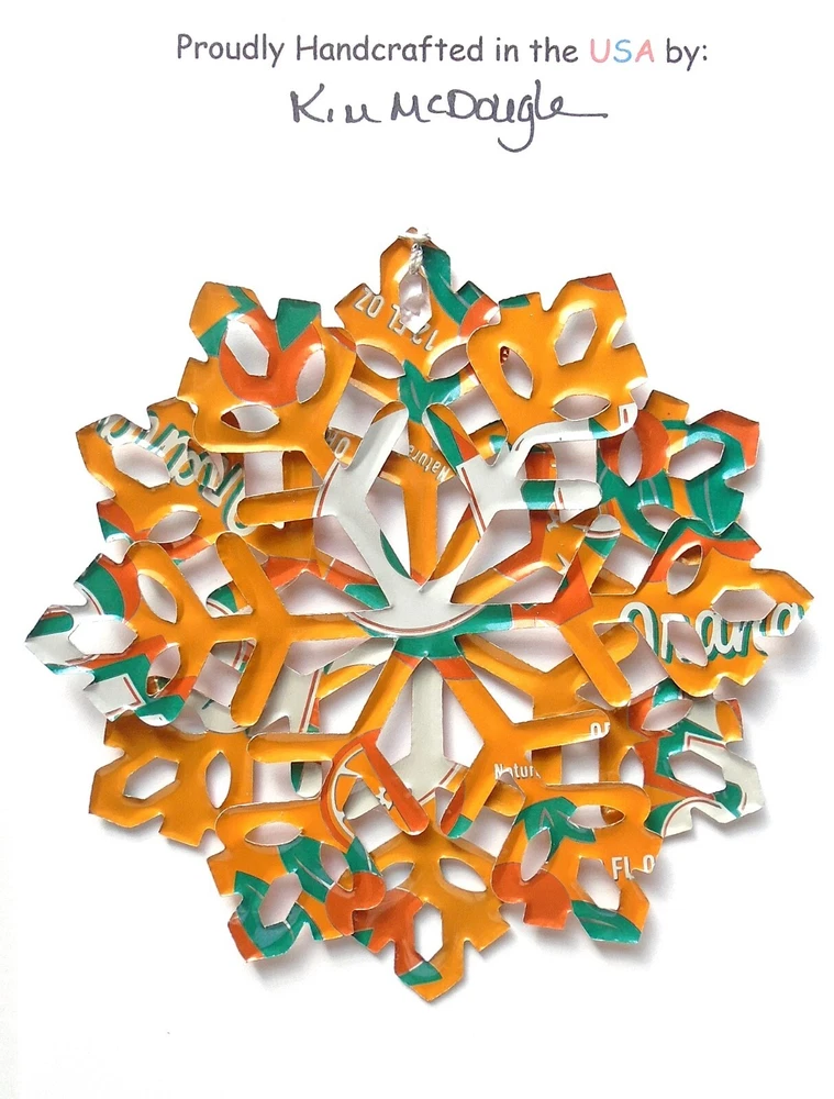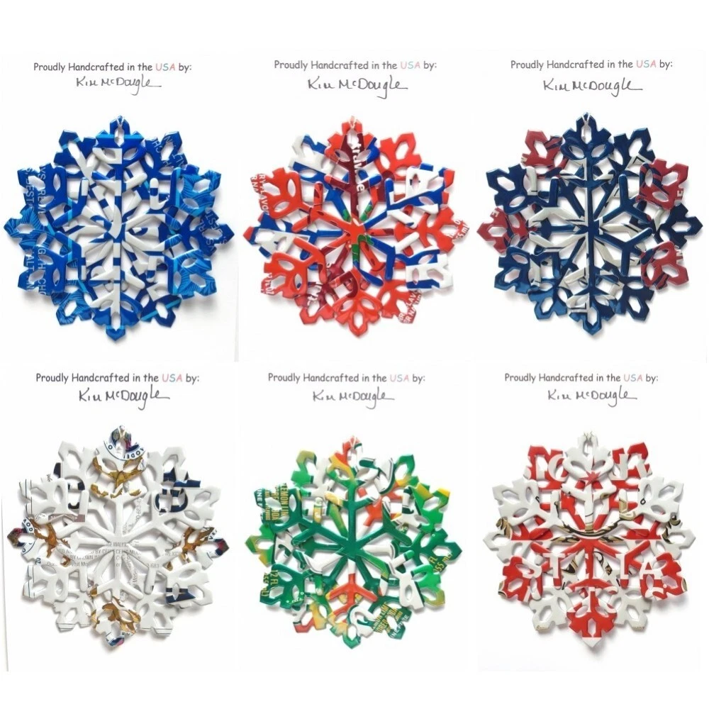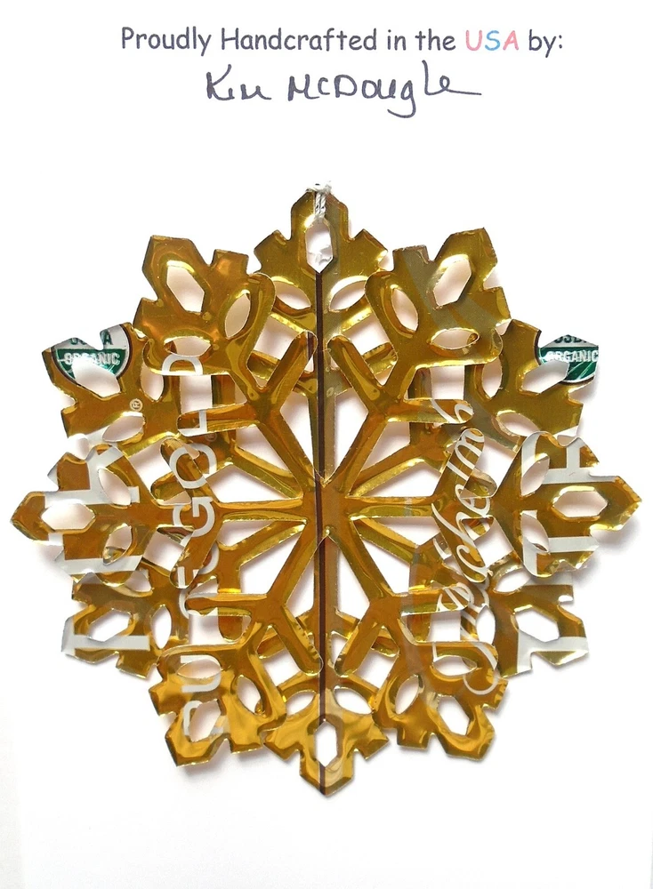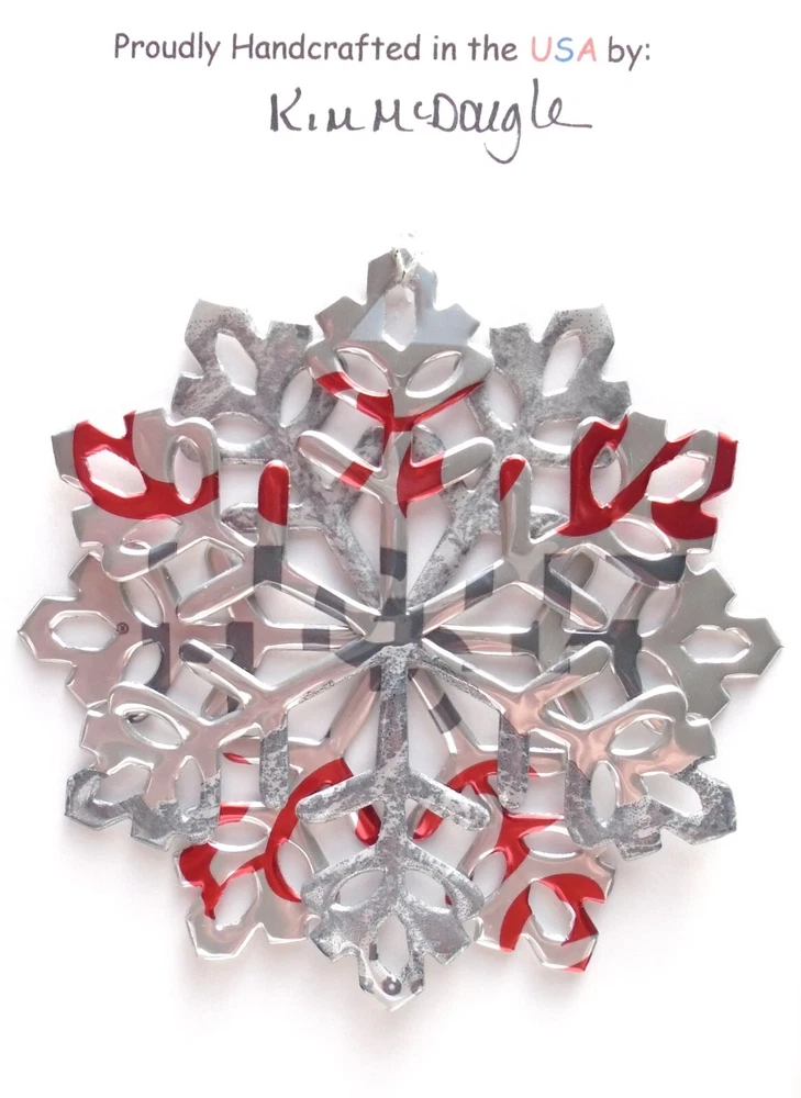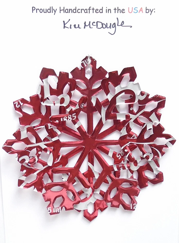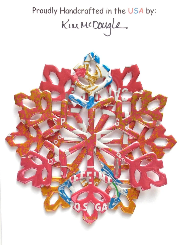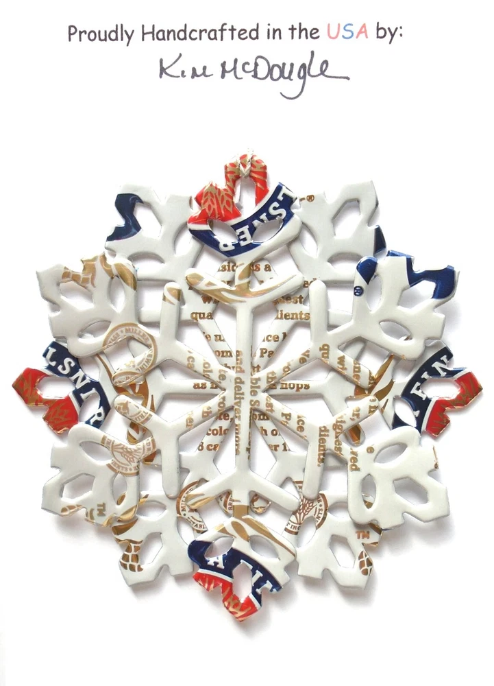 One handmade, die-cut, layered snowflake Christmas ornament made with four recycled aluminum beverage cans. Please make your can type selection(s) from the drop-down menu above. This ornament has been crafted by adhering two recycled aluminum cans together before the snowflake ornament is cut. This process is then repeated to make another snowflake ornament. The two single snowflake ornaments are then glued together at the center to create a layered snowflake ornament. The finished result is the double-sided ornament showing the colored branded side of the can on both the front and back of the ornament. This ornament is approximately 4 inches in diameter and has an attached string for hanging. The ornament is nicely mounted on a 4 1/2 " X 6 1/2" card signed by the artisan crafter. The ornament pictured in the drop-down menu selection is the ornament that you will be buying. · The ornament is made with a recycled/upcycled can and has small scratches and/or dents that are visible. · The ornament is thin, lightweight, delicate, and bendable. It does not have any backing added. · The ornament is intended for decorative and adult use only. Handle ornament with the attached string, edges may be sharp. Please visit my eBay Store to view all my current recycled can ornament listings. Shipping through the USPS with tracking will cost $4.35 for the first ornament or set and FREE for each additional ornament or set for orders of one to five ornaments or sets. Shipping through the USPS with tracking is FREE for orders of six or more ornaments or sets. Please add ornaments to the shopping cart for the shipping discounts to be applied to your order. My business and the ornaments that I make are not affiliated with or endorsed by the trademarked company.