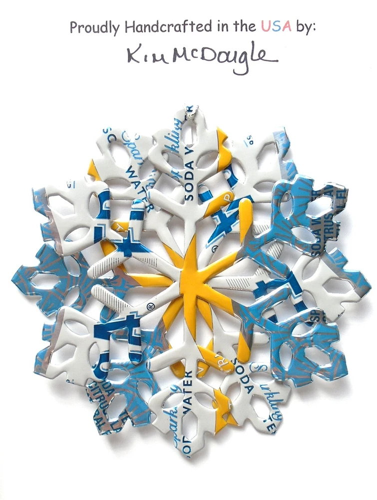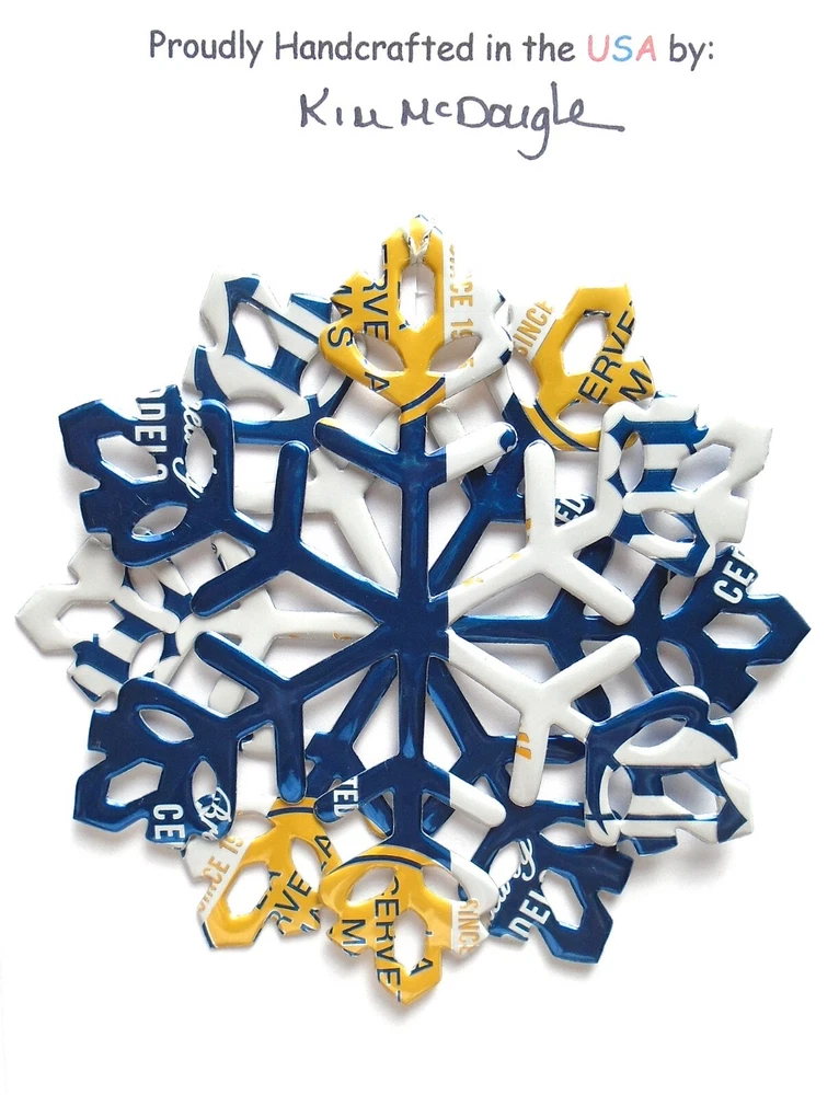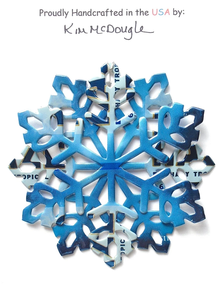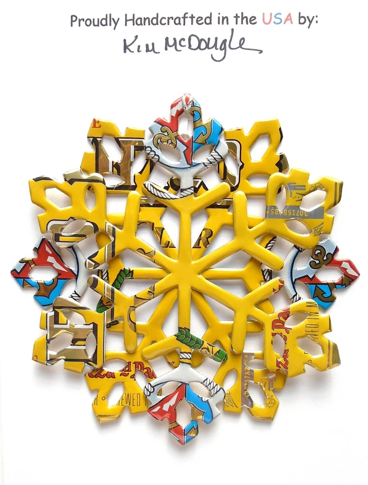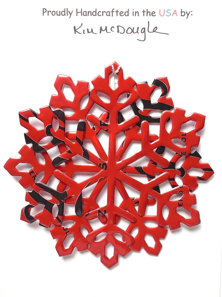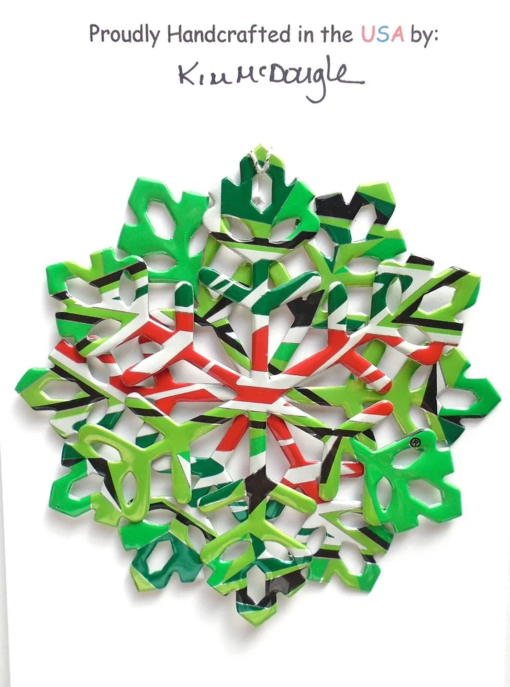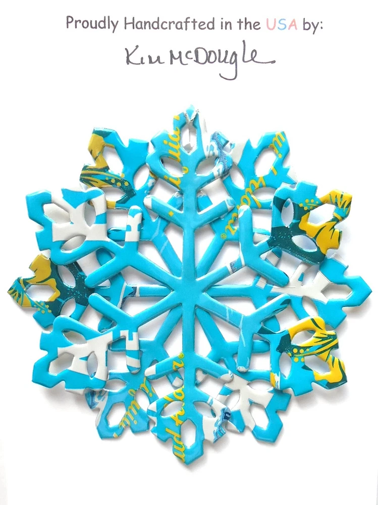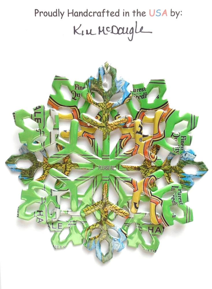 One handmade, die-cut, layered snowflake Christmas ornament made with four recycled aluminum beverage cans. Please make your can type selection(s) from the drop-down menu above. This ornament has been crafted by adhering two recycled aluminum cans together before the snowflake ornament is cut. This process is then repeated to make another snowflake ornament. The two single snowflake ornaments are then glued together at the center to create a layered snowflake ornament. The finished result is the double-sided ornament showing the colored branded side of the can on both the front and back of the ornament. This ornament is approximately 4 inches in diameter and has an attached string for hanging. The ornament is nicely mounted on a 4 1/2 " X 6 1/2" card signed by the artisan crafter. The ornament pictured in the drop-down menu selection is the ornament that you will be buying. · The ornament is made with a recycled/upcycled can and has small scratches and/or dents that are visible. · The ornament is thin, lightweight, delicate, and bendable. It does not have any backing added. · The ornament is intended for decorative and adult use only. Handle ornament with the attached string, edges may be sharp. Please visit my eBay Store to view all my current recycled can ornament listings. Shipping through the USPS with tracking will cost $4.35 for the first ornament or set and FREE for each additional ornament or set for orders of one to five ornaments or sets. Shipping through the USPS with tracking is FREE for orders of six or more ornaments or sets. Please add ornaments to the shopping cart for the shipping discounts to be applied to your order. My business and the ornaments that I make are not affiliated with or endorsed by the trademarked company.