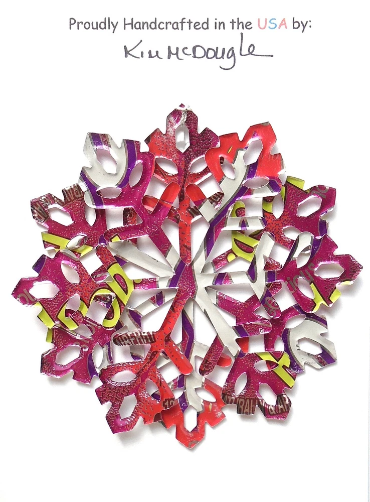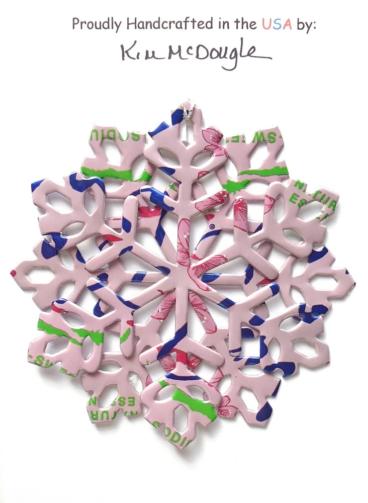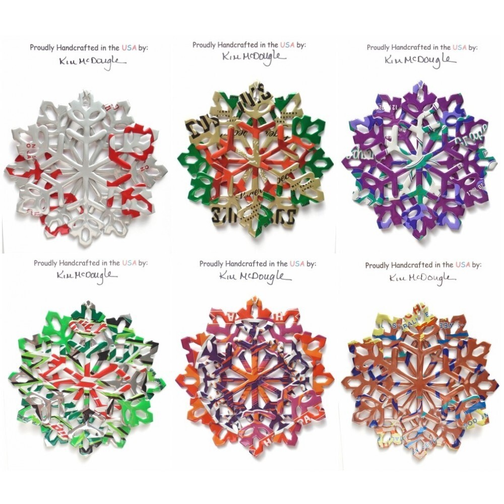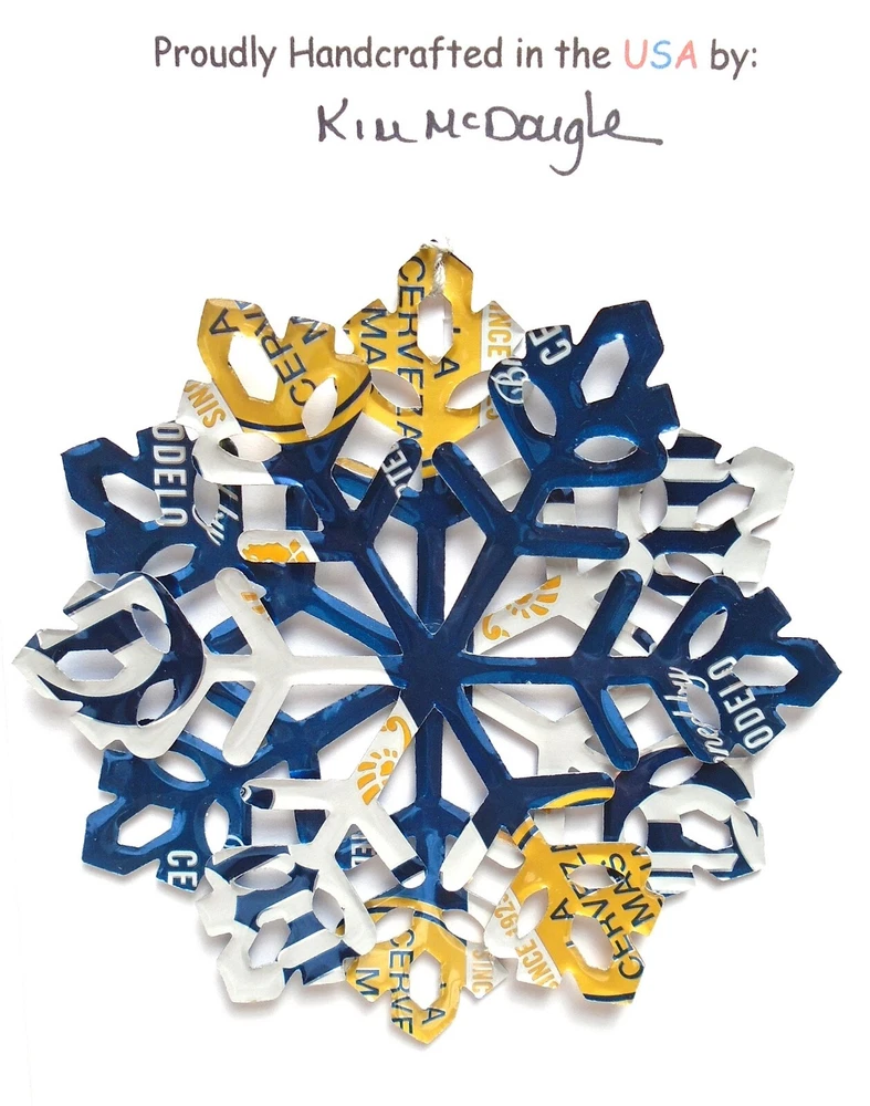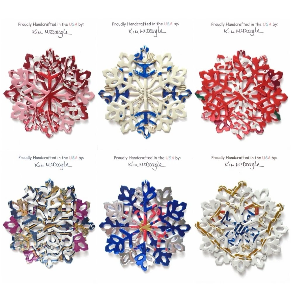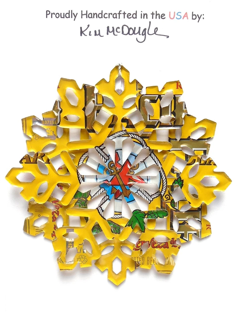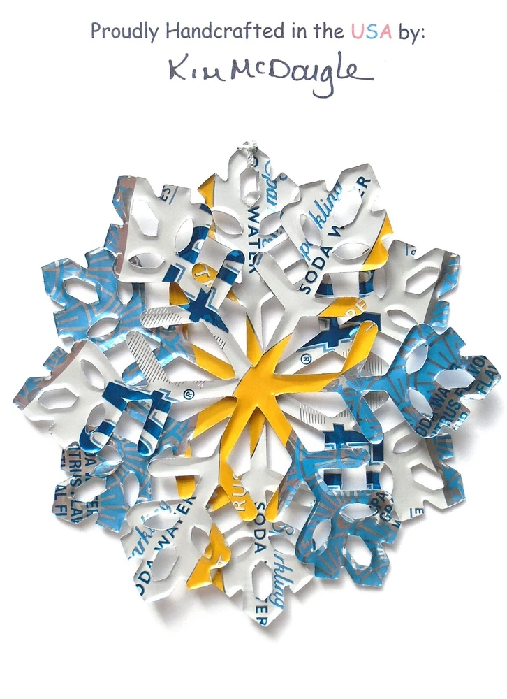 One handmade, die-cut, layered snowflake Christmas ornament made with four recycled aluminum beverage cans. Please make your can type selection(s) from the drop-down menu above. This ornament has been crafted by adhering two recycled aluminum cans together before the snowflake ornament is cut. This process is then repeated to make another snowflake ornament. The two single snowflake ornaments are then glued together at the center to create a layered snowflake ornament. The finished result is the double-sided ornament showing the colored branded side of the can on both the front and back of the ornament. This ornament is approximately 4 inches in diameter and has an attached string for hanging. The ornament is nicely mounted on a 4 1/2 " X 6 1/2" card signed by the artisan crafter. The ornament pictured in the drop-down menu selection is the ornament that you will be buying. · The ornament is made with a recycled/upcycled can and has small scratches and/or dents that are visible. · The ornament is thin, lightweight, delicate, and bendable. It does not have any backing added. · The ornament is intended for decorative and adult use only. Handle ornament with the attached string, edges may be sharp. Please visit my eBay Store to view all my current recycled can ornament listings. Shipping through the USPS with tracking will cost $4.35 for the first ornament or set and FREE for each additional ornament or set for orders of one to five ornaments or sets. Shipping through the USPS with tracking is FREE for orders of six or more ornaments or sets. Please add ornaments to the shopping cart for the shipping discounts to be applied to your order. My business and the ornaments that I make are not affiliated with or endorsed by the trademarked company.