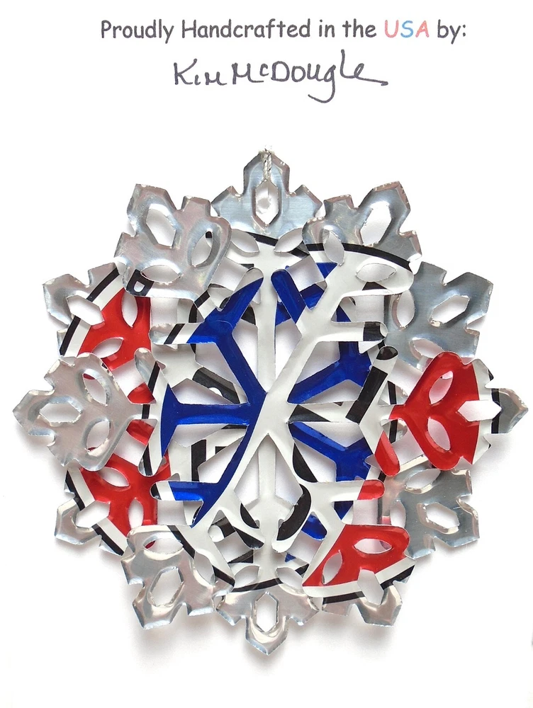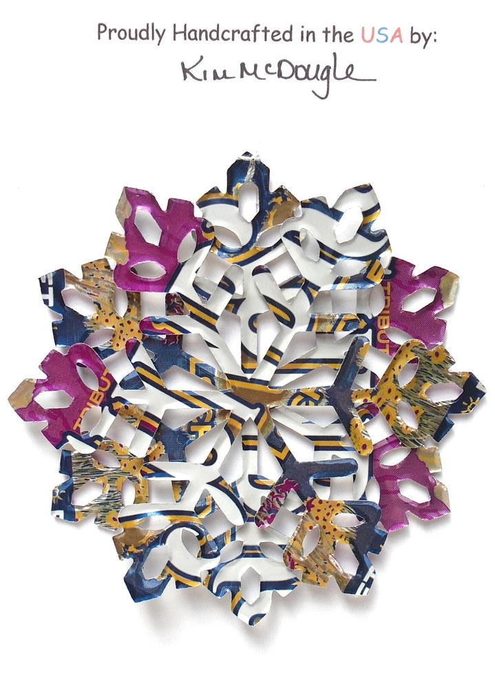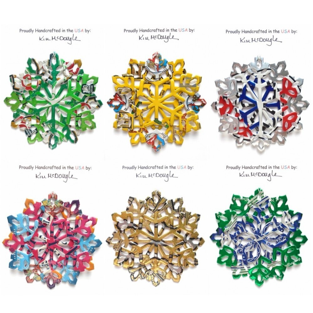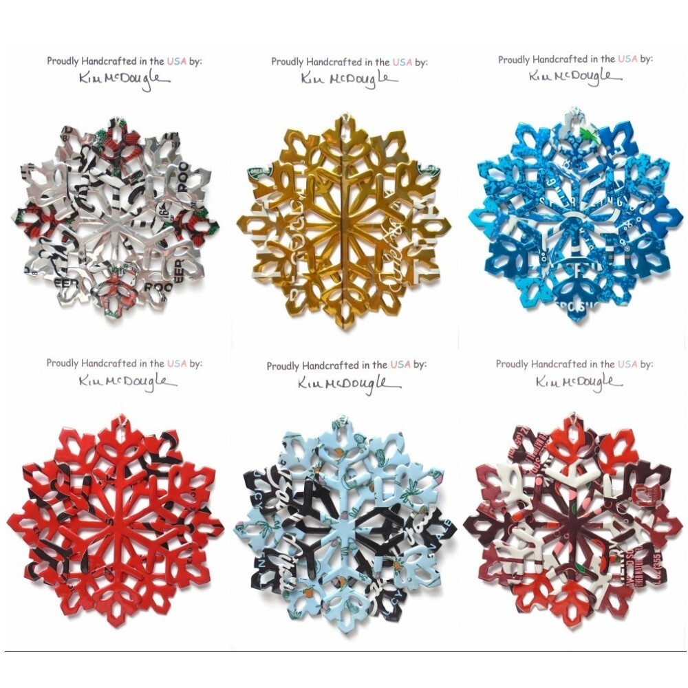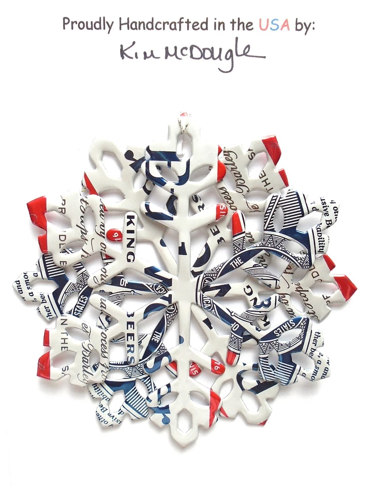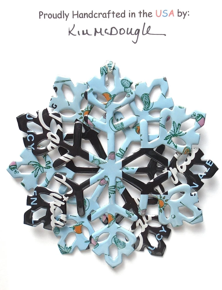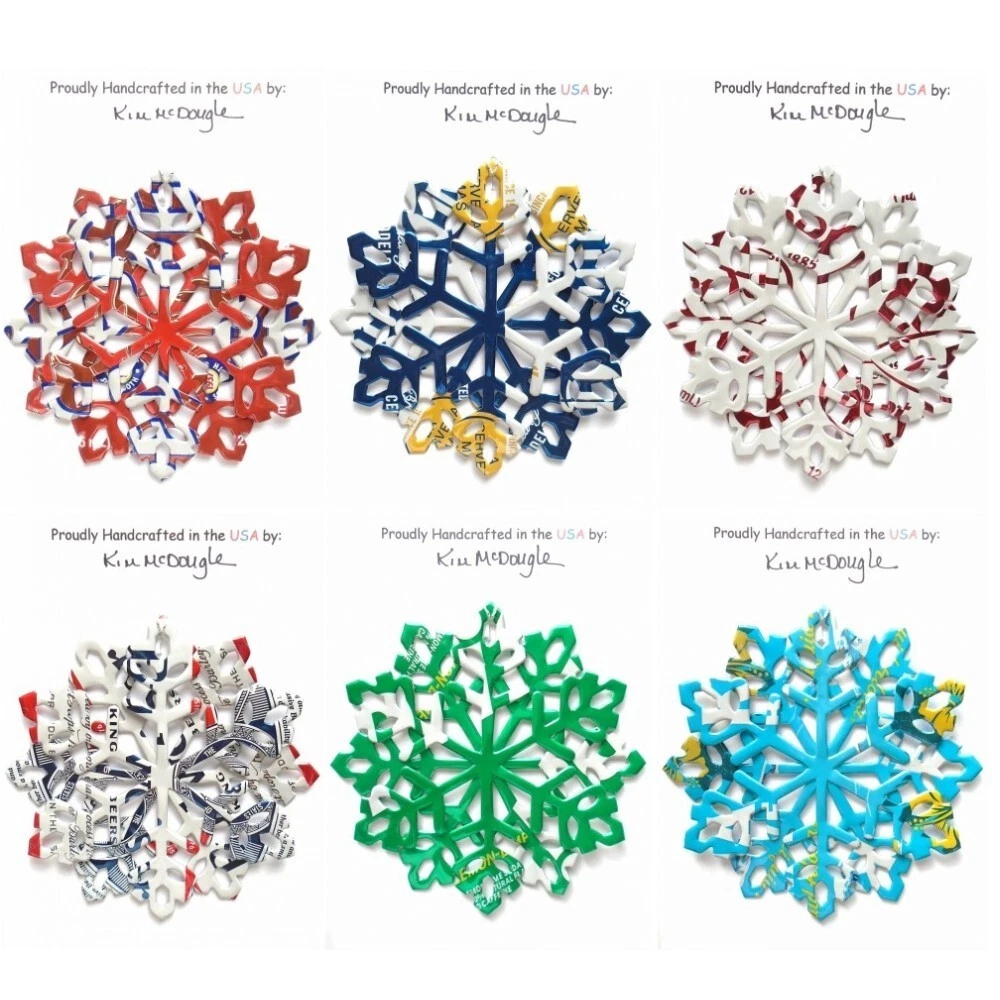 One handmade, die-cut, layered snowflake Christmas ornament made with four recycled aluminum beverage cans. Please make your can type selection(s) from the drop-down menu above. This ornament has been crafted by adhering two recycled aluminum cans together before the snowflake ornament is cut. This process is then repeated to make another snowflake ornament. The two single snowflake ornaments are then glued together at the center to create a layered snowflake ornament. The finished result is the double-sided ornament showing the colored branded side of the can on both the front and back of the ornament. This ornament is approximately 4 inches in diameter and has an attached string for hanging. The ornament is nicely mounted on a 4 1/2 " X 6 1/2" card signed by the artisan crafter. The ornament pictured in the drop-down menu selection is the ornament that you will be buying. · The ornament is made with a recycled/upcycled can and has small scratches and/or dents that are visible. · The ornament is thin, lightweight, delicate, and bendable. It does not have any backing added. · The ornament is intended for decorative and adult use only. Handle ornament with the attached string, edges may be sharp. Please visit my eBay Store to view all my current recycled can ornament listings. Shipping through the USPS with tracking will cost $4.35 for the first ornament or set and FREE for each additional ornament or set for orders of one to five ornaments or sets. Shipping through the USPS with tracking is FREE for orders of six or more ornaments or sets. Please add ornaments to the shopping cart for the shipping discounts to be applied to your order. My business and the ornaments that I make are not affiliated with or endorsed by the trademarked company.