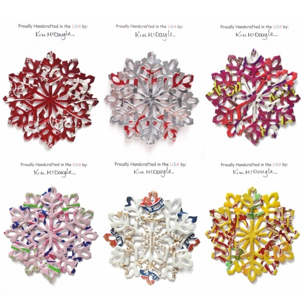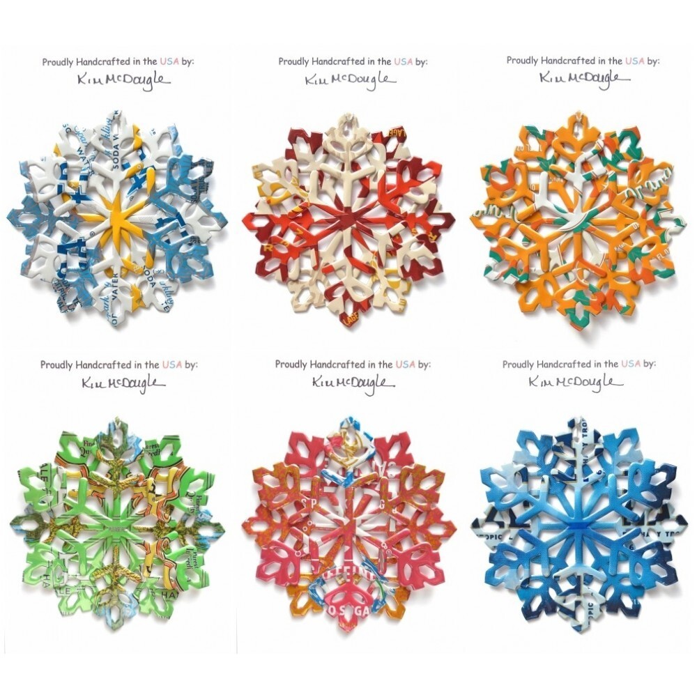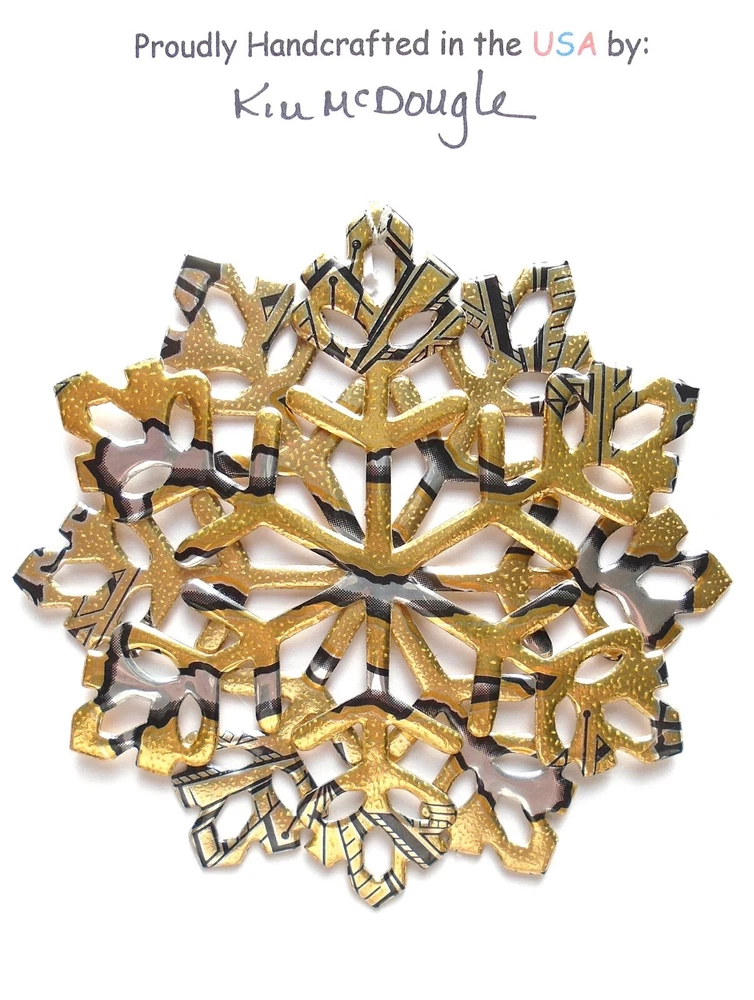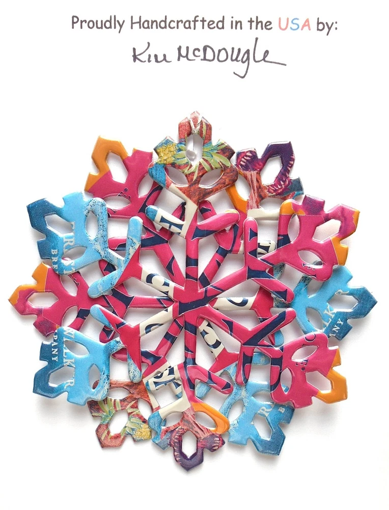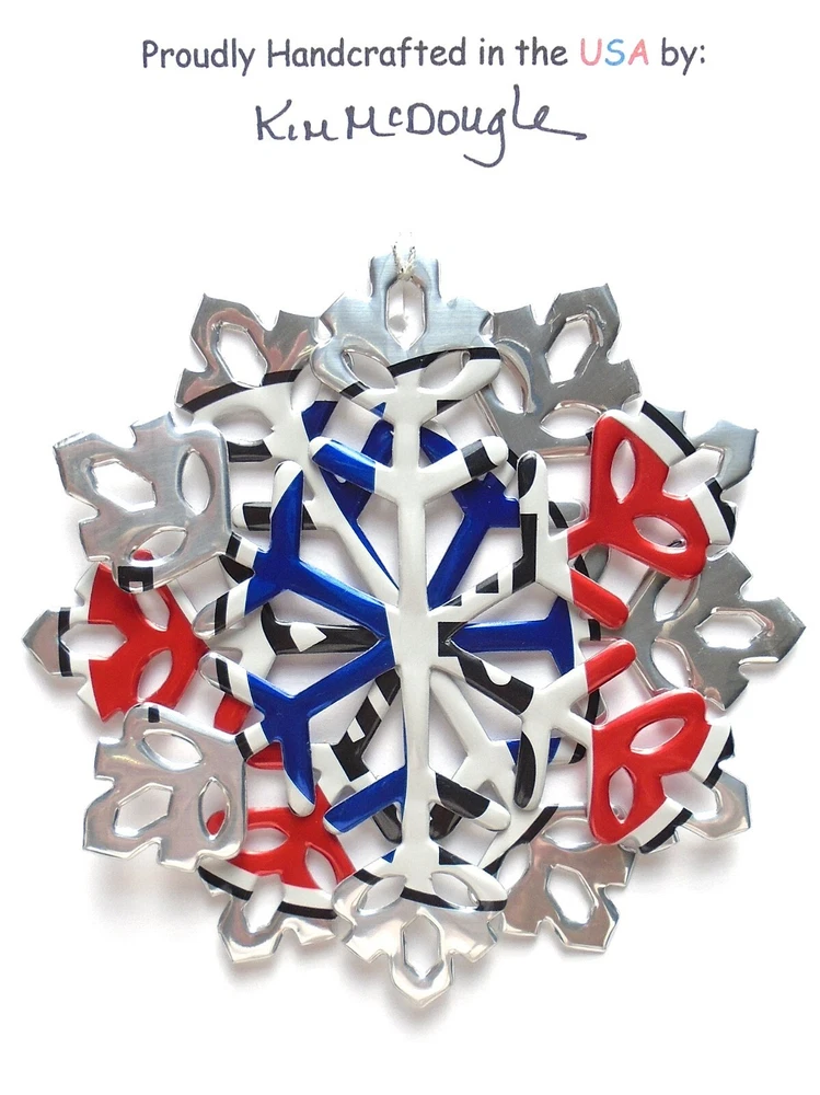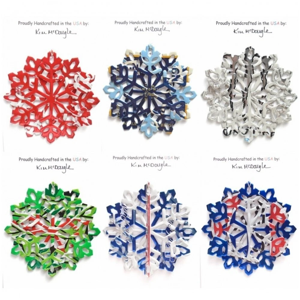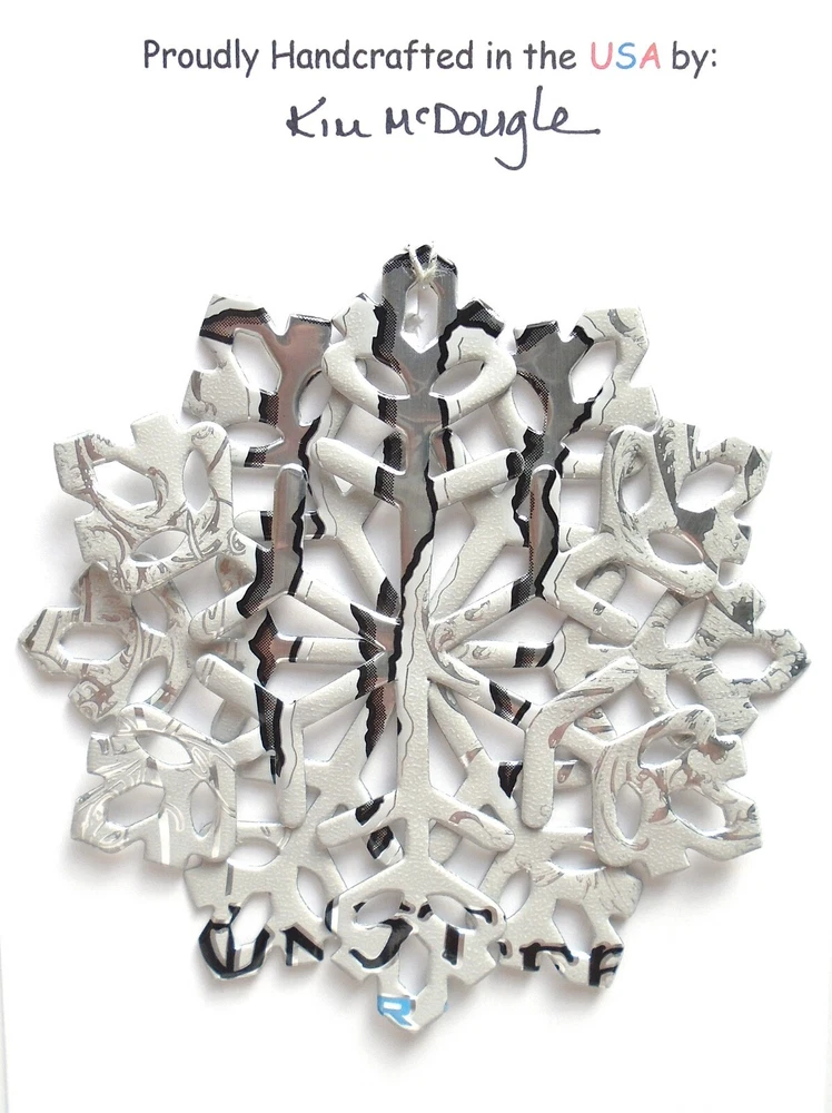One handmade, die-cut, layered snowflake Christmas ornament made with four recycled aluminum beverage cans. Please make your can type selection(s) from the drop-down menu above. This ornament has been crafted by adhering two recycled aluminum cans together before the snowflake ornament is cut. This process is then repeated to make another snowflake ornament. The two single snowflake ornaments are then glued together at the center to create a layered snowflake ornament. The finished result is the double-sided ornament showing the colored branded side of the can on both the front and back of the ornament. This ornament is approximately 4 inches in diameter and has an attached string for hanging. The ornament is nicely mounted on a 4 1/2 " X 6 1/2" card signed by the artisan crafter. The ornament pictured in the drop-down menu selection is the ornament that you will be buying. · The ornament is made with a recycled/upcycled can and has small scratches and/or dents that are visible. · The ornament is thin, lightweight, delicate, and bendable. It does not have any backing added. · The ornament is intended for decorative and adult use only. Handle ornament with the attached string, edges may be sharp. Please visit my eBay Store to view all my current recycled can ornament listings. Shipping through the USPS with tracking will cost $4.35 for the first ornament or set and FREE for each additional ornament or set for orders of one to five ornaments or sets. Shipping through the USPS with tracking is FREE for orders of six or more ornaments or sets. Please add ornaments to the shopping cart for the shipping discounts to be applied to your order. My business and the ornaments that I make are not affiliated with or endorsed by the trademarked company.