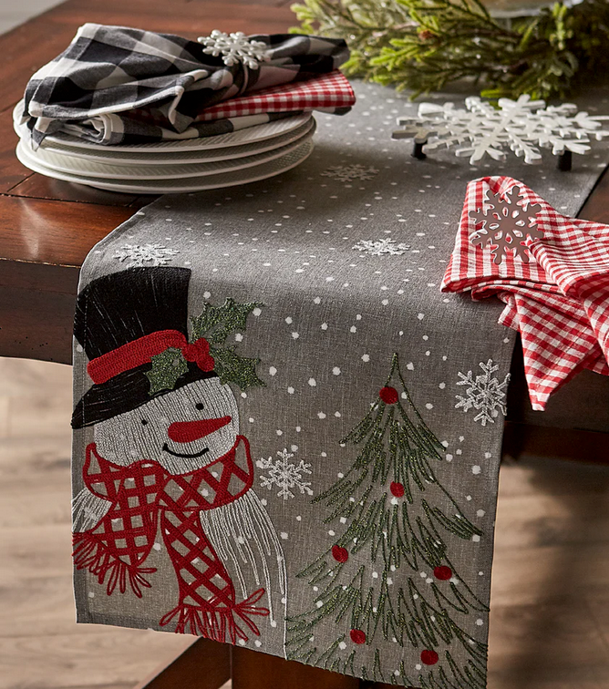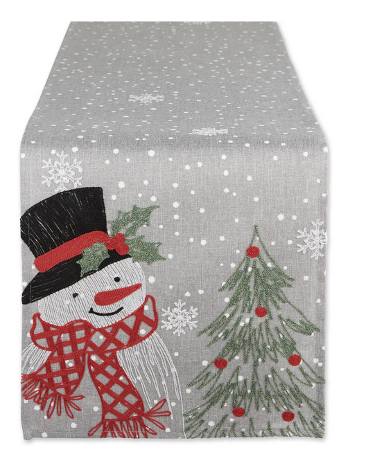 This beautiful silver/gray table runner measures 14" x 70" and fits on a table that can seat 6-8 people. This embroidered snowman with various trees makes it easy to decorate your table for the holidays. Table runner should be hand wash cold , line dried and low iron only if needed. This item is not a left over item and is new for the 2025 holiday season. The quality is great as expected from Design Imports. NOTE: THE PRICES SHOWN ARE PRE-TARIFF PRICES. WE HAVE BEEN NOTIFIED BY THE MANUFACTURER THAT TARIFFS WILL TAKE EFFECT VERY SHORTLY AND PRICES WILL INCREASE. WE SUGGEST THAT IF YOU DESIRE THIS ITEM, THAT YOU PURCHASE BEFORE THE TARIFF INCREASES TAKE EFFECT. AS A RETAILER WE ALREADY ARE ABSORBING MUCH OF THE SHIPPING BUT CANNOT ABSORB THE INCREASE IN COST AS WELL. THANK YOU FOR YOUR UNDERSTANDING.