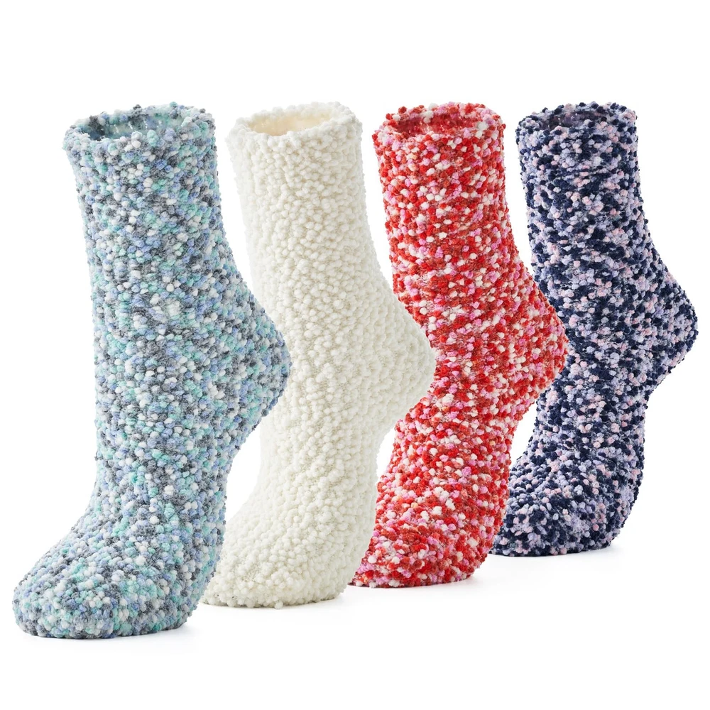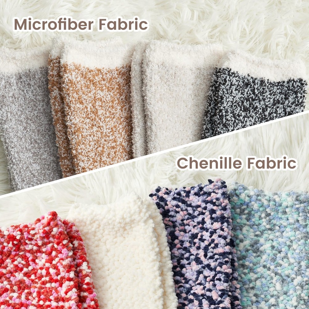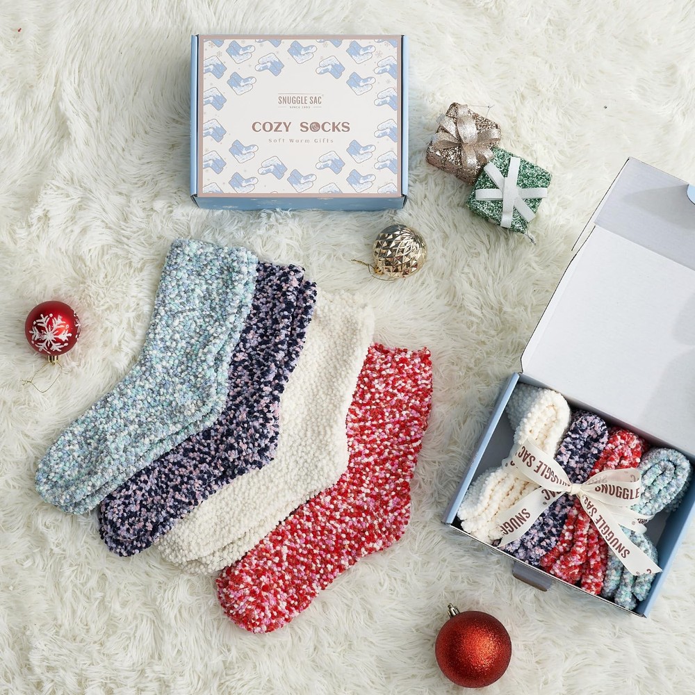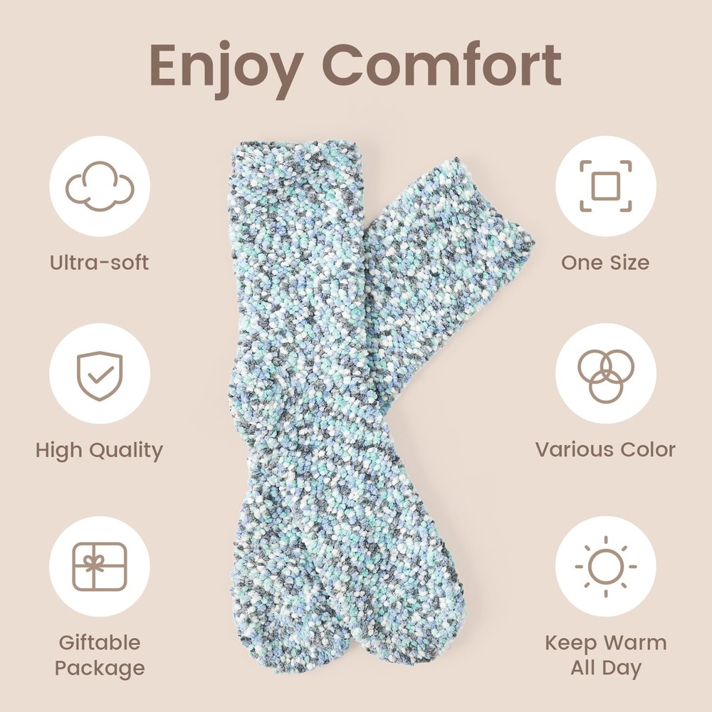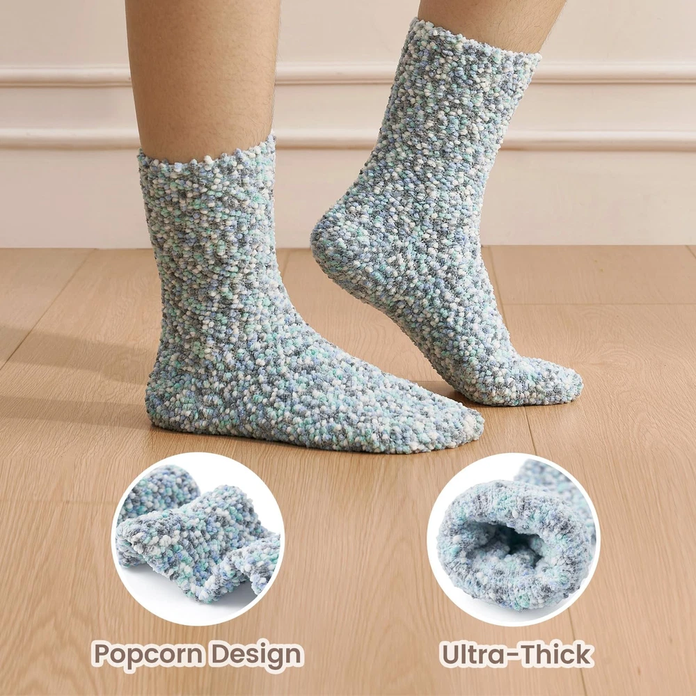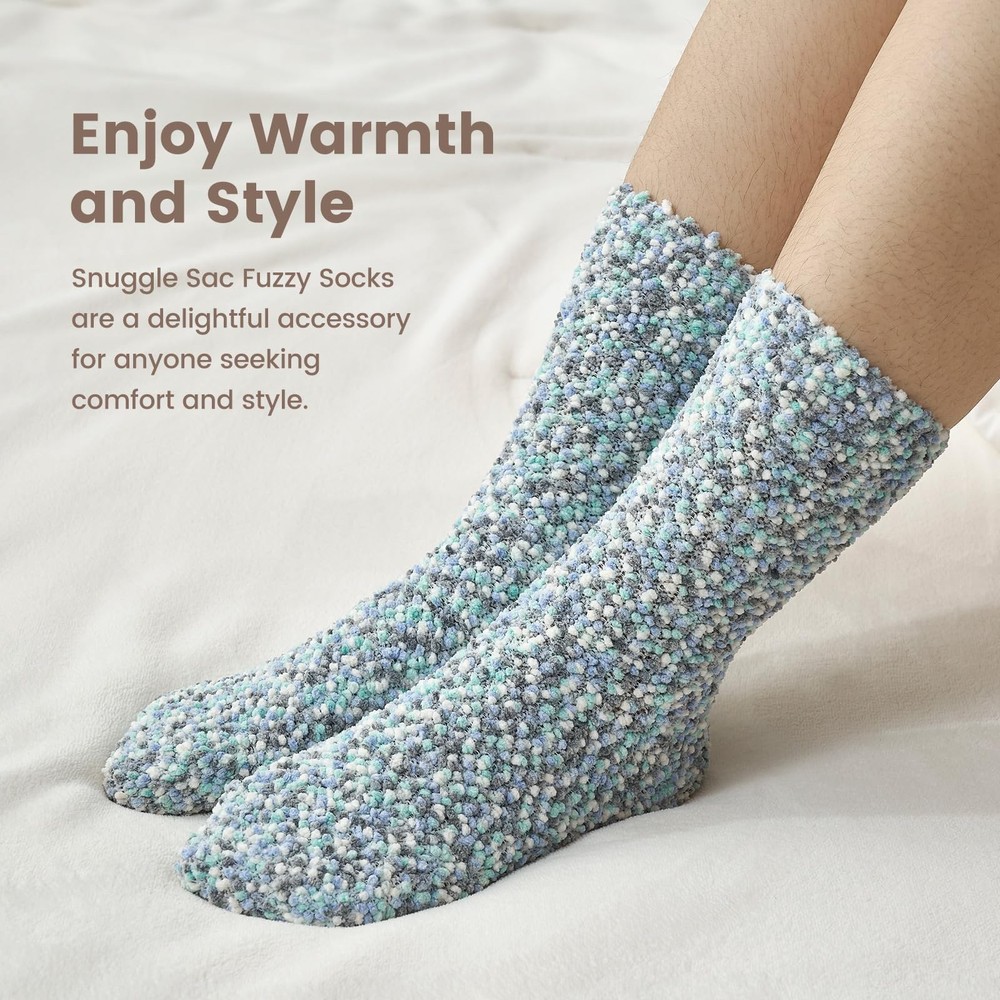 Snuggle Sac Warm Fuzzy Socks made of Luxrious Feather Yarn, which is very soft and comfortable, keeping you snug and warm throughout the coldest months. The sock is made from high-quality microfiber yarn that feels incredibly plush against the skin. Whether you are sleeping,reading a book, or watching TV, these socks provide exceptional insulation and comfort, making them your go-to choice for winter adventures and cozy evenings indoors. High Quality Socks: Snuggle Sac provides Two options for you. The Heather Sock Set is knitted with luxurious Microfiber Fabric, the same as our blanket, durable and warm. The socks are certified with STANDARD 100 by OEKO TEX, no harm to human beings, ultra soft ,cozy, comfy and breathable. The Chenille Sock Set is knitted with luxurious Chenille fabric. Because of Chenille unique elasticity, our socks ensure a soft and breathable snug yet non-restrictive fit, making comfort for all-day wear. Comfortably Warm Socks: Experience the softness of Snuggle Sac Chenille Socks, crafted to envelop your feet in a cloud-like comfort that lasts all day long. Whether you're unwinding after a long day or preparing food in the kitchen, these socks ensure you stay comfortably warm throughout cold season. One Size Socks: Snuggle Sac thick socks are stretchy, easy to slip on as well as off, fit shoe size 5-9. Designed for indoor comfort, these socks provide a snug, cozy fit that keep your feet comfortably warm. Colorful Fuzzy Socks: Popcorn Socks come in a variety of colors , making it easy to find a pair that suits tastes and preferences. Combined with Snuggle Sac unique color knitting workmanship, these socks are not only incredibly soft and plush but also add a playful and cozy vibe to any outfit. Giftable Package: Our cozy sock set comes in a gift package designed by Snuggle Sac and is an excellent choice for gift-giving, such as Mother's Day, Christmas, Thanksgiving, New Year, etc. These winter sleeping socks make the perfect gift for girl, mom, grandma.