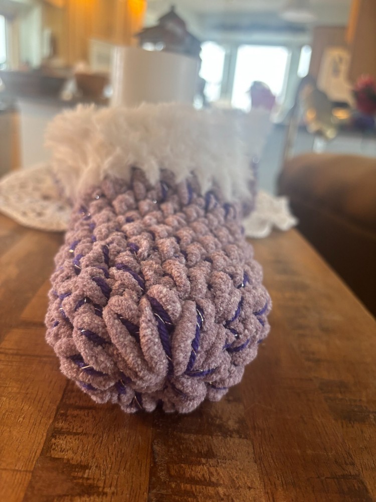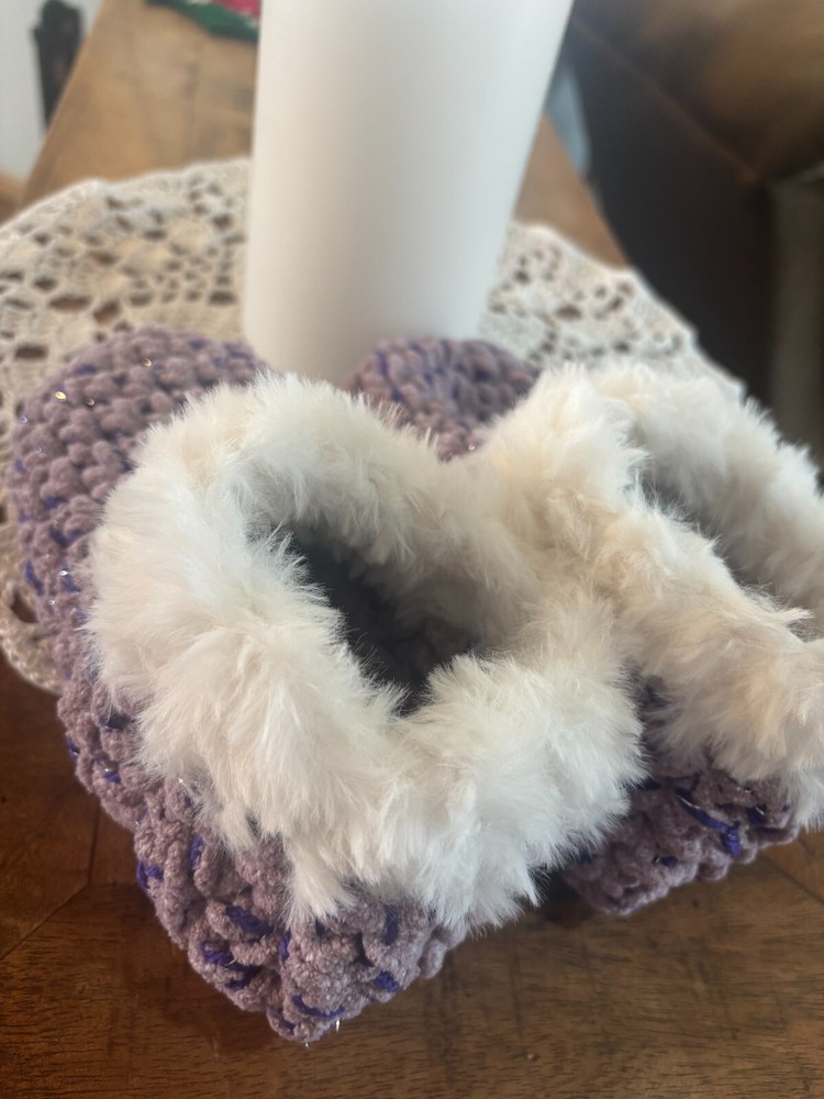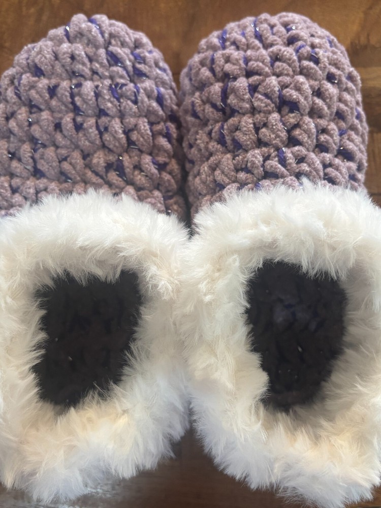 Crafted for comfort and coziness, these handmade slippers are a perfect addition to any woman's footwear collection. Designed in a striking purple shade (grape jelly) with a luxurious metallic weave, they exude a sense of warmth and relaxation. The plush fur trim adds a touch of elegance and softness, making these slippers a perfect choice for those chilled evenings at home.With a high heel height that provides a comfortable fit and a slip-on style for easy wear, these slippers come in a versatile medium size suitable for shoe size 7-9. The durable acrylic upper material ensures longevity, while the crochet fabric type offers a unique texture that is both visually appealing and gentle on the feet. Enjoy the perfect blend of style and comfort with these charming handmade slippers. FREE SHIPPING!