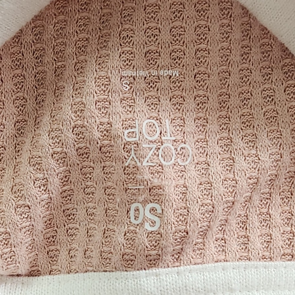 So Cozy Top Dusty Rose Size Small. Some slight fuzziness but otherwise in good condition. Super soft. 63% Polyester, 34% Rayon, 3% Spandex, Pull Over, Long Sleeve Round Neckline and hemline Super soft Waffle knit Oversized Pit to pit 19" Length 28" Measurements are lay flat and approximate. My home is smoke and pet free.