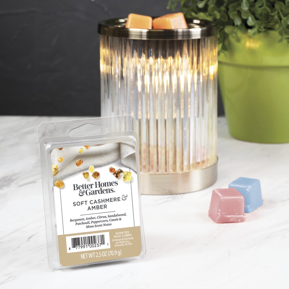 Store New Arrivals Add to Favorite View Feedback Contact Soft Cashmere Amber Scented Wax Melts, Better Homes & Gardens, 2.5 Oz (5-Pack) Description Brand Better Homes & Gardens Model 032-002-45250 Assembled Product Weight 2.5 oz Contained Battery Type 1 Manufacturer Part Number 032-002-45250 Color Off-White Scent Soft Cashmere Amber Assembled Product Dimensions (L x W x H) 6.00 x 4.25 x 4.25 Inches Highly fragranced Releases a soothing fragrant scent Replace wax melts when fragrance is gone Easy clean up No flame or soot residue Wax can be recycled or reused Use with Electric Wax Warmer Assortment of Better Homes & Gardens Scented Wax Melts & Wax Melt Warmers available Better Homes & Gardens 2.5 oz Soft Cashmere Amber Scented Wax Melts fill your home with a fresh and inviting aroma immediately upon melting. The Soft Cashmere Amber & scent is an intriguing harmony of warm cashmere, ambered sandalwod, earthy patchouli, and spicy peppercorn balanced by fresh cassis, elegant musks, dewy moss, and a sparkle of cool citrus & The scent captures a gentle fragrance that is widely appealing and contributes to a warm and inviting atmosphere. The second they start melting, they release a pleasant, soothing scent into the air, freshening up the air and getting rid of odors, all without open flames. They can be recycled or reused once they have solidified and are easily cleaned since they don't produce any wick or soot. Divided into 6 cubes, simply break off a piece, add to your favorite electric wax warmer and enjoy. Combine your favorite Better Homes & Gardens wax fragrances to create a custom blend.(Wax Warmer Sold Separately) Instructions: Store in cool place. Wax will melt when warmed. May stain fabric and surfaces. May cause skin irritation. Avoid prolonged contact with skin. Do not add water to wax. After melting, wax may be stored in container for reuse Ingredients: Wax, Fragrance KEEP OUT OF REACH OF CHILDREN AND PETS WARNING: For use only with wax warmers that conform to UL Std 283 ABOUT US We offer the best prices around on high quality products. Our E-store includes media such as books, movies, music and games while offering electronics, toys, sporting apparel, clothing, tools, general home, garden items and more. SHIPPING We are always working hard to ensure your package arrives as soon as possible. Please understand that some factors like weather, high postal traffic, and the performance of shipping companies are outside of our control. We offer free shipping to the lower 48 states and ship within 3 business days of payment, usually sooner. We do not accept P.O. Boxes. Please provide a physical address. RETURNS We offer a 30-Day Return Policy on items which you are not completely satisfied with. You have the option for a full-refund or an exchange of the item. No returns are available on items shipped outside of the USA. PAYMENT We accept PayPal. CONTACT US This page content is yet to come Please ad us to your favorite seller and visit again later Thank You CUSTOMER SATISFACTION We try our very best to make sure every customer is completely satisfied. If there's a problem, message us! We're happy to help.