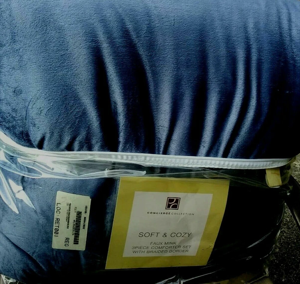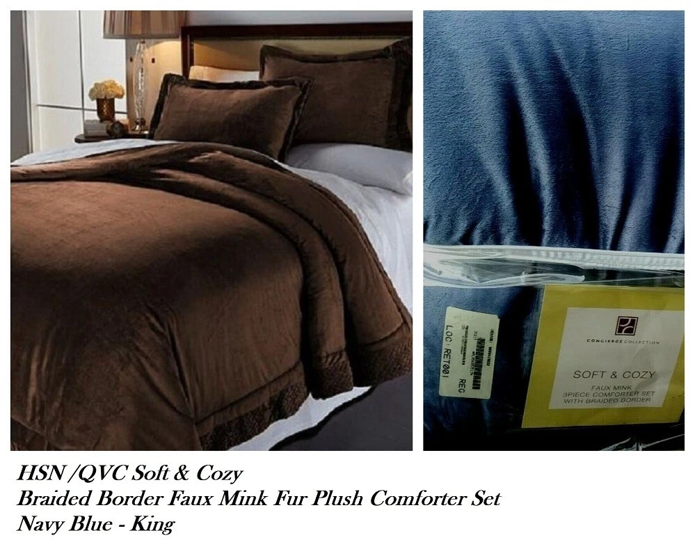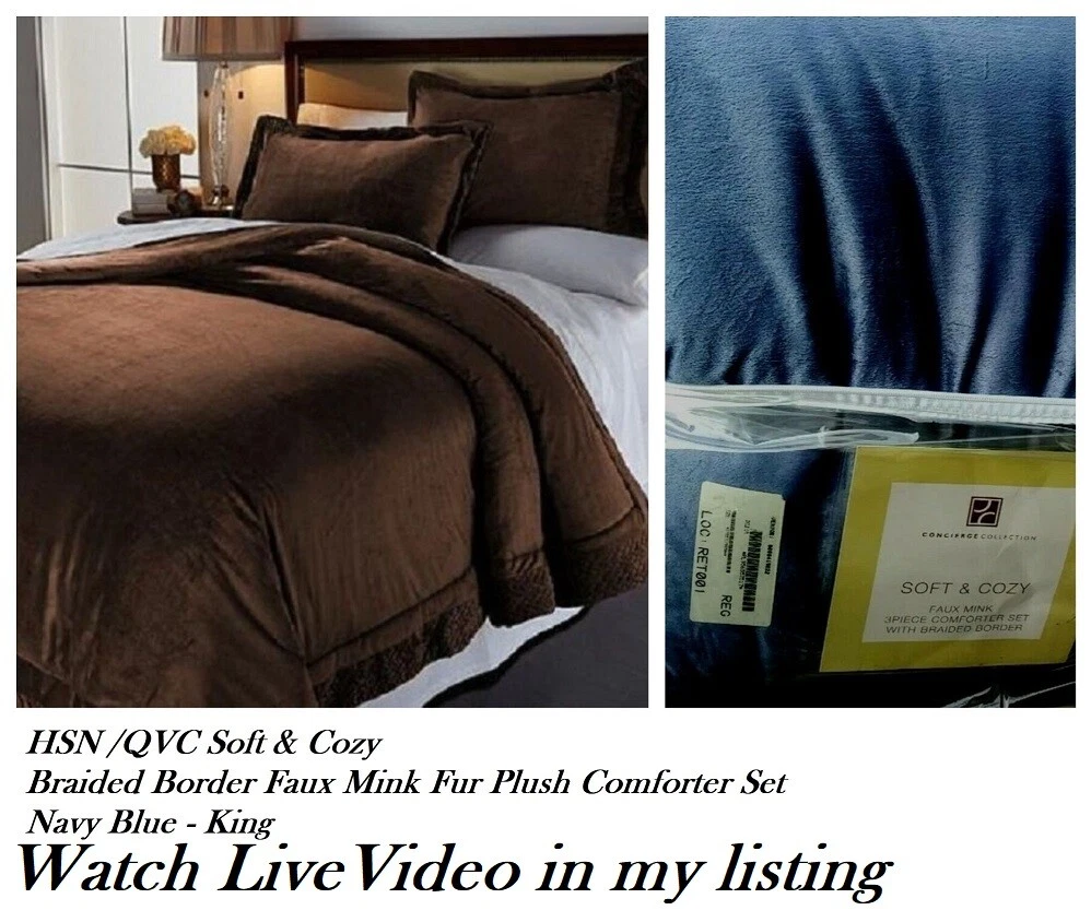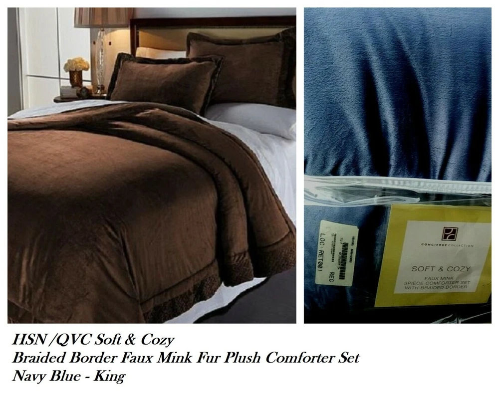 click on picture below 90 views • Dec 13, 2014 NOW PLAYING Mix - HSNtv YouTube Concierg MFRP: $179 plus Tax S&H Soft & Cozy Braided Border Faux Mink Fur Comforter Set Queen Navy Blue PLUSH - DOWN - ALTERNATIVE Machine wash tumble dry Hypo-allergenic Mink-like texture for a plush & soft feel Braided border adds a finished touch Coordinated comforter & shams for easy styling Rich soft, faux fur off ers the look & comfort of real fur Adds drama & elegance to your bedding Think mink the next time you're ready to cuddle up Wrap yourself in this irresistible faux mink bedding, & you'll soon be cocooning in softness & security. Coordinating shams braided detail mean everything is covered from head to toe in this charming design. Now that's called pampering! I ALSO HAVE LISTED about us We sell overstocks major High End Department Stores & pass the saving on to you may or may not be factory folded Items may be open & tested or not in original package We do not accept P.O. BOXES lower 48 states only OUTER PACKAGE MAY OR MAY NOT BE MINT