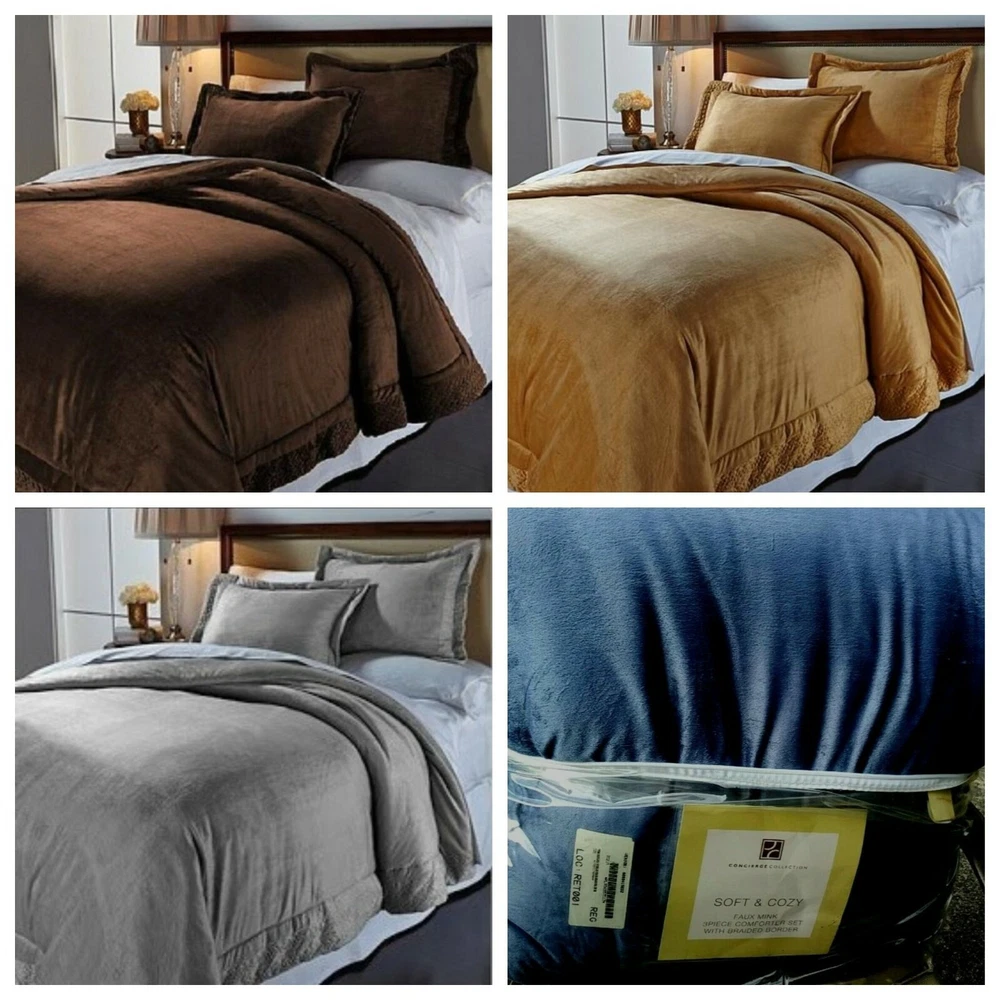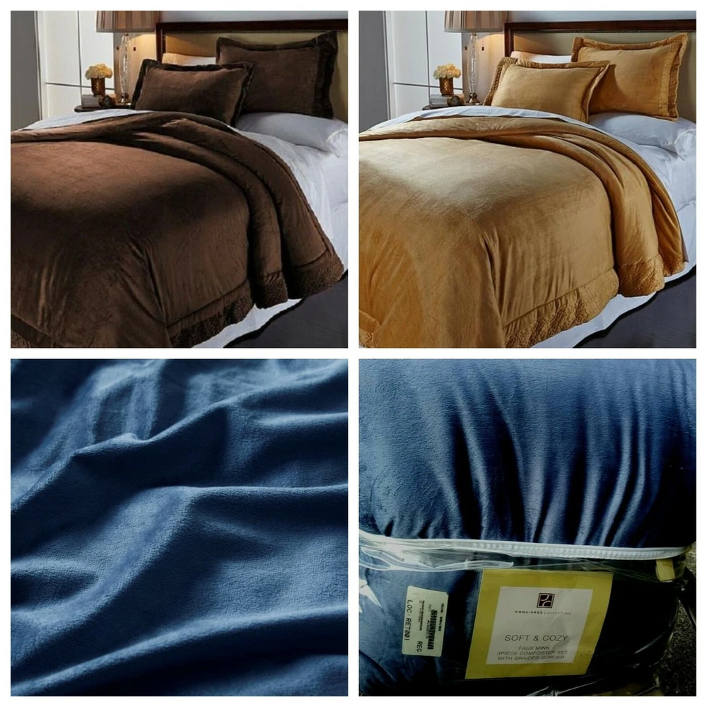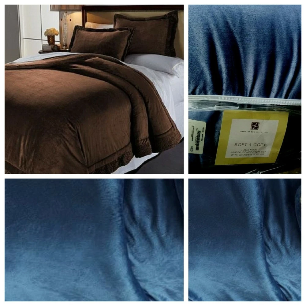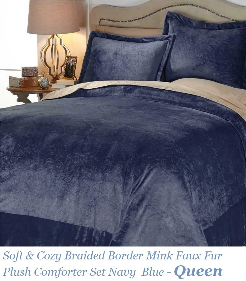 click on picture below 90 views • Dec 13, 2014 NOW PLAYING Mix - HSNtv YouTube Concierg MFRP: $179 plus Tax S&H Soft & Cozy Braided Border Faux Mink Fur Comforter Set Queen Navy Blue PLUSH - DOWN - ALTERNATIVE Machine wash tumble dry Hypo-allergenic Mink-like texture for a plush & soft feel Braided border adds a finished touch Coordinated comforter & shams for easy styling Rich soft, faux fur off ers the look & comfort of real fur Adds drama & elegance to your bedding Think mink the next time you're ready to cuddle up Wrap yourself in this irresistible faux mink bedding, & you'll soon be cocooning in softness & security. Coordinating shams braided detail mean everything is covered from head to toe in this charming design. Now that's called pampering! I ALSO HAVE LISTED about us We sell overstocks major High End Department Stores & pass the saving on to you may or may not be factory folded Items may be open & tested or not in original package We do not accept P.O. BOXES lower 48 states only OUTER PACKAGE MAY OR MAY NOT BE MINT