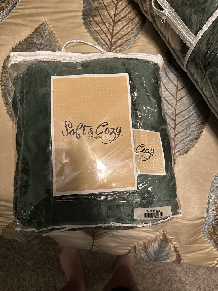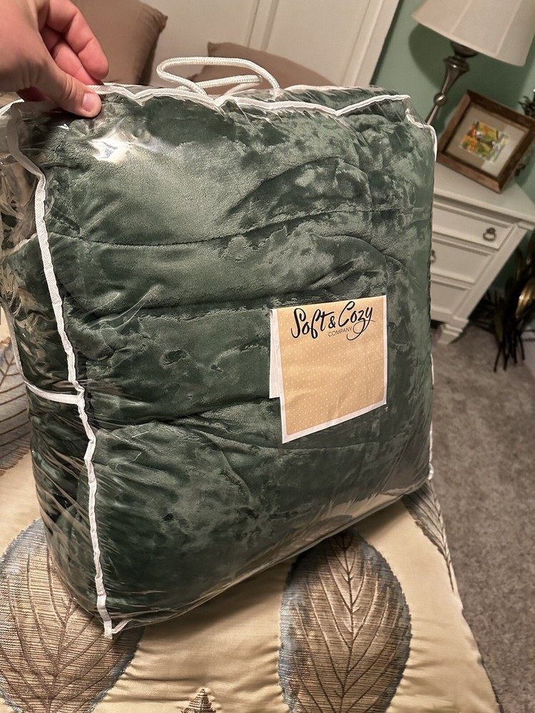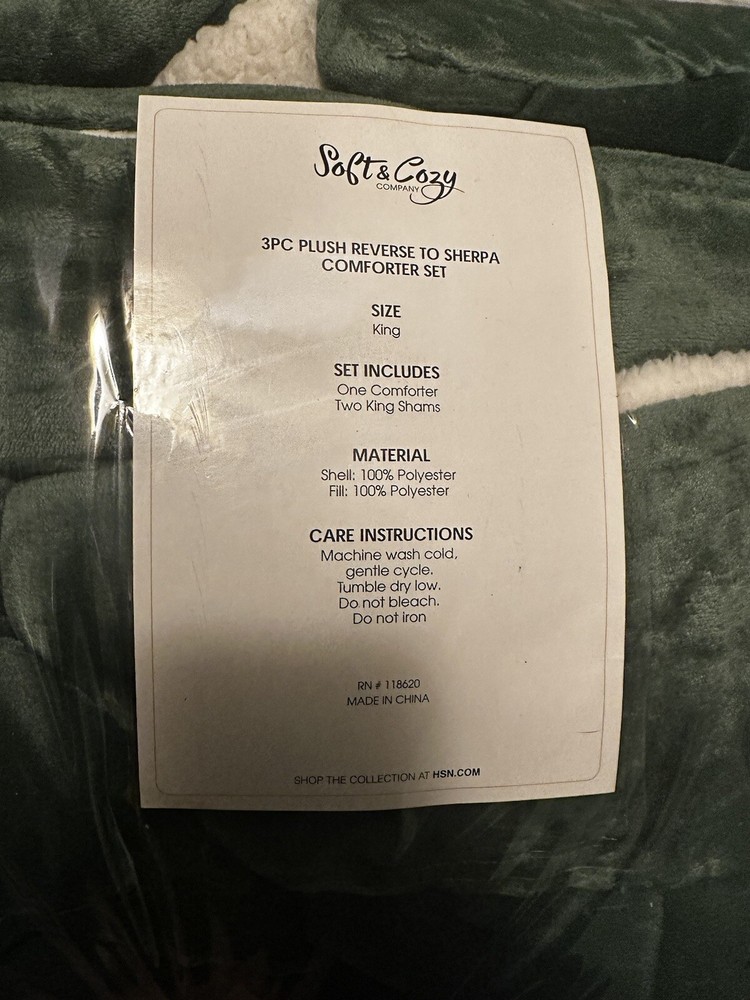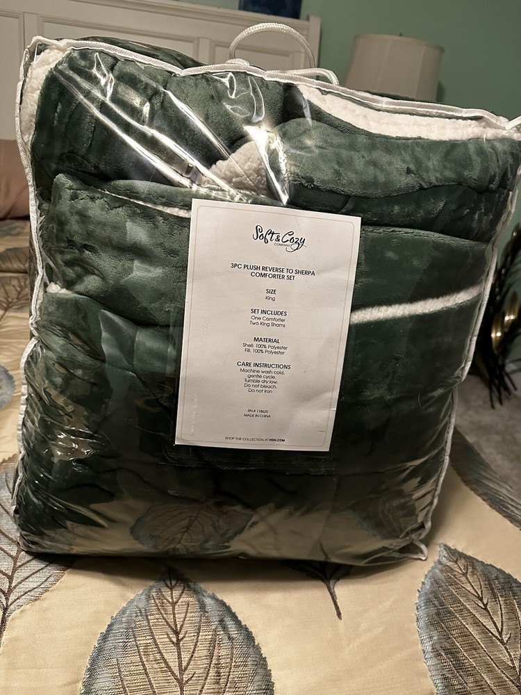 Soft & Cozy Company King Sherpa Set and Throw in Hunter Green. See photos for details. Brand new hunter green king reversible Sherpa set includes 1 king comforter and 2 shams. Also included is a new 50” x 60” matching throw. Brand new, never opened