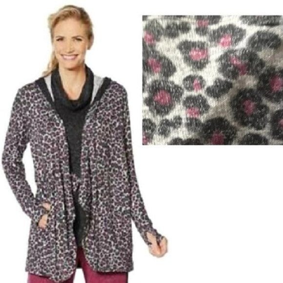 Warm & inviting fabric, soft & cozy just like it's company name Long sleeves with thumb hole Hood, seam side pockets Open front Rayon, polyester, spandex Machine wash, tumble dry Approx: bust 41" length 31 1/2" Colors of dark gray, light gray, plum Pet/Smoke free environment THIS IS NEW!!