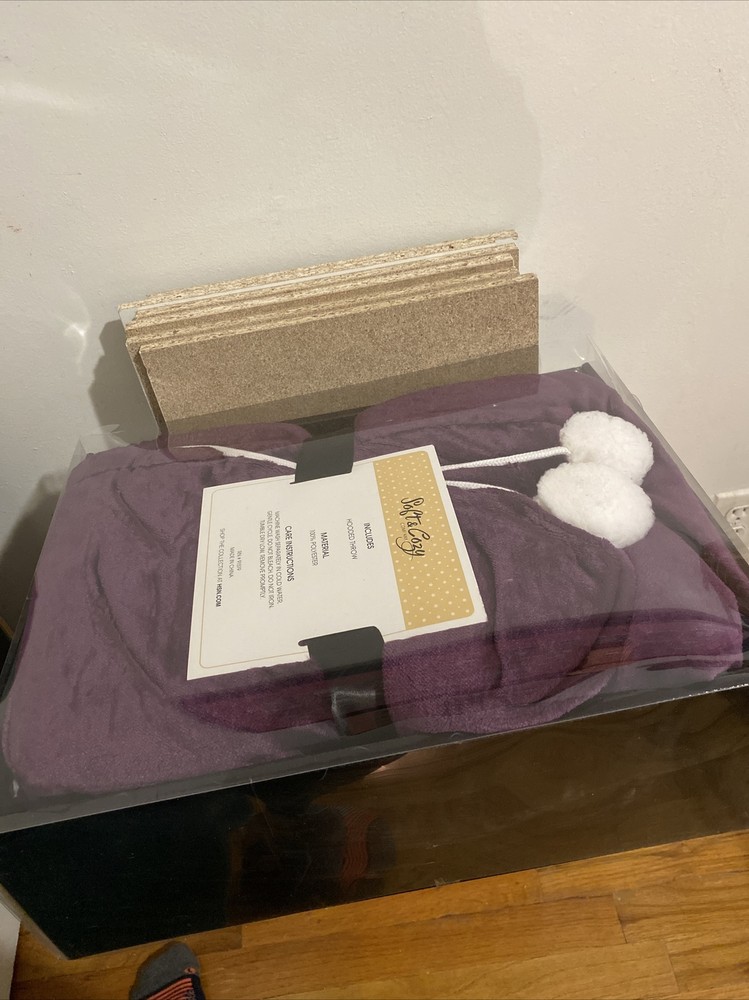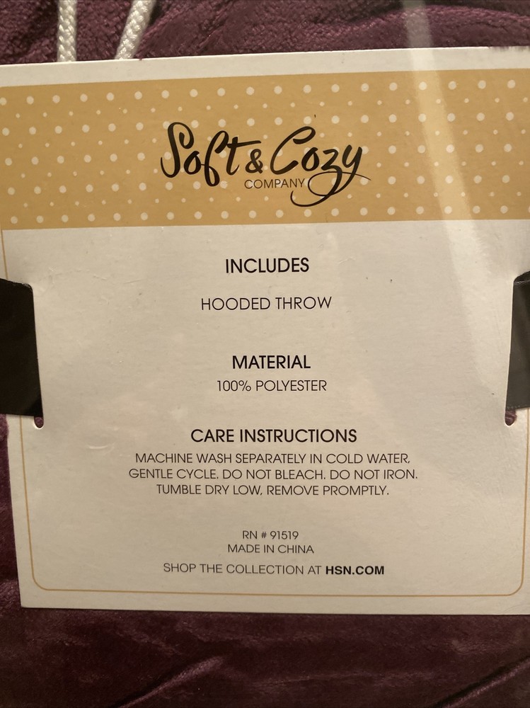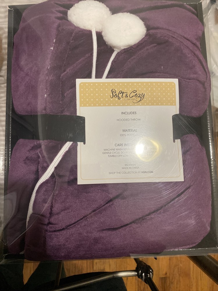 Soft N Cozy Throw PURPLE Color In Package HSN. Condition is "New with tags". Shipped with USPS Priority New In Package From HSN Home Shopping Network, Soft N Cozy Throw Blanket is P URPLE HSN-50-4370 Polyester. Comes exactly as shown. It is a BODY THROW with HOOD and POM POM **SEC16**