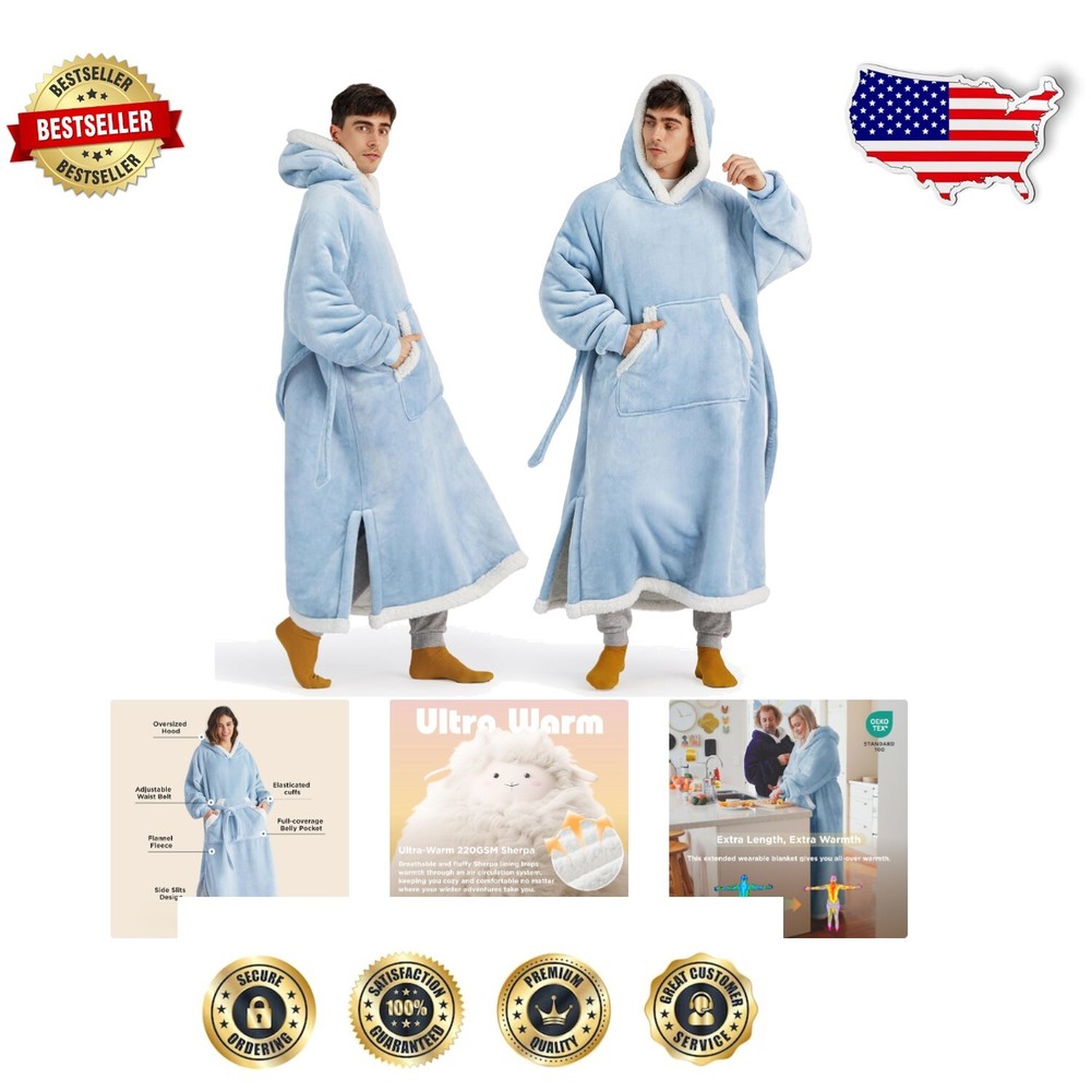 Soft Polyester Blanket Hoodie with Pockets - Stylish Comfort for All Occasions ‹ › ‹ › ‹ › ‹ › ‹ › ‹ › ‹ › Soft Polyester Blanket Hoodie with Pockets Stylish Comfort for All Occasions 100% Polyester - Ultra-soft and cozy material. Imported. A Gift for Your Loved Ones: Present the ultimate cozy blanket hoodie, ideal for special occasions. This versatile piece is perfect as: Gifts for women, gifts for mom, or birthday surprises. A thoughtful choice for Christmas gifts for women. Perfect gifts for teen girls, men, wives, or sisters. Delivered in an elegant gift box, this is the ideal winter gift for anyone seeking comfort and warmth. Full-body Warmth: An extra-long design provides cozy and breathable warmth from head to toe throughout winter. Wearable blanket features a convenient side-slit for added maneuverability. Adjustable and Versatile: Included adjustable waist belt allows for a customized fit—tighten for activity, or remove for ultimate coziness. Deep side pockets are perfect for storing small items or keeping hands warm. Ribbed cuffs provide a snug fit that locks in warmth. Perfect for working from home, reading, watching TV, or lounging. Find the Perfect Fit with Three Available Sizes: Unlike traditional one-size-fits-all designs, our oversized wearable blanket hoodie comes in three sizes to suit all body shapes, ensuring you find the perfect cozy fleece hooded blanket sweatshirt. Looking for the Perfect Gift? This cozy and stylish option makes an ideal present for Anniversaries, Christmas, Mother's Day, Father's Day, Valentine's Day, or Thanksgiving, adding warmth and comfort to every occasion and showing how much you care. Shipping Free & Fast Shipping - We offer free shipping to most of the USA with a normal delivery time of 3-7 days. However, due to the current situation, additional delivery time (up to 3 weeks) may be required for some items. Alternative Carriers - We may use alternative carriers (e.g. USPS, FedEx, UPS, etc.) to ensure your package arrives safely and on time. Due to the use of multiple carriers, we are unable to provide a tracking number automatically. Handling Time - Orders are processed and shipped within 1-2 business days of receiving cleared payment. Shipping Restrictions - Shipping to Alaska, Hawaii, Puerto Rico, Guam, and other US territories may incur shipping charges or delivery restrictions. Please contact us before ordering, or your order can be refunded/cancelled. State Restrictions - There may be restrictions based on your state of purchase. For example, certain items may not be shipped to California due to state regulations. Contact for Tracking Updates - If you require tracking updates or have any concerns about the delivery of your order, please feel free to contact us, and we will be happy to assist you. Return 30-Day Hassle-Free Returns - We want you to be completely satisfied with your purchase. If you are not, you can return the item within 30 days of receiving it for a full refund or exchange. Easy Return Process - To start a return, simply contact us and we will provide you with a prepaid return shipping label and detailed instructions. Restocking Fee - There are no restocking fees for returns. However, the buyer is responsible for return shipping costs if the return is not due to a seller's error. Refund Processing Time - Refunds will be processed within 5 business days of receiving the returned item in its original condition. Payment We accept all major credit cards, PayPal, and Apple Pay for your convenience. Your payment information is secure and encrypted to ensure a safe and seamless transaction. Please complete your payment within 3 days of purchase to avoid any delays in shipping. Feedback Your feedback is extremely important to us. We strive to provide the best products and customer service possible. If you are satisfied with your purchase, please take a moment to leave us a positive review. If you have any concerns or issues with your order, please contact us before leaving negative feedback. We are committed to resolving any problems and ensuring your satisfaction. Contact Us If you have any questions or concerns, please feel free to reach out to our customer support team. You can contact us through the eBay messaging system. We are available Monday to Friday, 9:00 am to 5:00 pm EST, and we will do our best to respond to your inquiry within 24 hours. Buy it now and enjoy a pleasant shopping experience! UPC: Not Set Item Length: Not Set Item Width: Not Set Unit Quantity: 4.19 Material: Polyester Features: Breathable,Machine Washable,Adjustable,Oversize,Deep Pockets,Cozy,With Hood,Ribbed Cuffs Theme: Not Set Character: Not Set Care Instructions: Machine Wash Department: Unisex Adult Room: Bedroom,Living Room Labels & Certifications: Not Set Brand: Unbranded Size: Standard Type: Hooded Blanket Color: Sky Blue Character Family: Not Set Pattern: Not Set Style: Cozy MPN: Not Set Country/Region of Manufacture: Not Set Shape: Rectangular Insulation: Warm Closure Type: No Closure GSM (Grams per Square Meter): Over 800 Drop Length: Not Set Model: Not Set Product Line: Not Set Thread Count: 200 or Less Unit Type: lb Personalize: Not Set
