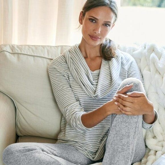 This sweater is unbelievably cozy—like wearing a warm hug! The soft fabric and loose cowl neck make it perfect for lounging or layering. The stripes add a cute touch, and the fit is comfortably relaxed without being oversized. It’s in flawless condition, feels high-quality, and drapes beautifully. Love how lightweight yet warm it is—ideal for chilly nights!