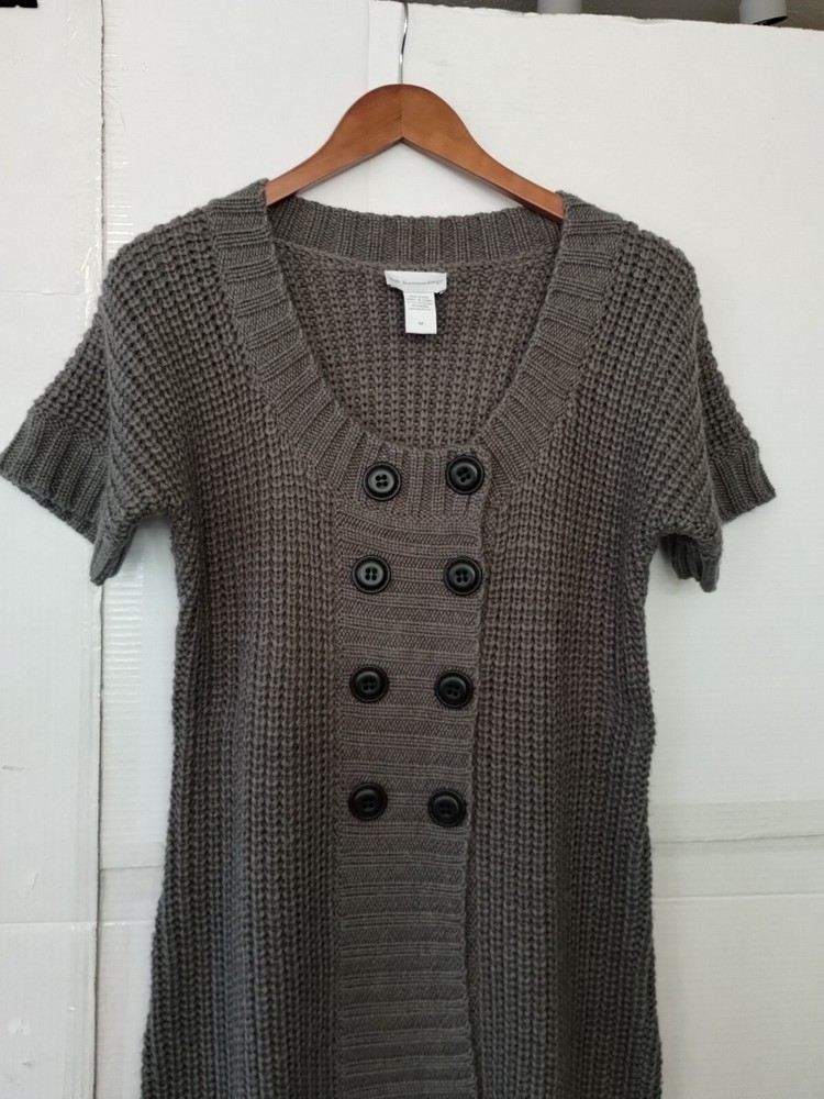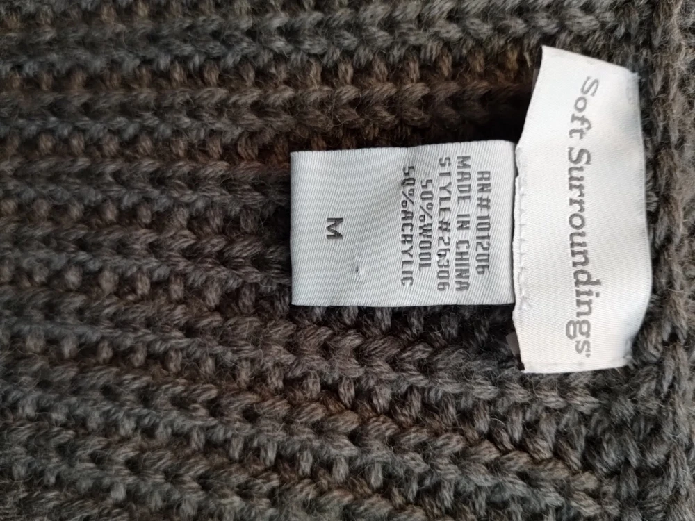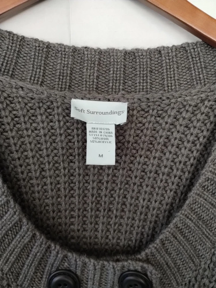 Elevate your casual look with this Soft Surroundings gray tunic/dress. Made of a comfortable and cozy knit fabric, this top is perfect for any casual occasion. The short sleeves and round neckline add a touch of elegance, while the solid pattern and academic style give it a classic look. This tunic is designed for women, with a regular size type and a medium size. It can be paired with any bottoms for a chic and stylish outfit. The material is a combination of wool and acrylic, making it soft and durable. Get this Soft Surroundings tunic and enjoy the comfort and style it brings to your wardrobe. Pit to pit 17 inches Length 35 inches 50% wool