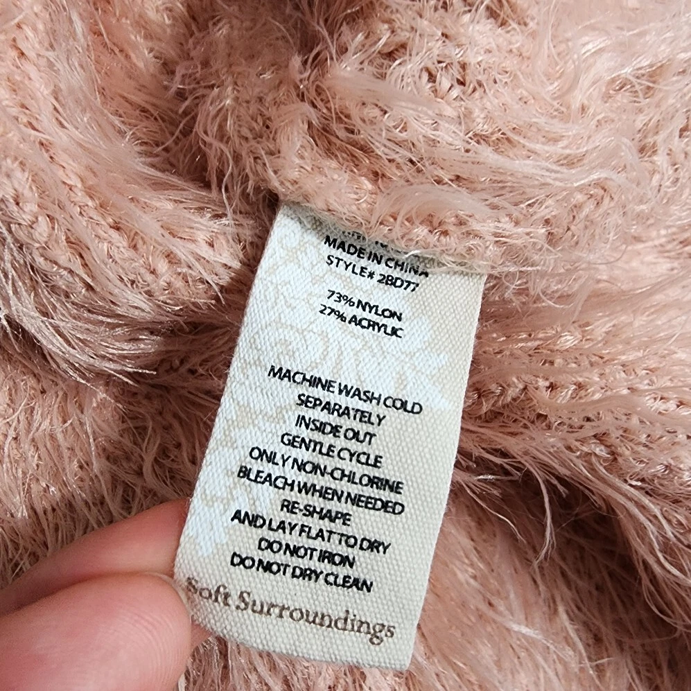 Soft Surroundings Small SWEET Pink Blush Fuzzy Soft Mock Neck Sweater. Great preowned condition with no apparent flaws. Please see all images for details and be sure to zoom in. -Armpit to armpit about 18" across -Shoulder to bottom about 26.5" -Soft and cozy material -Mock neck -Little longer in the back *All measurements are approximate Please consider that all my items come from estate sales, auctions and garage sales meaning that they are used items. I am not familiar with the environment that they come from. I do my best to describe the item(s) and provide multiple pictures. If you have any questions on an item be sure to email before purchasing. Also, if you want to purchase multiple items I combine shipping just make sure you let me know before submitting payment. I do not accept returns but I strive for 100% positive feedback so if there is an issue with your item please contact me before giving a negative feedback.