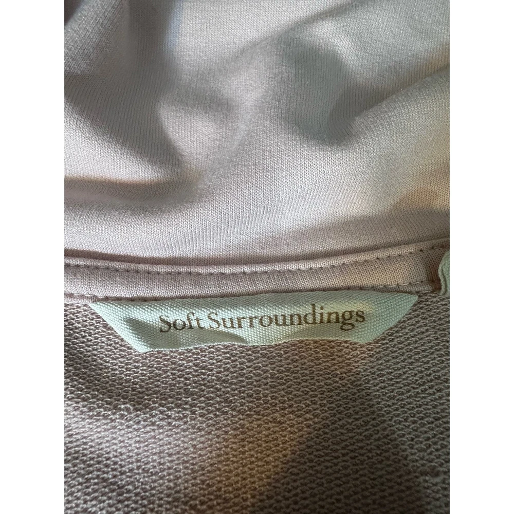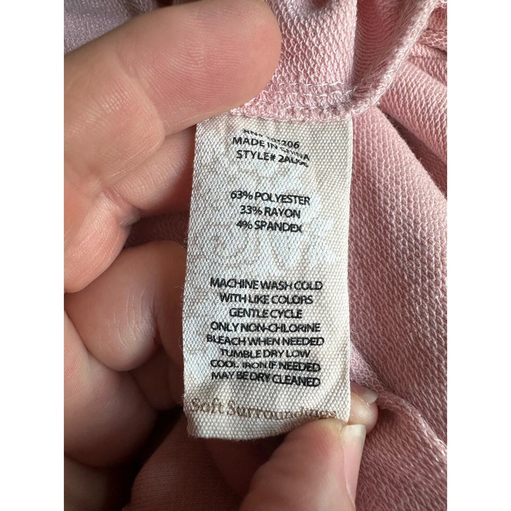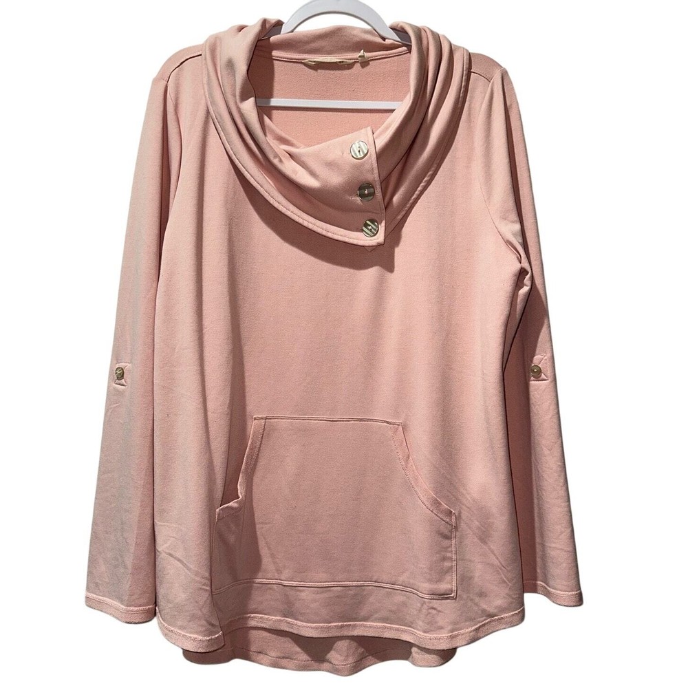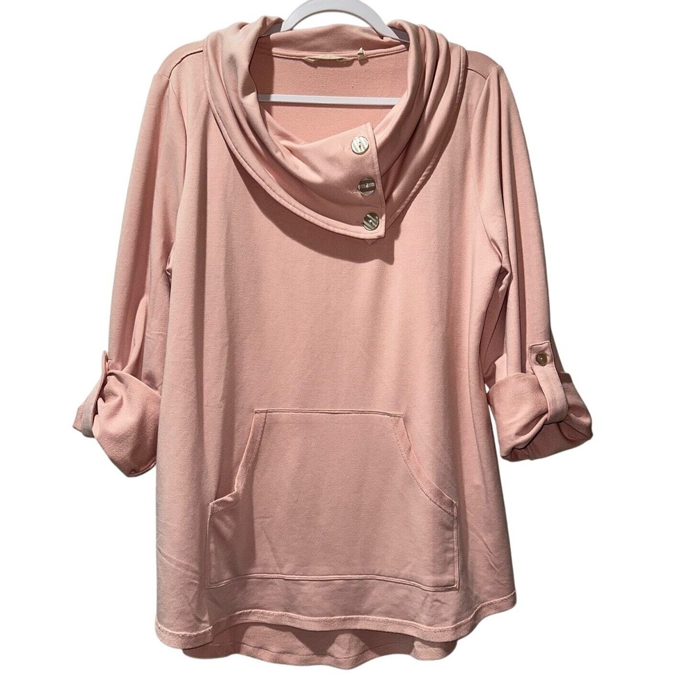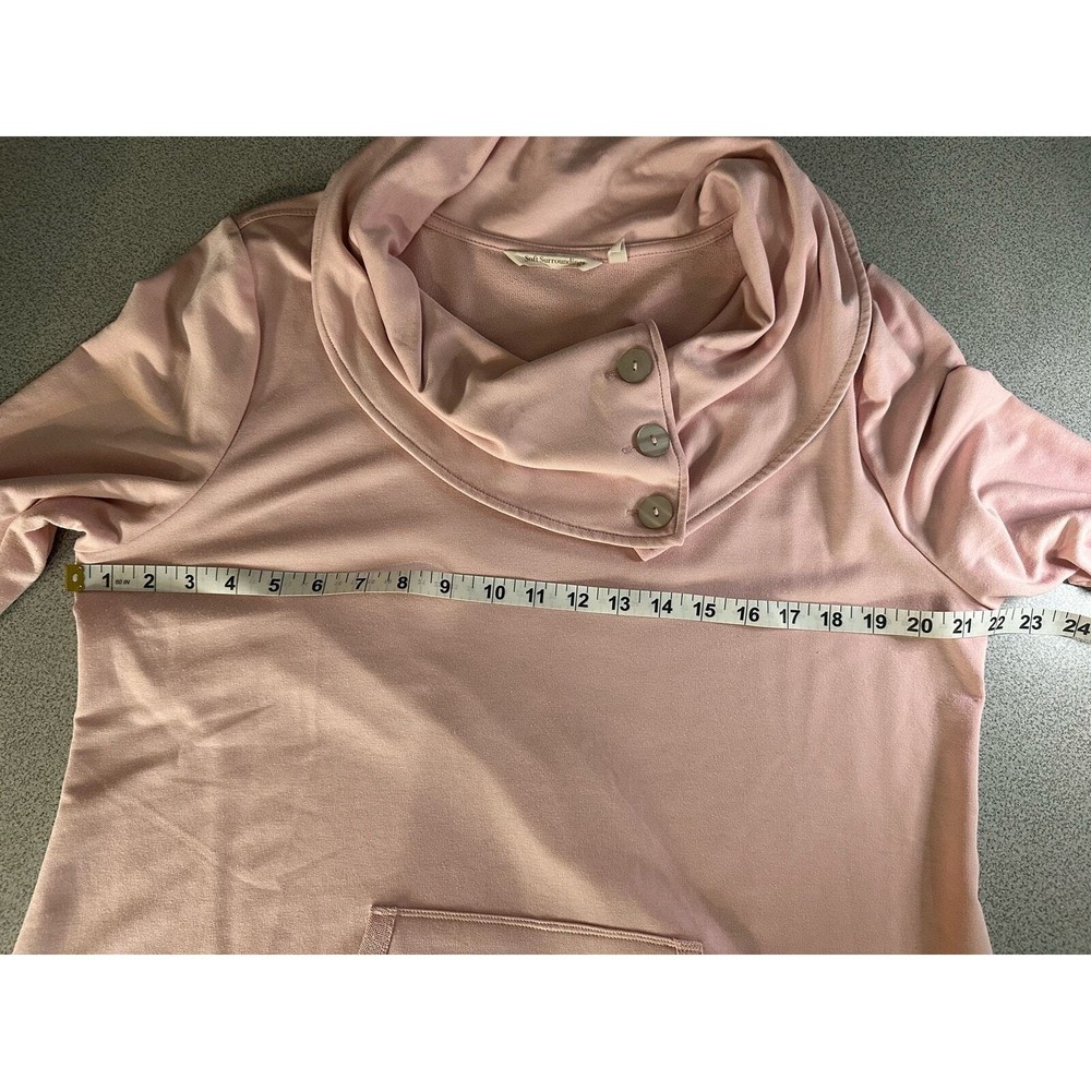 <![CDATA[<div>Soft Surroundings Size: Large Kassidy Cowl Neck Pullover Color: Pink Cowl Neck with button details Roll Tab Sleeves can be worn as a 3/4 or long sleeve Kangaroo front pocket 63% polyester, 33% rayon, 4% spandex Slight high low hem, 27.5" front 29.5" back Excellent pre-loved condition, no flaws, like new