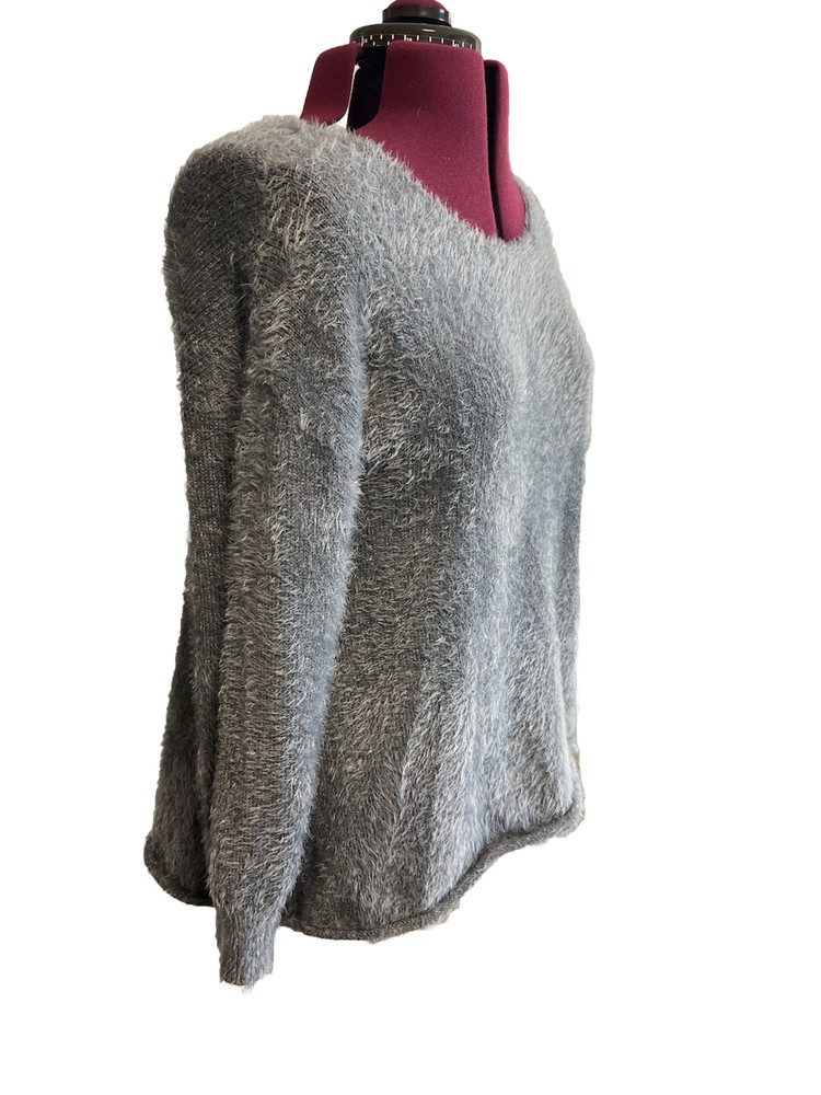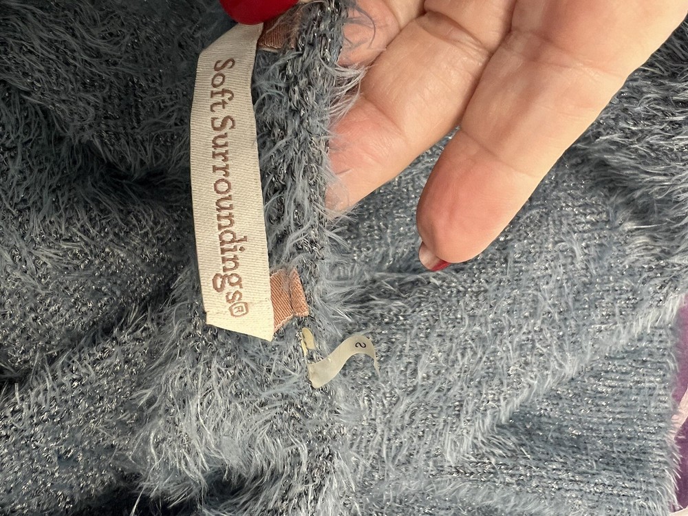 This Soft Surroundings sweater is perfect for any occasion, whether you're dressing up for a party or keeping it casual for work or travel. The scoop neck and asymmetrical hemline add unique accents to the solid blue color, while the faux fur material and long sleeves keep you cozy in the fall, winter, and spring seasons. The collarless, pullover style with stretch features make it a comfortable fit for any body type, and it's available in a regular size for women. Pit to pit measures 24” and shoulder to hem front 27” and back 34” The sweater is made of a furry eyelash knit fabric type, but it's important to note that the garment care requires hand washing only. The brand is Soft Surroundings and it's a pre-owned item. Overall, this sweater is perfect for anyone who wants to stay warm and stylish without sacrificing comfort. Great for jeans or slacks. See treasurehuggersunlimited.com Seller will combine shipping