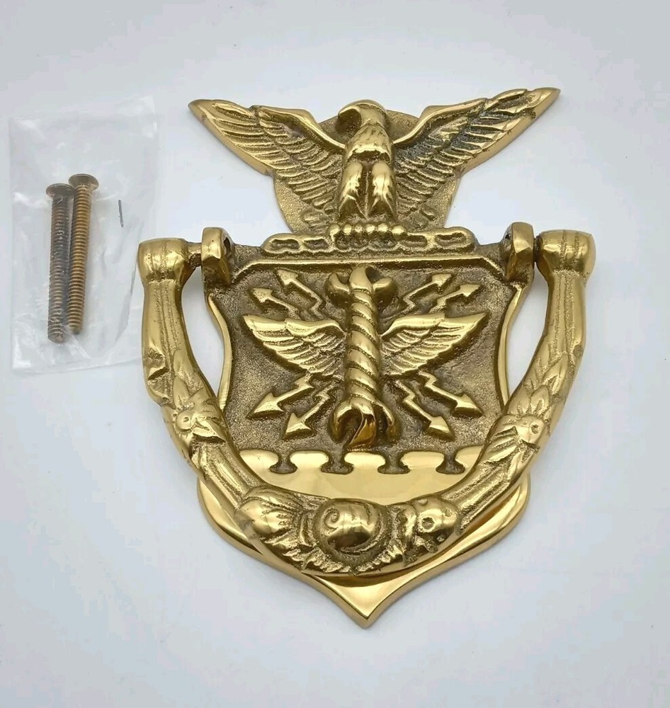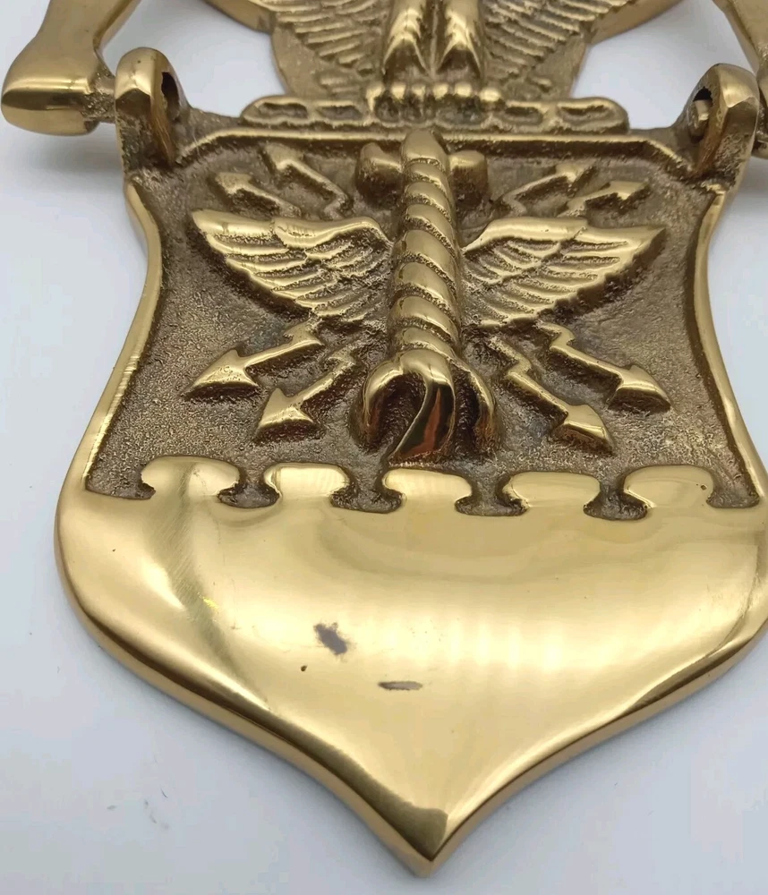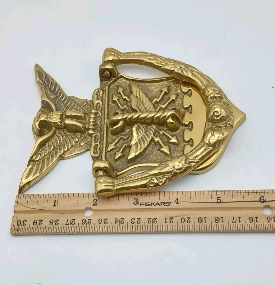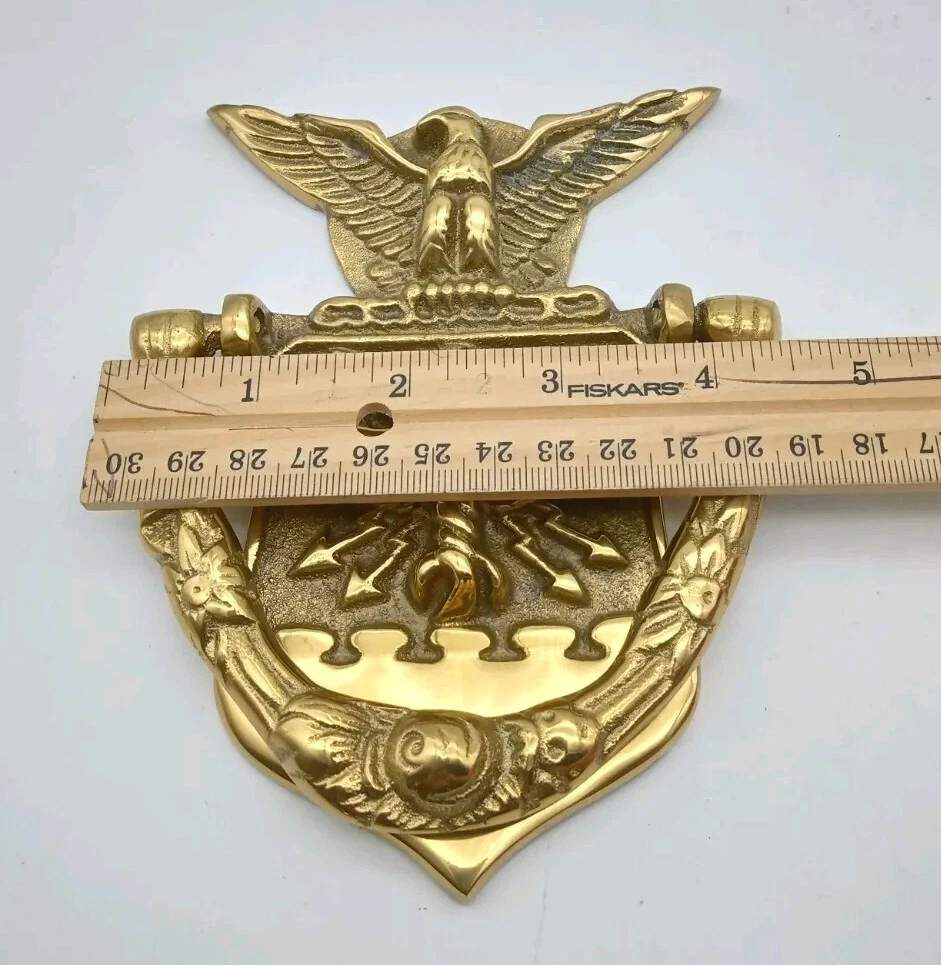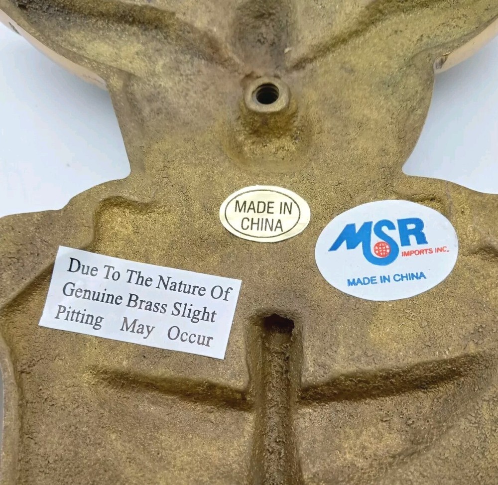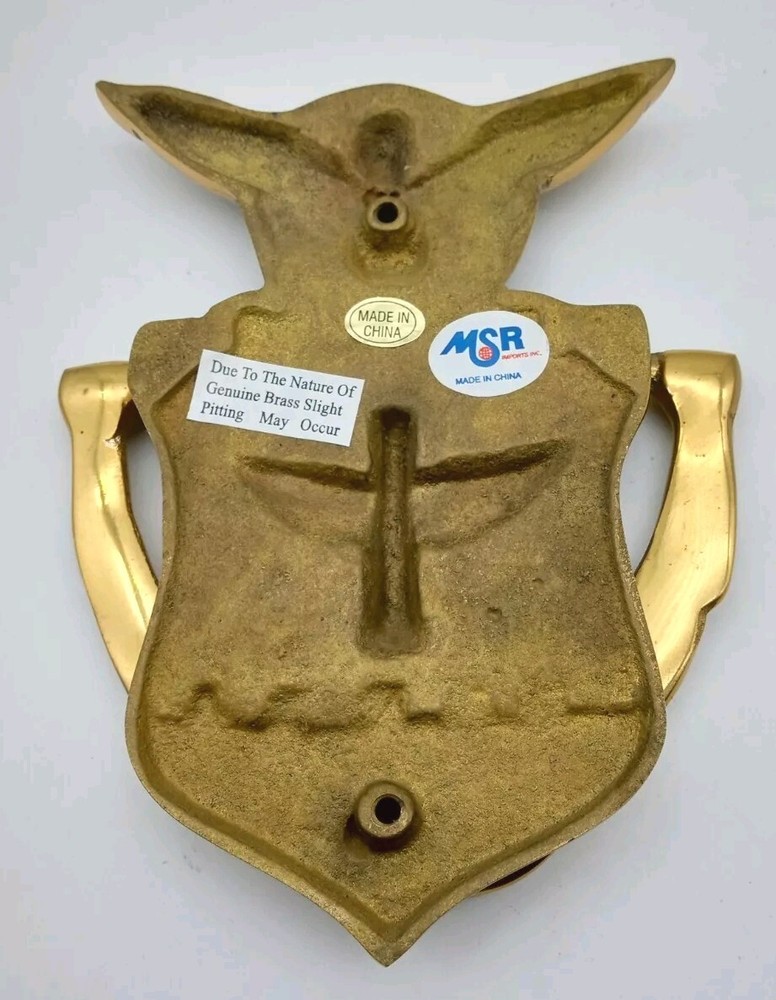 Listed as pre-owned but I don't think it has never been used. It has been sitting in a closet at my Dad's house for a while. It is a genuine brass door knocker. In overall good condition, it does have a couple of marks on front where knocker meets metal. See last photo. Screw hardware comes with it. Please view and examine all photos for item details and condition before buying.