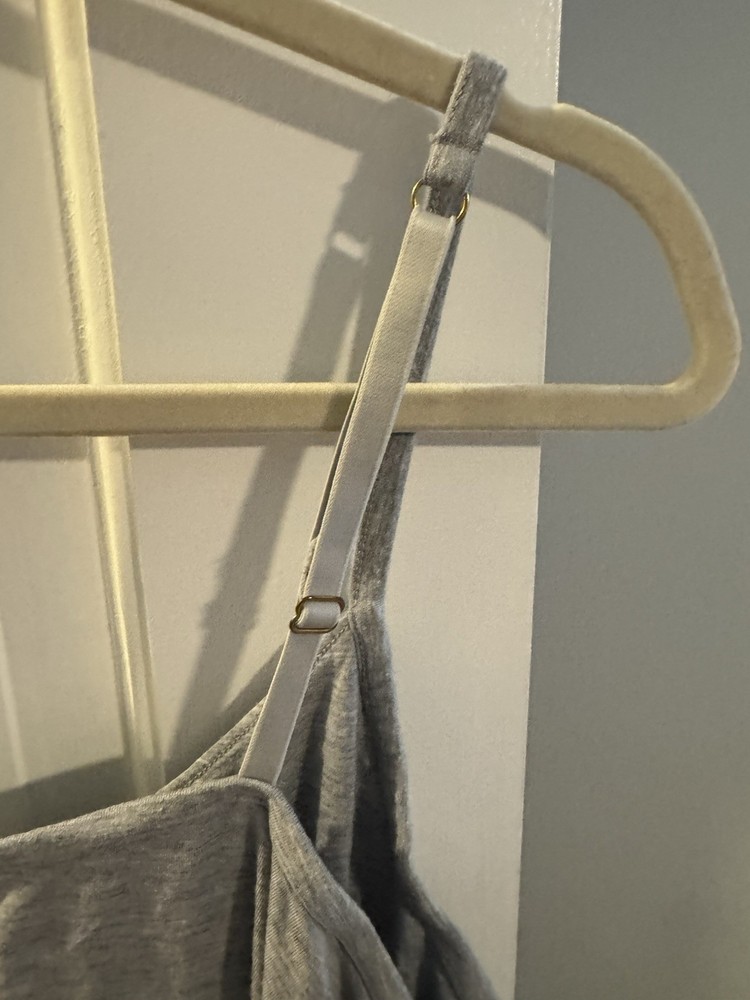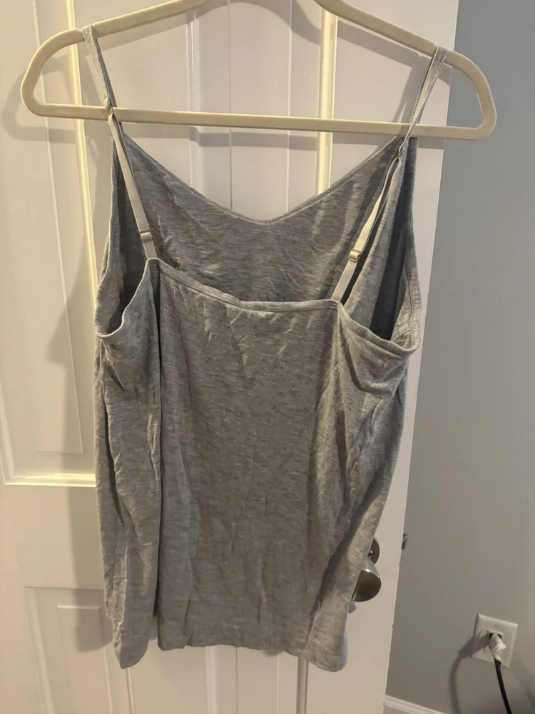 This sleep cami is so comfy and flattering! The built-in bra gives just the right support without being restrictive, and the soft fabric feels amazing against the skin. Love the V-neck for a touch of elegance, and the lightweight material keeps me cool all night. The fit is perfect—snug yet breathable—and the solid grey goes with everything. Even preowned, it’s in great condition. Perfect for lounging or sleeping in style!