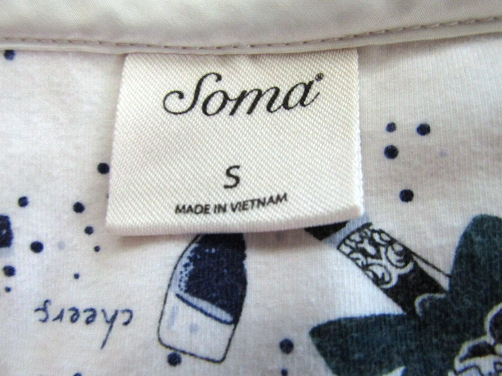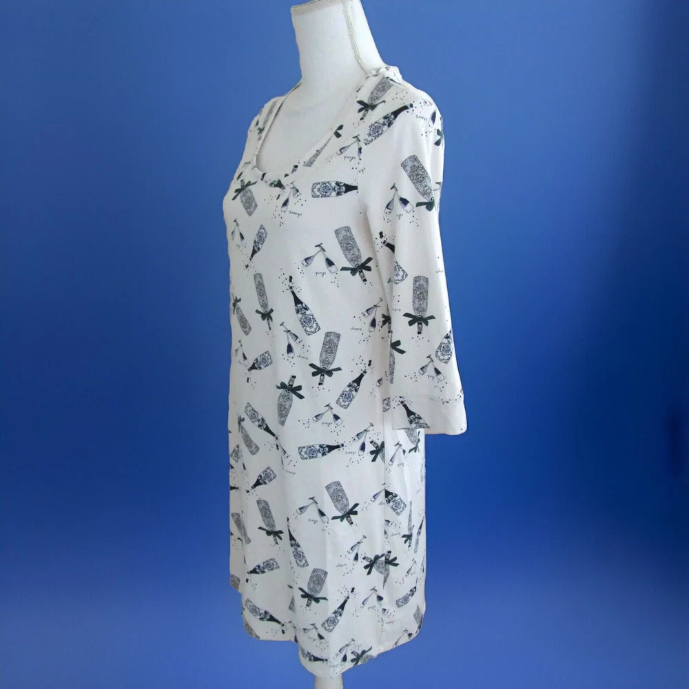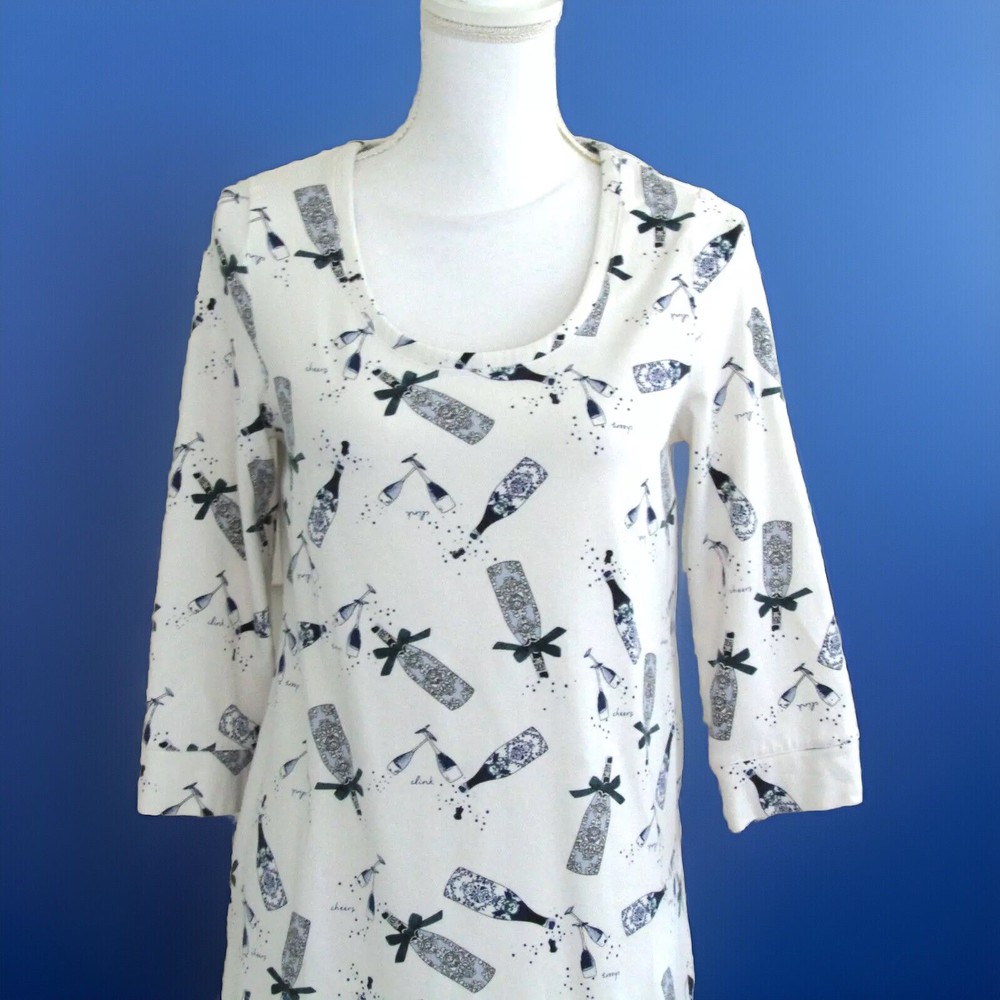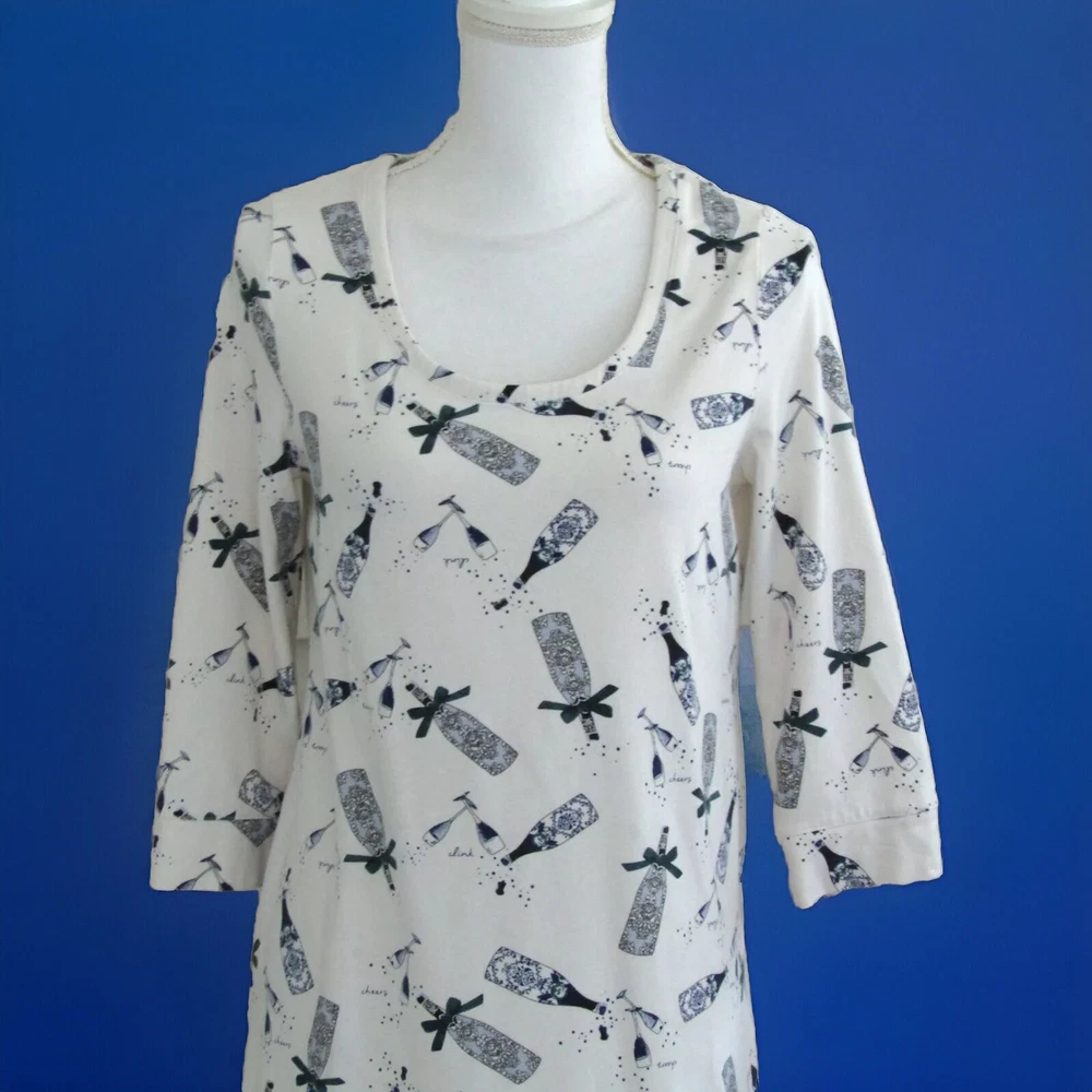 From Soma, a cute, cozy comfortable soft jersey knit sleepshirt done in an Ivory background with a print done in blues. Crafted with plenty of stretch and perfect length 3/4 sleeves. Great condition! Details Scooped neckline. 3/4 sleeve with banded cuff and piped details. Back of neckline reinforced with satin charmeuse binding. Approximately 35" from shoulder on body. 57% cotton, 38% modal, 5% spandex. Machine wash, cold. Size Small Suggested Measurements for a Size Small: Bust: 34.5"-35.5" Waist: 28"-29" Hips: 37.5"-38.5" Please measure a garment of your own to make sure this will fit.