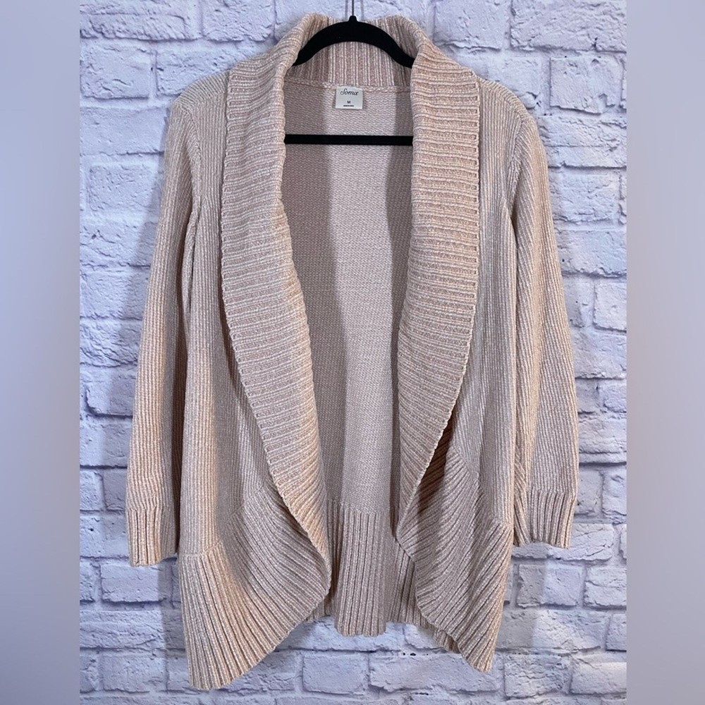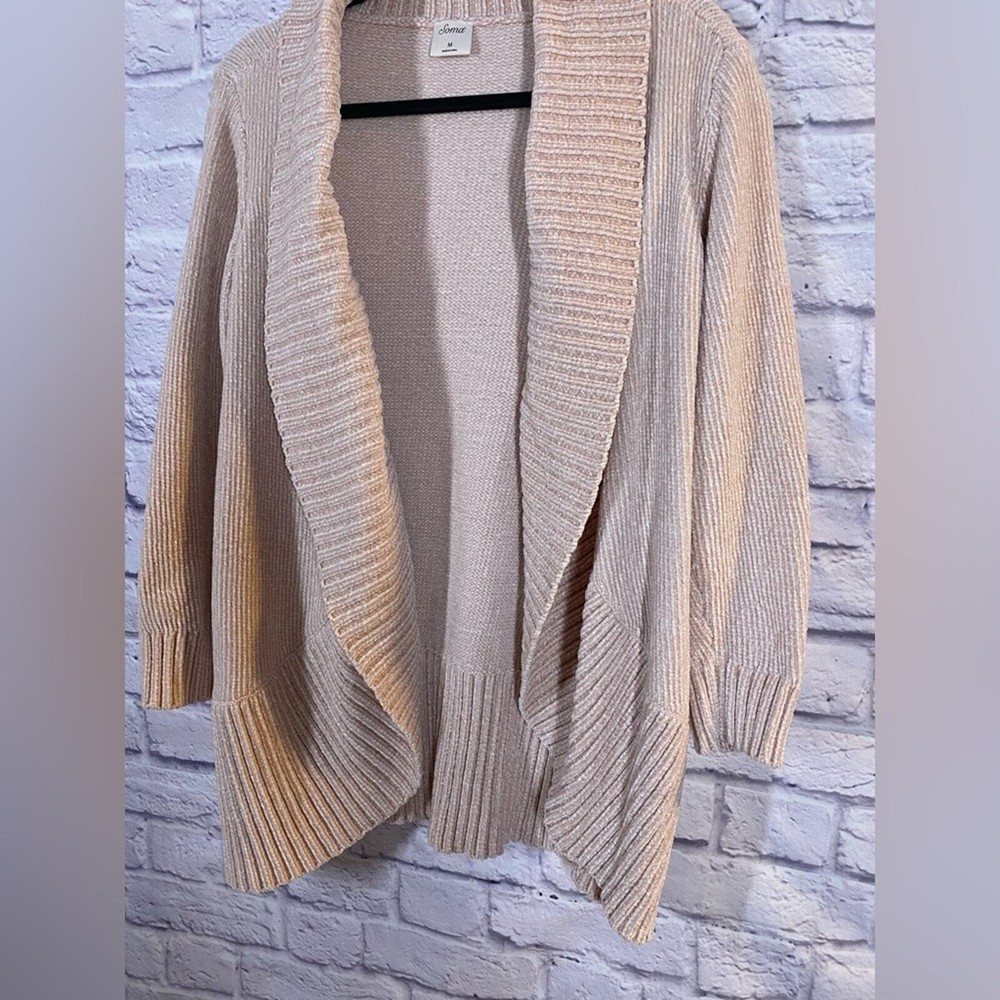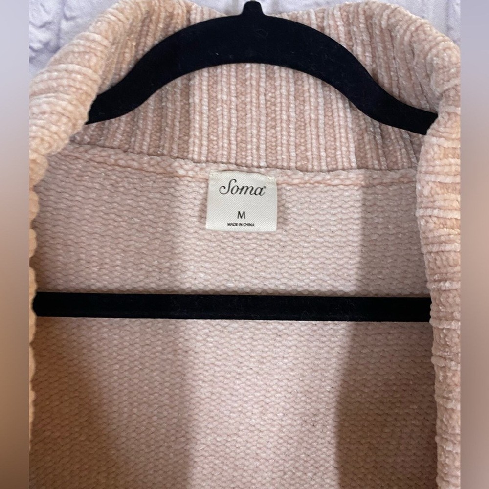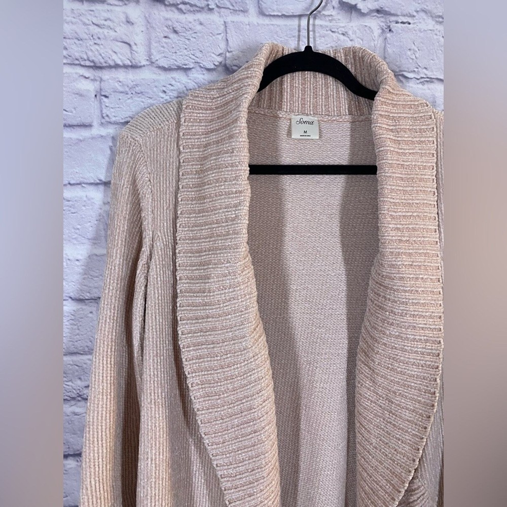 <![CDATA[<div>Soma Open Front Blush Pink Chenille Soft Knit Cozy Cardigan Sweater Size M Elevate your layering game with this Soma open-front knit cardigan in a versatile blush pink tone. Perfect for casual wear or adding a cozy touch to any outfit, this cardigan features a shawl collar and ribbed edges for added style. Made from 100% polyester, it ensures a soft and comfortable feel. Size medium and in excellent pre-loved condition, this piece is a must-have for transitional weather or chilly evenings. Keywords/Style Tags: Soma, cardigan, knitwear, open front, shawl collar, blush pink cardigan, cozy layers, casual chic, layering essential, size medium, polyester cardigan, versatile sweater, ribbed edges, soft knitwear, chenille