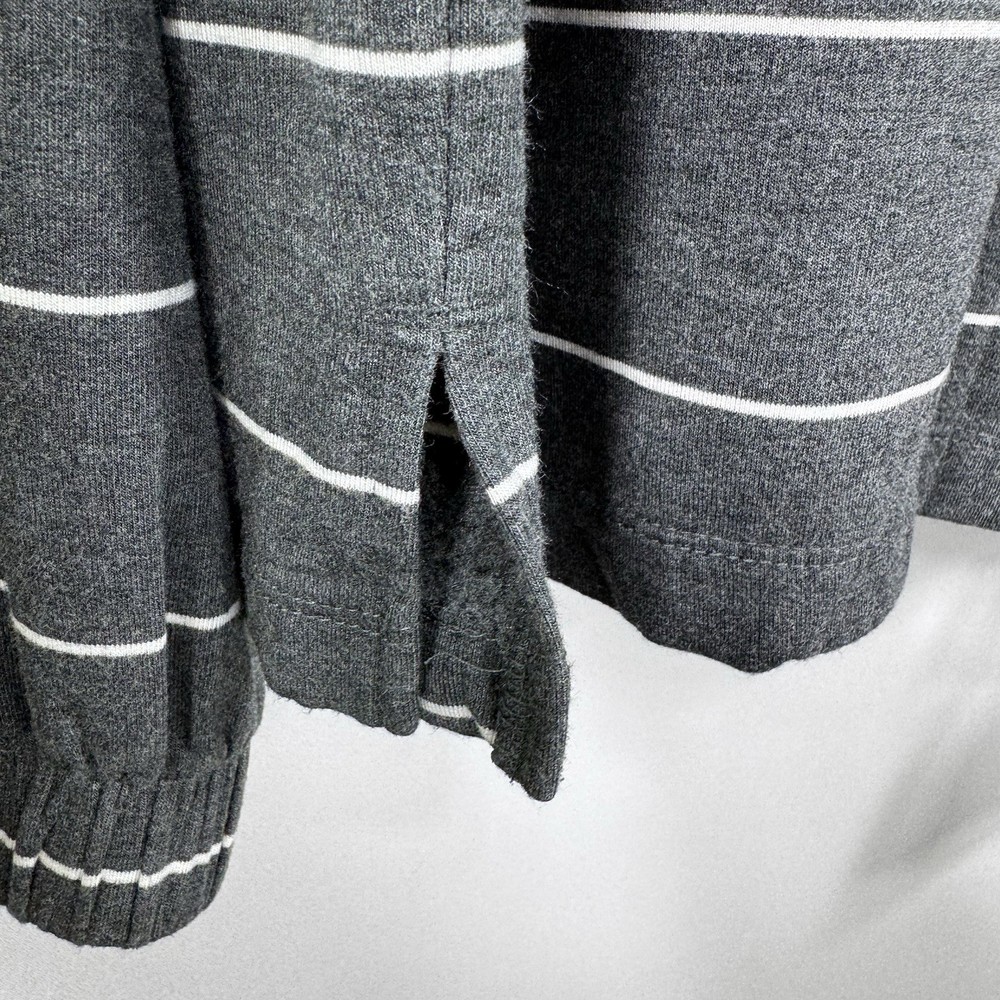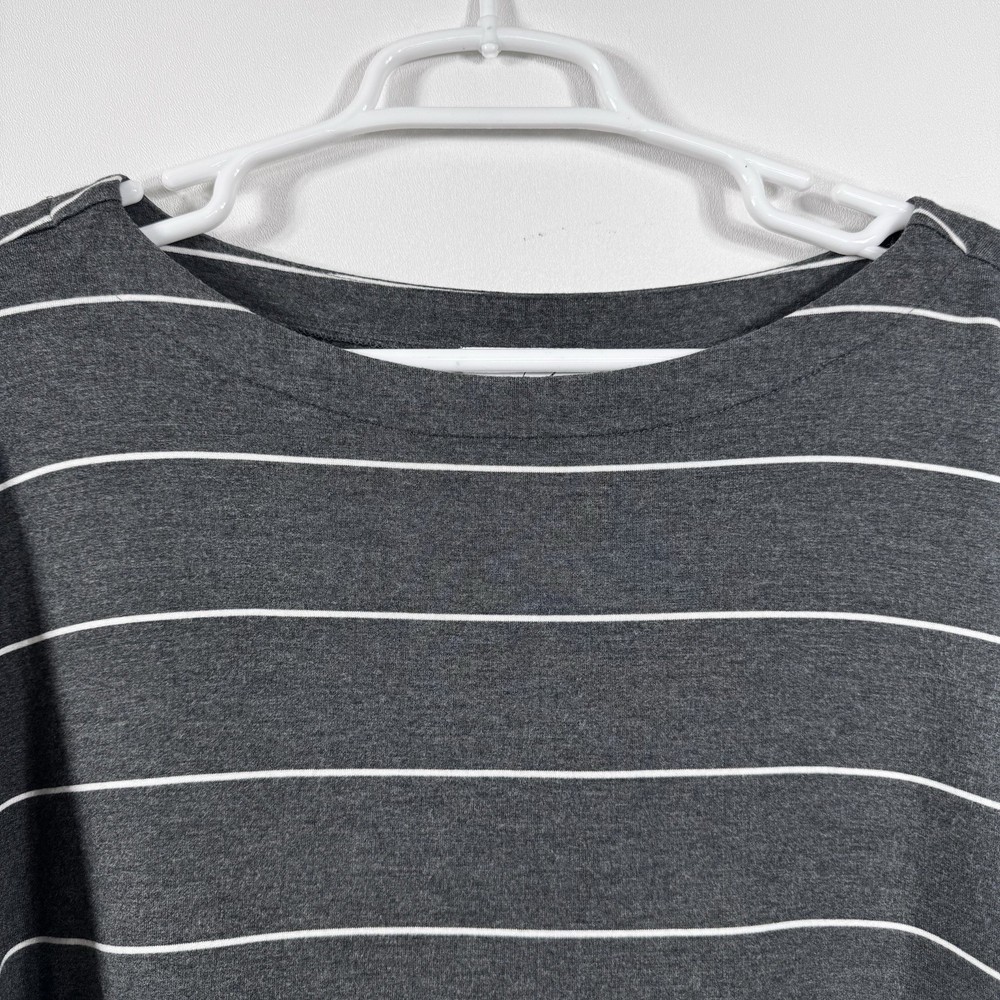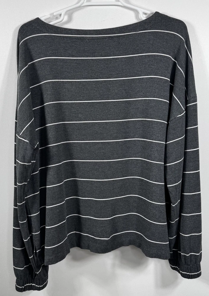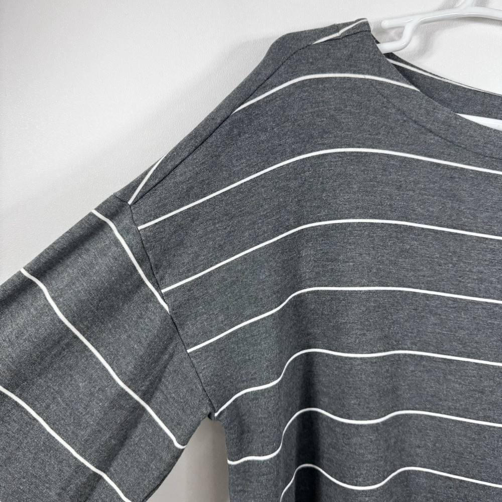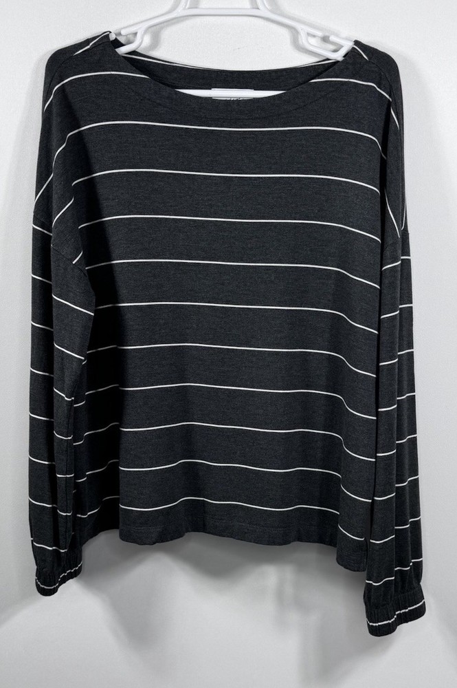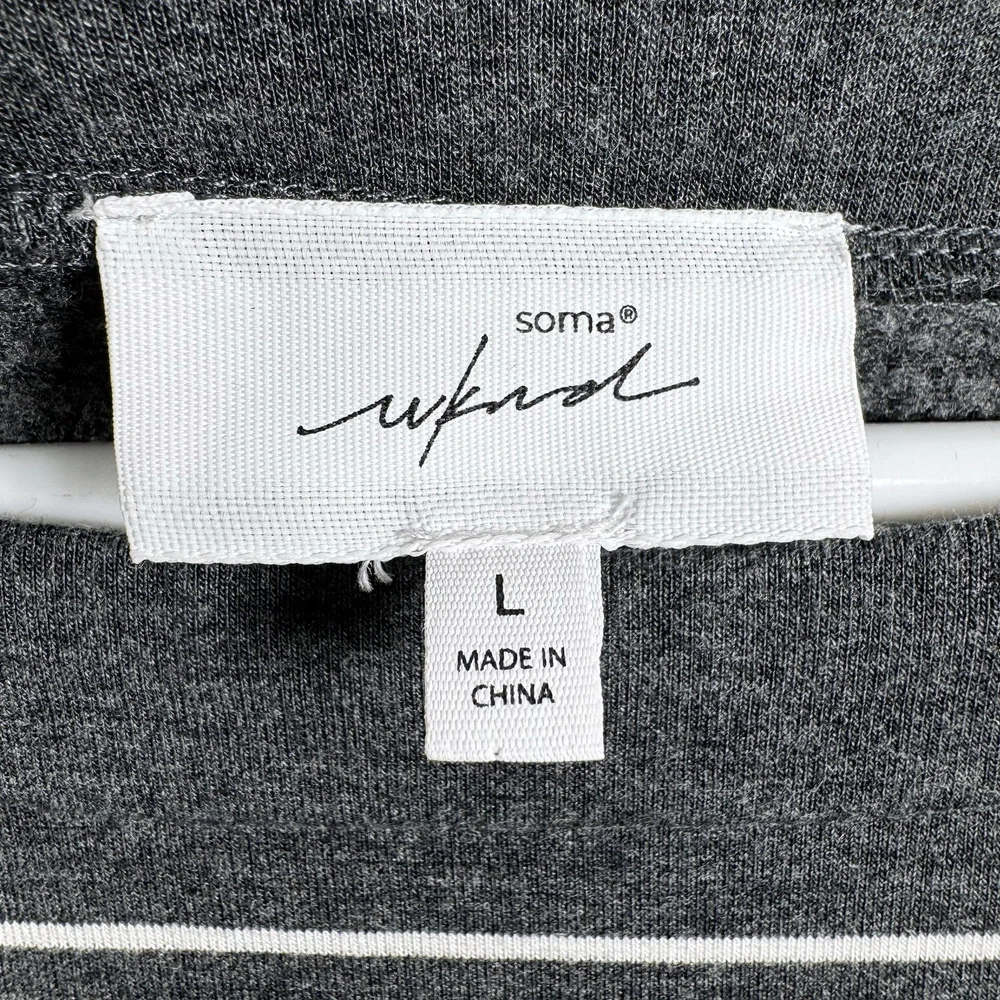 Upgrade your casual wardrobe with this cozy Soma Wknd Lounge Top. The boat neck and long sleeves provide a comfortable fit while the striped pattern adds a touch of style. Made with a combination of spandex and rayon, this sweatshirt is perfect for travel, activewear, or just a casual day out. The pullover closure makes it easy to wear and the stretch feature provides extra comfort. This staple piece is perfect for the winter, fall, and spring seasons. Its neutral color and preppy style make it a versatile addition to any wardrobe. Whether you're running errands in the city or relaxing at home, this Soma sweatshirt is a must-have. Get your hands on this classic piece today! Measurements in photo