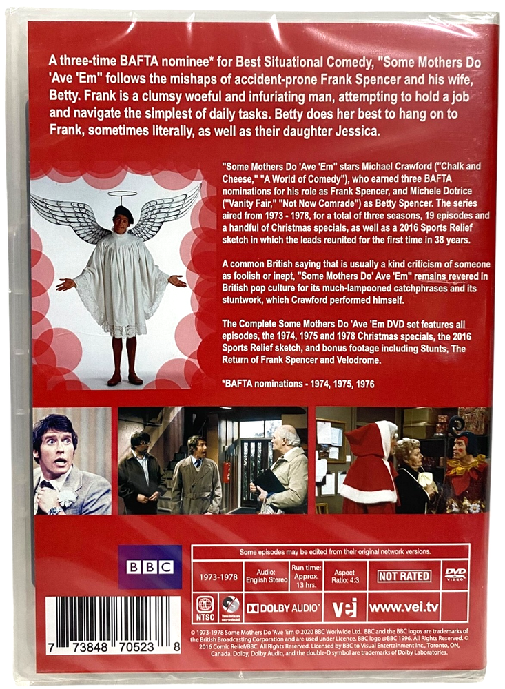 Still brand new, factory sealed! I ship daily Monday to Saturday. Some Mothers Do 'Ave 'Em-The Complete Collection with "Bonus" and Christmas Specials A three-time BAFTA nominee* for Best Situational Comedy, "Some Mothers Do 'Ave 'Em" follows the mishaps of accident-prone Frank Spencer and his wife, Betty. Frank is a clumsy woeful and infuriating man, attempting to hold a job and navigate the simplest of daily tasks. Betty does her best to hang on to Frank, sometimes literally, as well as their daughter Jessica. "Some Mothers Do 'Ave 'Em" stars Michael Crawford ("Chalk and Cheese," "A World of Comedy"), who earned three BAFTA nominations for his role as Frank Spencer, and Michele Dotrice ("Vanity Fair," "Not Now Comrade") as Betty Spencer. The series aired from 1973 - 1978, for a total of three seasons, 19 episodes and a handful of Christmas specials, as well as a 2016 Sports Relief sketch in which the leads reunited for the first time in 38 years. A common British saying that is usually a kind criticism of someone as foolish or inept, "Some Mothers Do' Ave 'Em" remains revered in British pop culture for its much-lampooned catchphrases and its stuntwork, which Crawford performed himself. The Complete Some Mothers Do 'Ave 'Em DVD set features all episodes, the 1974, 1975 and 1978 Christmas specials, the 2016 Sports Relief sketch, and bonus footage including Stunts, The Return of Frank Spencer and Velodrome. *BAFTA nominations - 1974, 1975, 1976