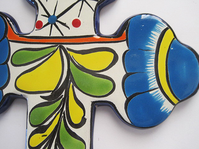 This is a very beautiful handcrafted hand painted Southwestern Design Medium Talavera Cross from Mexico. Cross is 11 1/4 inches tall, 8 3/4 in wide and about 1/4 in thick. Cross is very heavy. Background bright white and mullticolored with colorful flowers design. Hole for attaching hanger or hanging with nail at top Will look great in your southwestern home decor. Made in Mexico Talavera Pottery Talavera was introduced to Mexico by Spanish guild artisans of the Colonial period. Known as "majolica" in Spain, Mexican Talavera draws its name from the 16th century Spanish pottery center, Talavera de la Reina, where imagination and persistence led to enormous strides in the world's knowledge of fine ceramics. Thus, while the intricate polychrome and more typical blue and white designs portray their old world legacy, the indigenous floral and celestial motifs featured on these pages claim the ceramics as classically Mexican. Most of the Talavera pottery offered by La Fuente Imports, including all plates, platters, and place settings, is made by hand in Puebla, Mexico, and is 100% lead-free as well as microwave, oven, and dishwasher safe. The detail is outstanding, and due to the kiln's high firing temperature all our Talavera dishware is also crack and chip resistant Check my listings for other Talavera crosses. large 7 click here to view other great Southwestern pottery designs