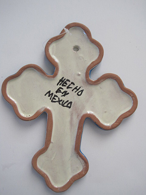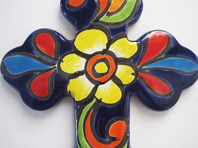 This is a very beautiful handcrafted hand painted Southwestern Design Medium Talavera Cross from Mexico. Cross is 8 1/4 inches tall, 6 3/4 in wide and about 1/4 in thick. Cross is very heavy. Background bright cobalt blue with colorful flowers design. Hole for attaching hanger or hanging with nail at top Will look great in your southwestern home decor. Made in Mexico Talavera Pottery Talavera was introduced to Mexico by Spanish guild artisans of the Colonial period. Known as "majolica" in Spain, Mexican Talavera draws its name from the 16th century Spanish pottery center, Talavera de la Reina, where imagination and persistence led to enormous strides in the world's knowledge of fine ceramics. Thus, while the intricate polychrome and more typical blue and white designs portray their old world legacy, the indigenous floral and celestial motifs featured on these pages claim the ceramics as classically Mexican. Most of the Talavera pottery offered by La Fuente Imports, including all plates, platters, and place settings, is made by hand in Puebla, Mexico, and is 100% lead-free as well as microwave, oven, and dishwasher safe. The detail is outstanding, and due to the kiln's high firing temperature all our Talavera dishware is also crack and chip resistant Check my listings for other Talavera crosses. Med. 3 click here to view other great Southwestern pottery designs