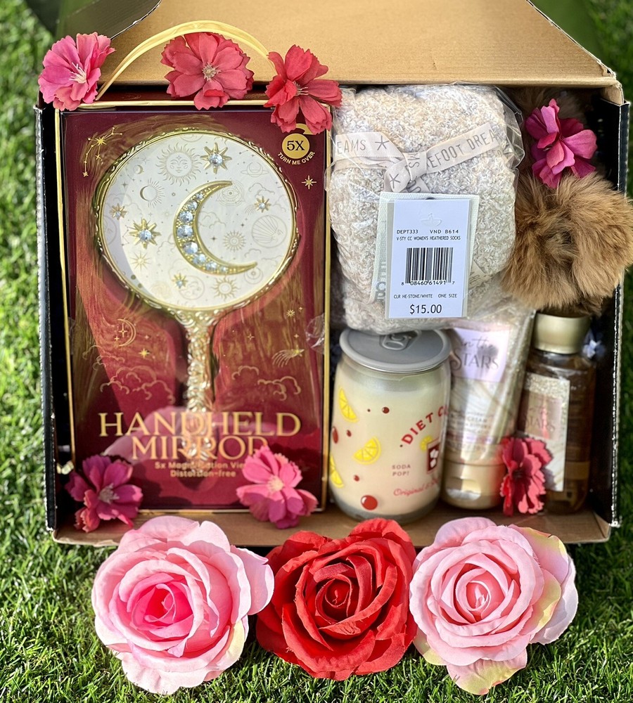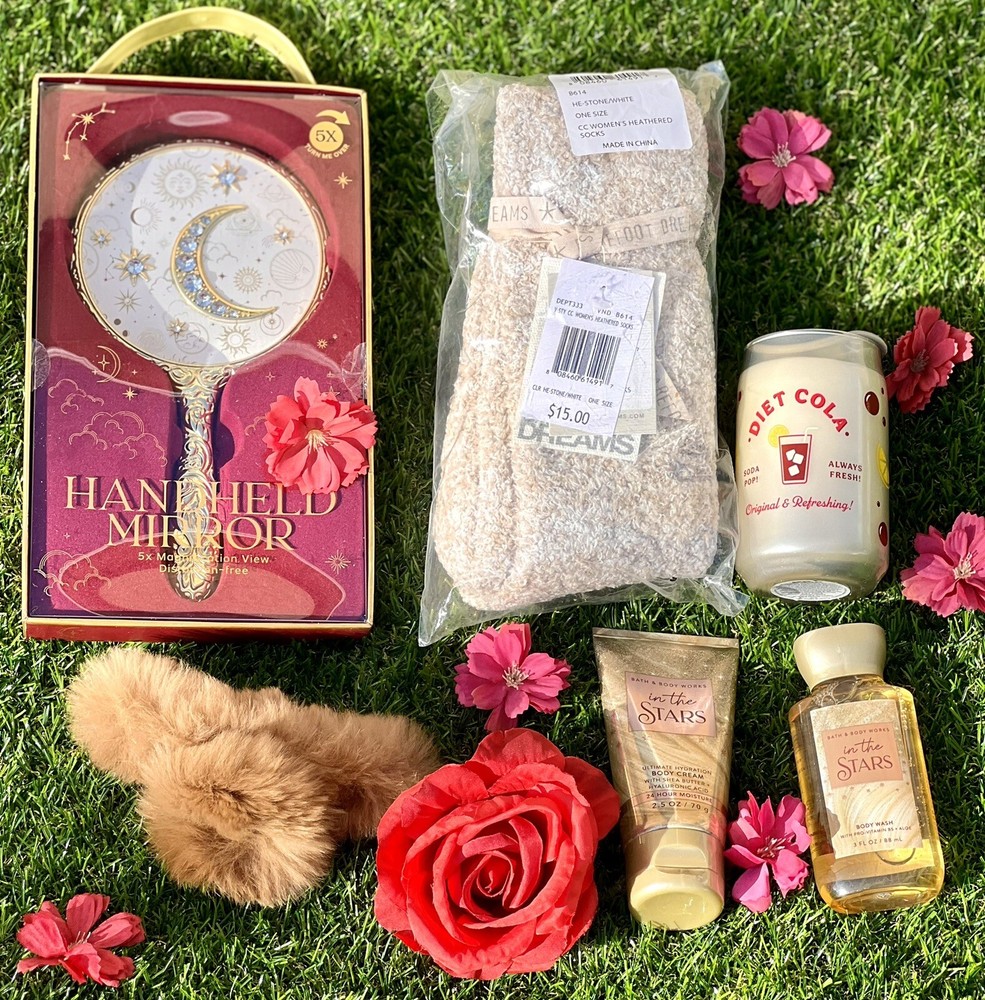 The Spa Exuberation Cozy Gift Box is the perfect way to show someone you care or to treat yourself to some much-needed relaxation. This medium-sized, beige gift box includes six items designed to promote tranquility and self-care. With a delightful Diet Cola theme, it's an encouraging and memorable present for women who appreciate a touch of luxury in their daily routine.Crafted by the brand Cozy, each item within the gift box is selected to provide a sensory experience, helping the recipient to unwind and indulge in moments of peace. Whether it's for a birthday, anniversary, or just because, this packaged gift is an excellent choice for anyone looking to offer a dose of relaxation and pampering Into The Stars Bath & Body Works Body Wash & Cream Fur Hair Claw Bare Foot Cozy socks Diet Cola - Vanilla Scented Candle Hand Held Mirror 8"in