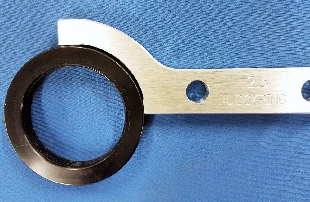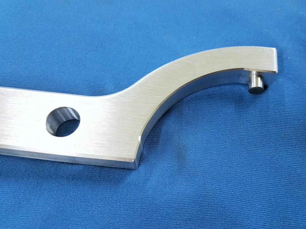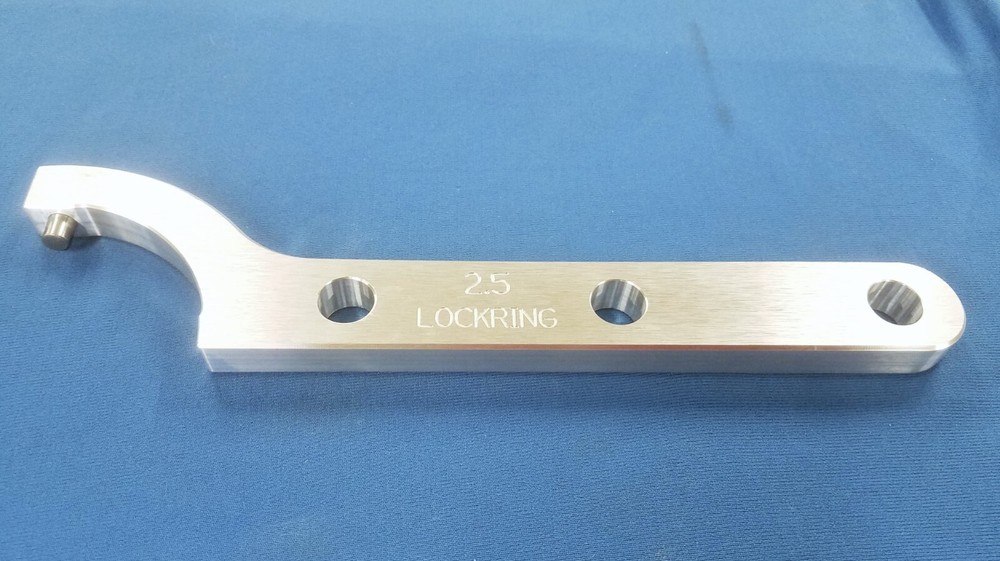 This is made in U S A by WCM!!! This auction is for a 6061 aluminum CNC machined spanner wrench for adjusting the smaller (backup/lockring) collar for a 2.5" shock. The collar should look just like the one pictured with the holes in it. This is a clone of fox part number 803-00-733 and will fit anything it will fit The wrench features a hardened pin and contoured corners so its nice on your hands. This is uncoated. This item is built strong, I put 150 pounds against the wrench and it had no problem with it. The auction is for the tool only, the shock or collar is not included in the auction