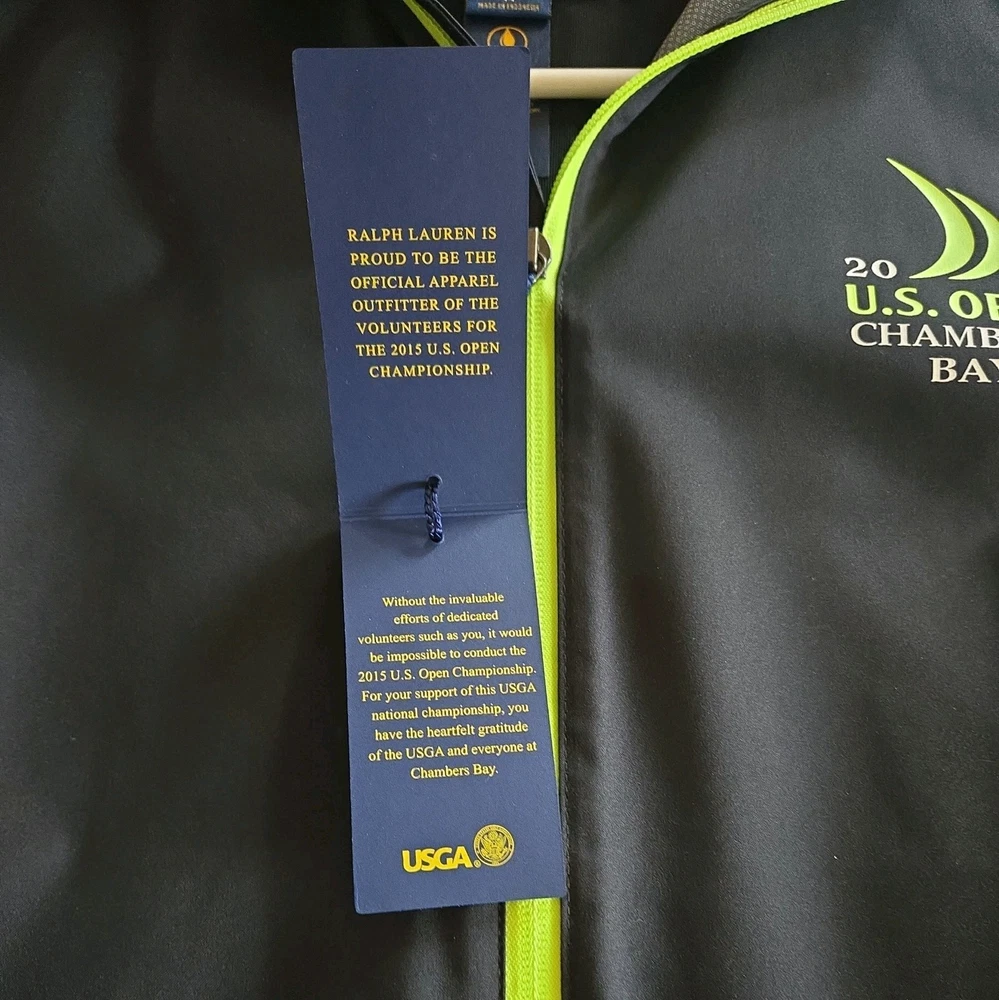 This NWT Golf course SWAG black Ralph Lauren Polo Golf jacket is a VINTAGE piece from the 2015 US Open collection, making it a unique find for golf enthusiasts. The jacket is made of wind-resistant softshell fabric with polyester insulation, perfect for spring weather on the golf course. It features a full zip closure, zipped pockets, and a windproof design, offering both functionality and style. This lightweight and breathable jacket is water-resistant and quick-drying, making it ideal for all-season wear during golfing activities. Perfect for casual or activewear, this jacket combines performance and a sporty aesthetic for a stylish addition to any golfer's wardrobe.