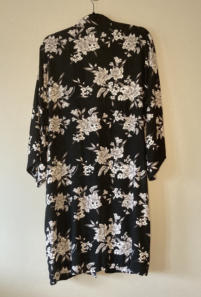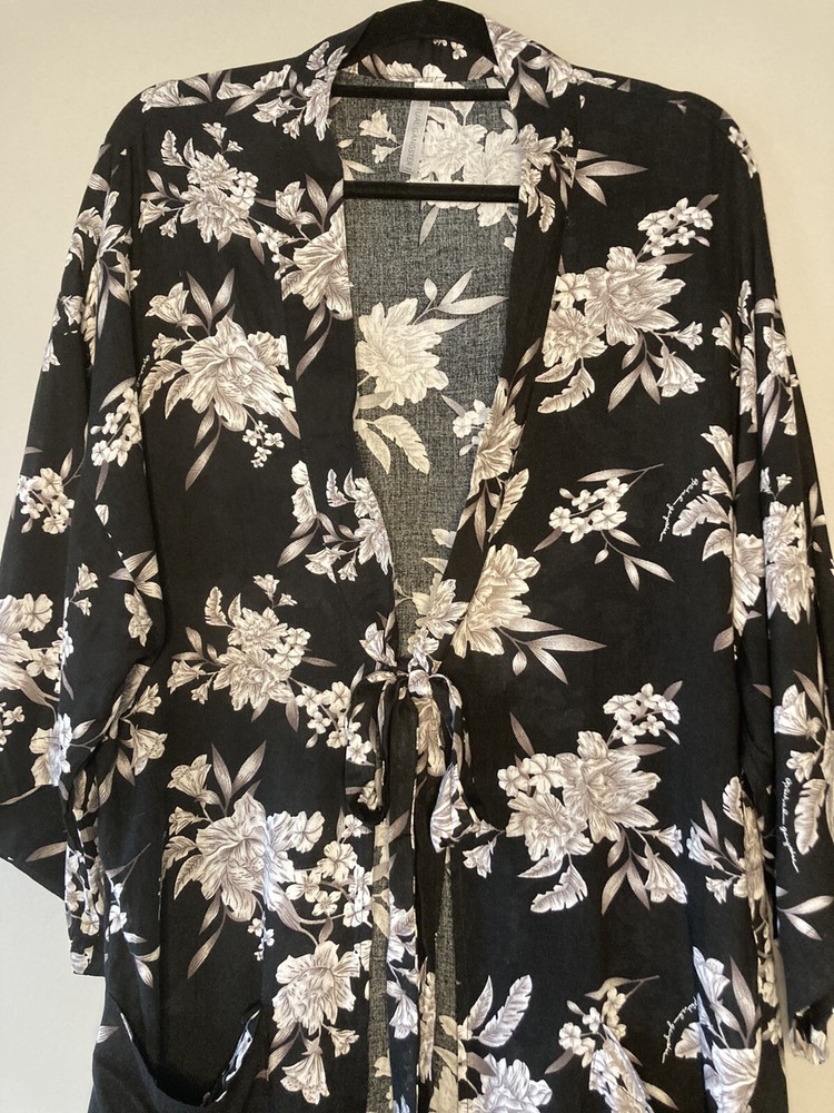 This kimono robe is so cozy and stylish—perfect for lounging or throwing on after a shower. The fabric is soft, the fit is relaxed, and the pockets are super handy. Love the tie-front design for an adjustable fit. Great condition, no flaws at all. Feels luxurious without being heavy. Definitely a must-have for chill days!