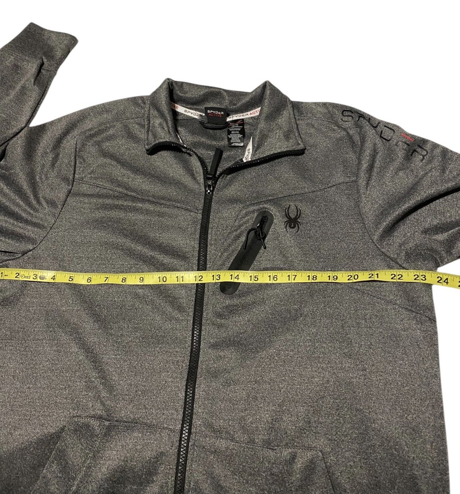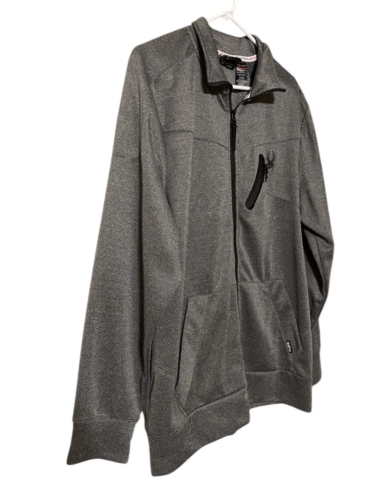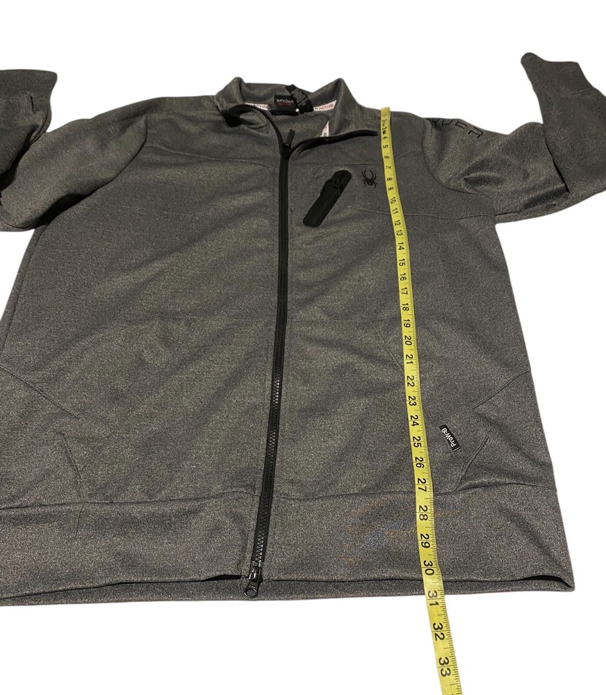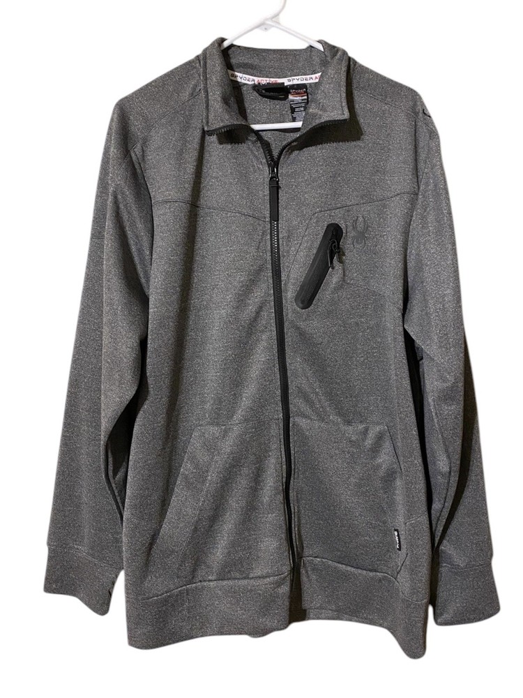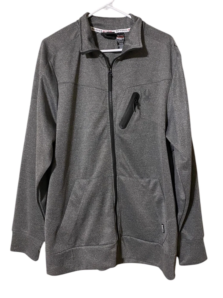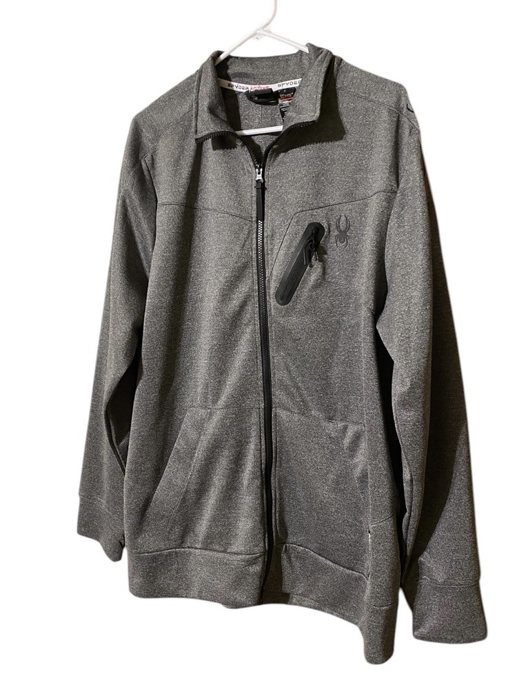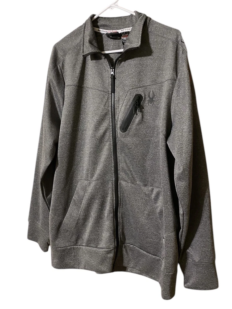 This Spyder Active Sweatshirt Jacket is designed for men in size XL. It features a full zip closure for easy wear and has a cozy gray polyester material for comfort. The jacket showcases the Spyder logo as an accent and includes pockets for added functionality. The long sleeve design and regular fit make it suitable for winter, fall, and spring seasons, providing both style and practicality for everyday wear.